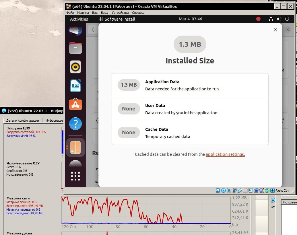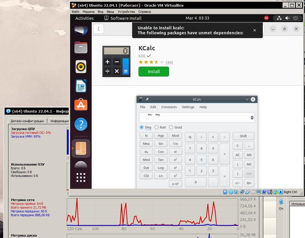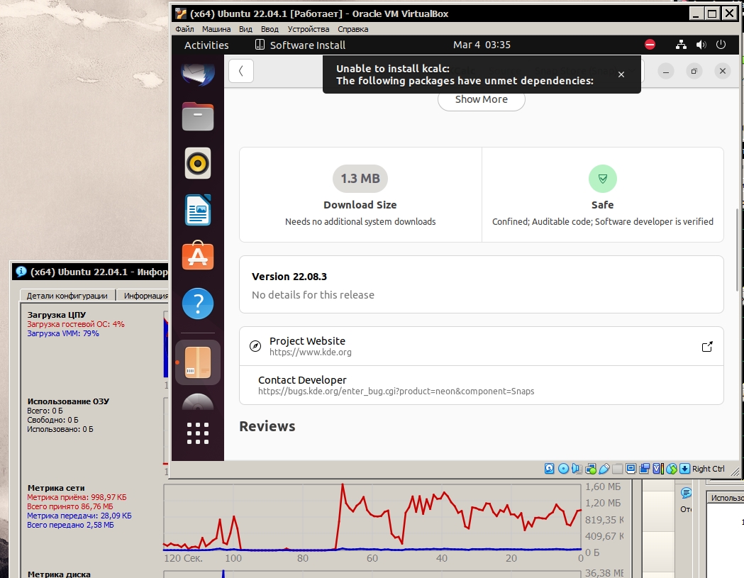Но установка как-то затянулась, пользователь начинает подозревать неладное и приходит в недоумение, как так, всего пара мегабайт, а установка затянулась на десятки минут... Тут и приходит осознание что линуксы где-то нагло наврали, особенно если посмотреть на сетевую активность во время установки приложения, там отчетливо видно что для установки калькулятора было загружено более 450 МБ трафика из интернета, да, это всё зависимости ради калькулятора официальный размер которого всего 1.3 мегабайта: