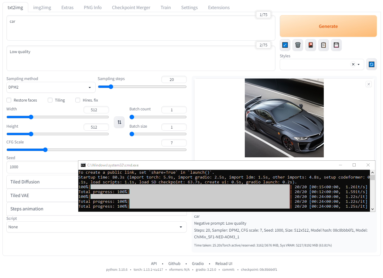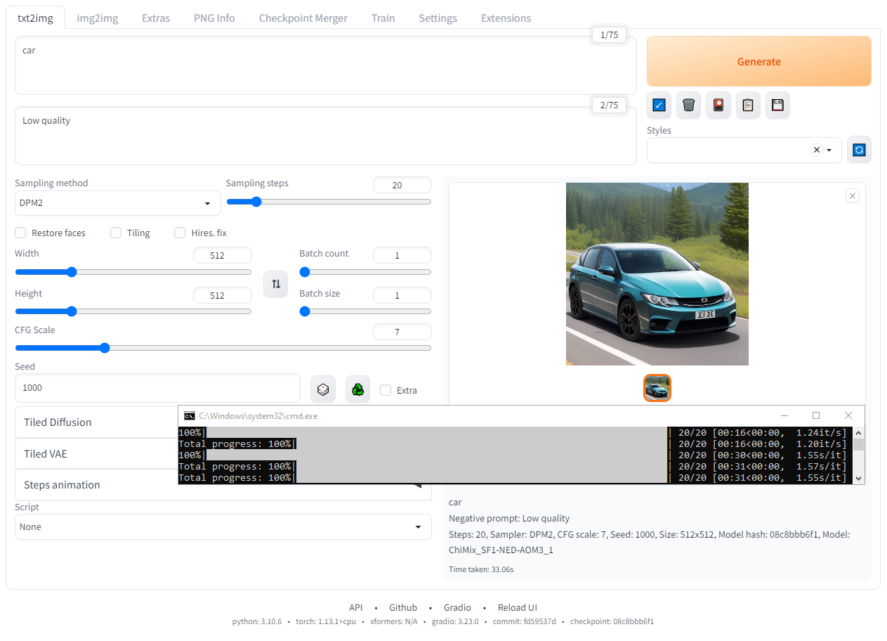 Чтобы изображение было определенным я ввел в поле Promt слово "car", а в поле Negative promt ввёл "Low quality", сэмплер сменил на DPM2, а "зерно" установил на значении 1000, на этом всё.