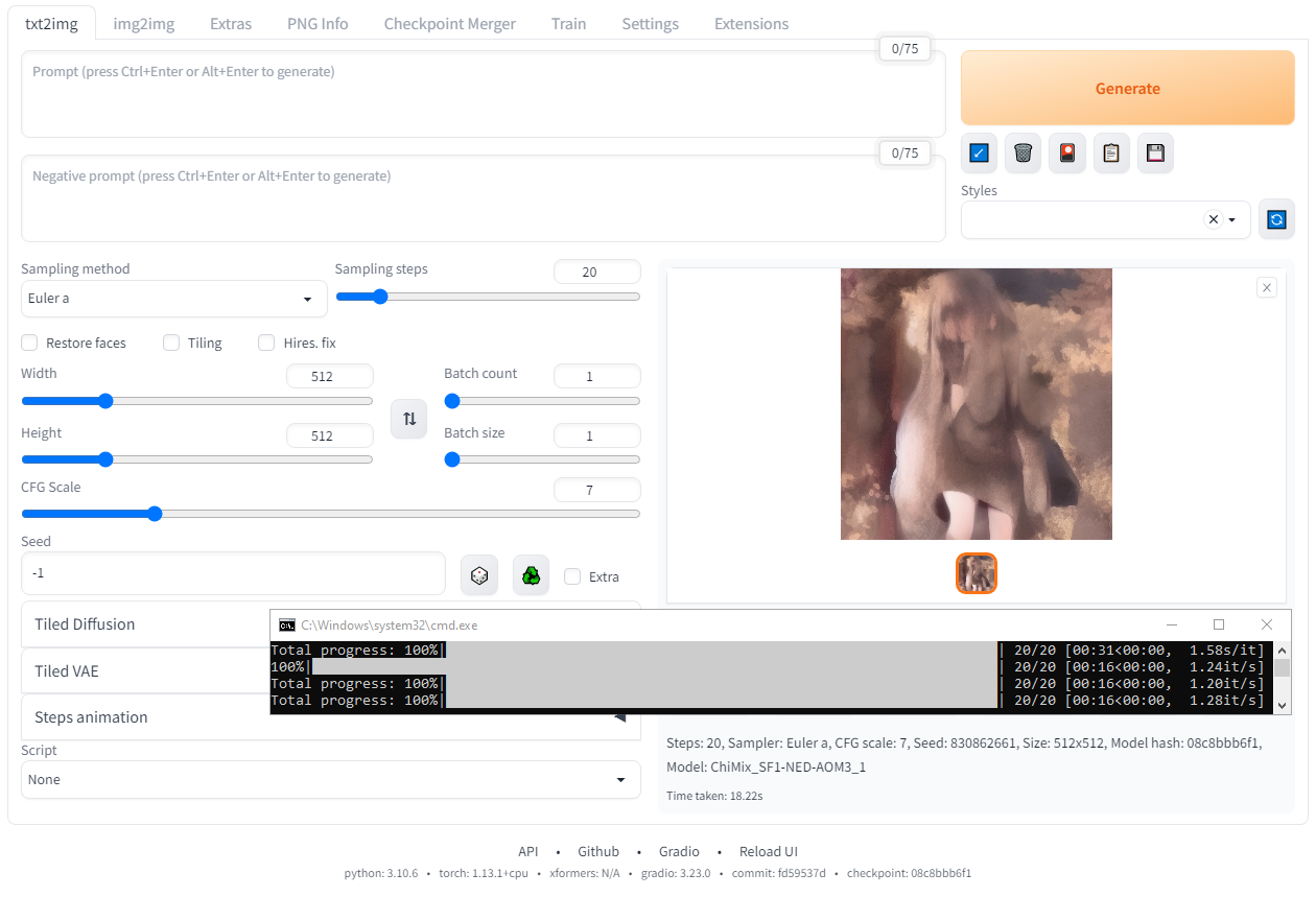 Искать скорость генерации буду в консоли, справа написано сколько итераций в секунду (it/s), или секунд потрачено на итерацию (s/it), но это невероятно сложно для восприятия и сравнения когда величина измерения постоянно "плавает" из одной крайности в другую, разработчики, зачем вы такую дичь творите? Потому я буду смотреть время затраченное на генерацию, оно указано в последней строчке, всего 31 секунда, это примерно 1.55 секунд на итерацию, или 0.645 итераций в секунду: