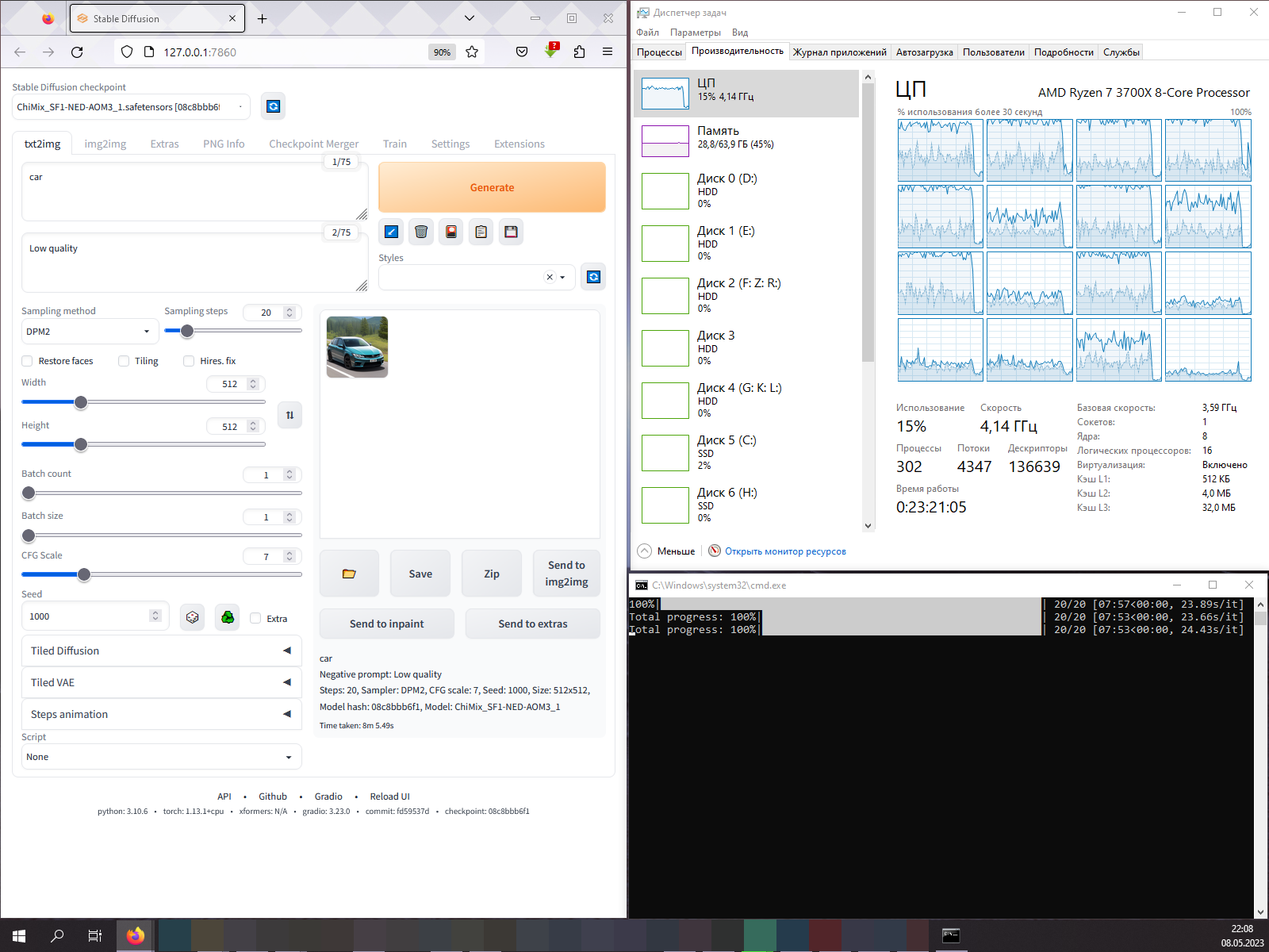 Процессоры конечно же не способны конкурировать в плане скорости с видеокартами, тем не менее у ЦП есть преимущество, у ЦП есть очень много памяти, и вполне спокойно может сгенерировать изображение в размере 2048x2048, очень медленно конечно, но может. Кстати, я уже говорил про зависимость от скорости работы с ОЗУ, так вот, я видел у Ryzen 7 5800X3D скорость генерации примерно ~8 секунд на итерацию при сэмплере "euler a", что выходит ~0.125 IT/s, а это уже всего в ~10 раз медленнее GTX 1070. Я не добавлял R7 5800X3D в сравнение ибо это было просто моё наблюдение без фиксации результатов.