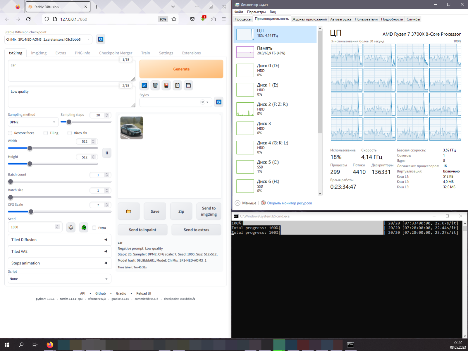 Ради интереса были ещё проведены тесты с R7 3700X при полной загрузке всех потоков, в Python файле devices.py (папка modules) можно задать количество используемых потоков для работы, и для R7 3700X было указано 16 потоков при проведении дополнительного теста.