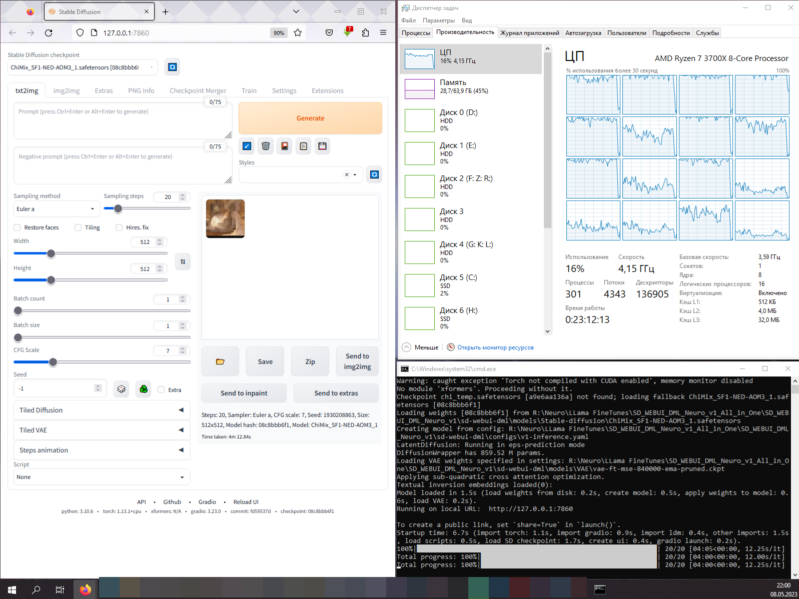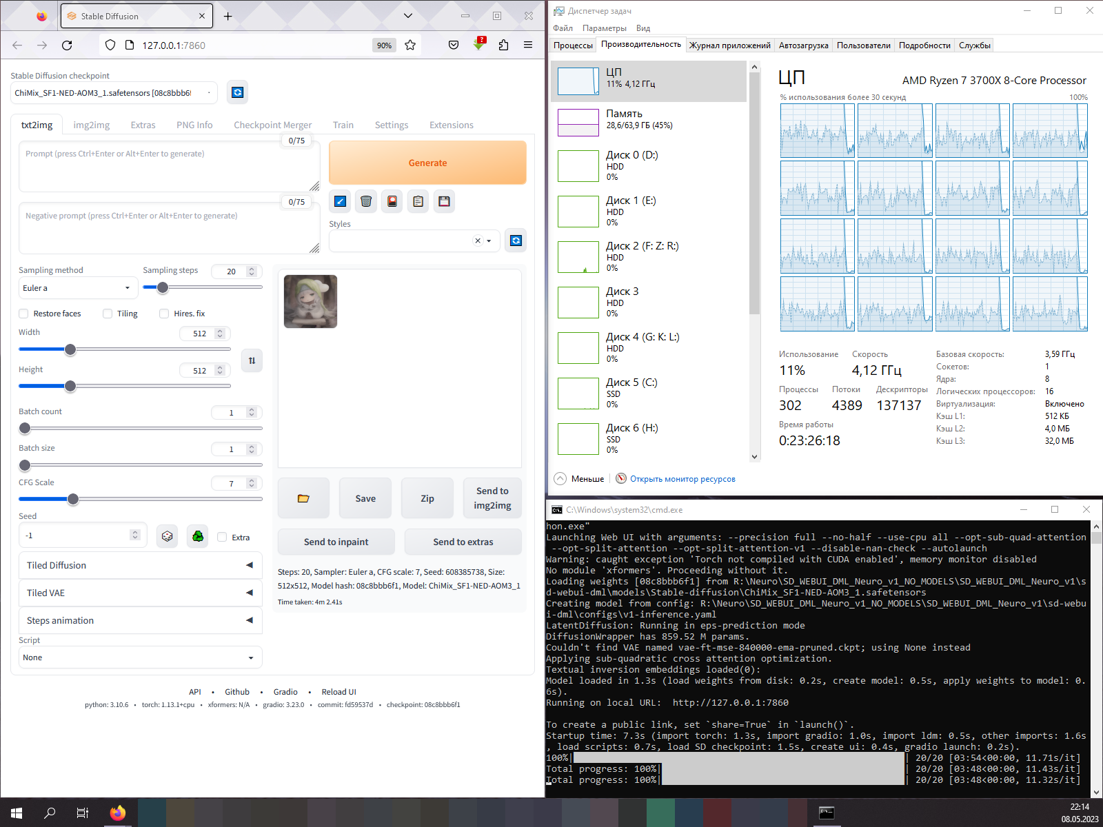 Начну со сборки Stable Diffusion web UI DirectML Neuro, первый запуск с флешки занял больше минуты, это так долго загружалась модель весом 2 ГБ, но второй запуск уже происходит за считанные секунды, все благодаря кэшу в оперативной памяти (standby list), впрочем, статья не про нюансы работы операционной системы, так что не будем заострять особое внимание на таких "мелочах".