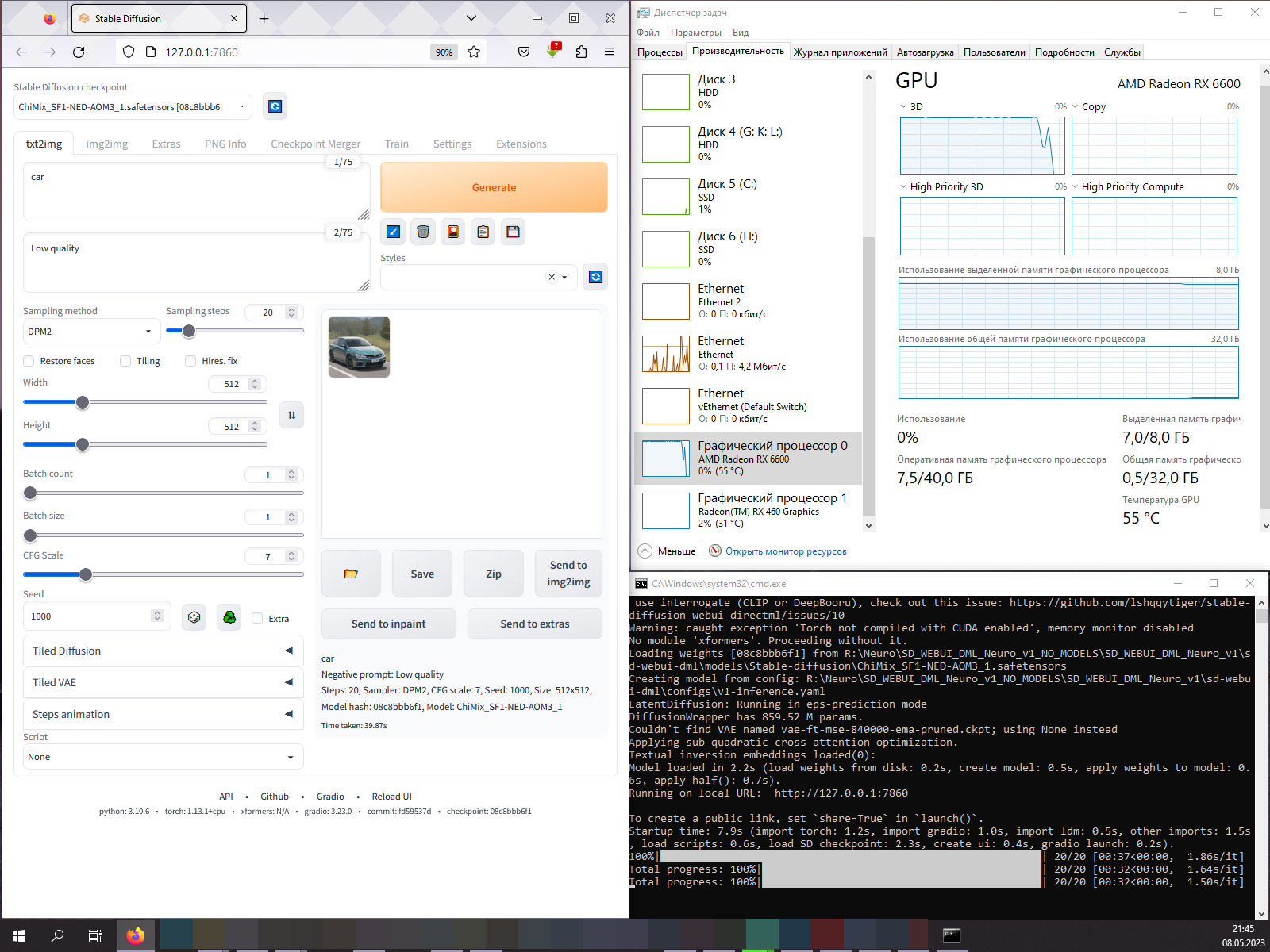В общем при стандартных настройках (сэмплер Euler A) Radeon RX 6600 сильно уступает GeForce GTX 1070, но вот при сэмплере DPM2 видеокарты практически на равных встали, похоже мне следовало проверить производительность со всеми сэмплерами, но увы, как-нибудь в другой раз уже...