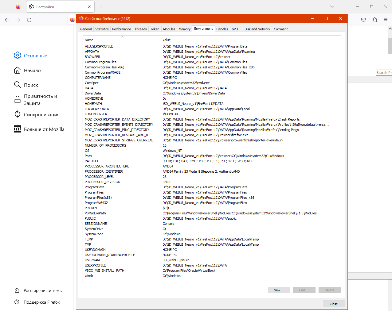 Хм, раз уж решил заглянуть поглубже, то надо бы проверить кое-что, вдруг браузер запустил свои щупальца в систему пользователя? И в целом да, всё отлично, даже имя пользователя указано как надо, щупальцы зависимостей подрезаны достаточно неплохо, нужно только COMPUTERNAME ещё переопределить, так, на всякий случай: