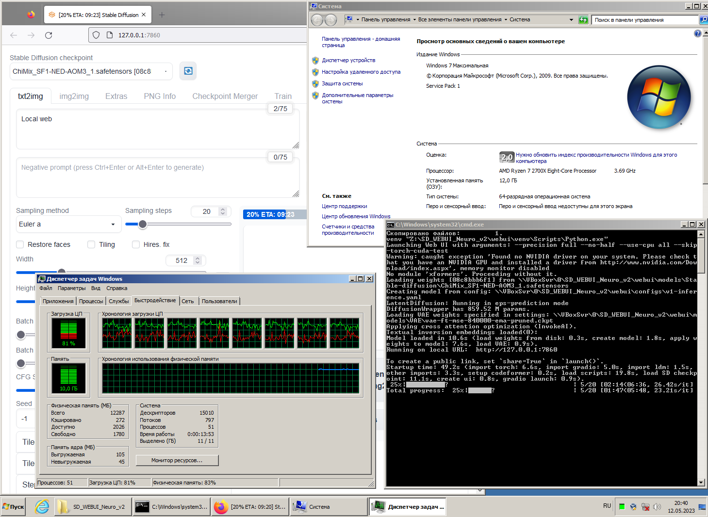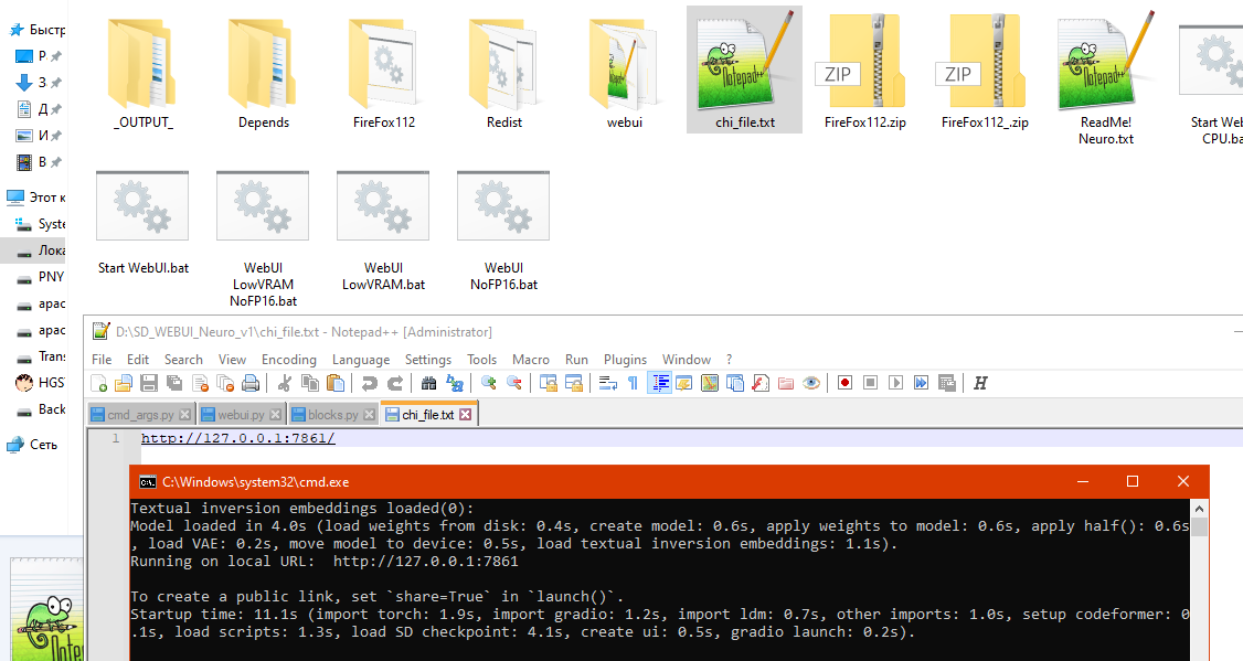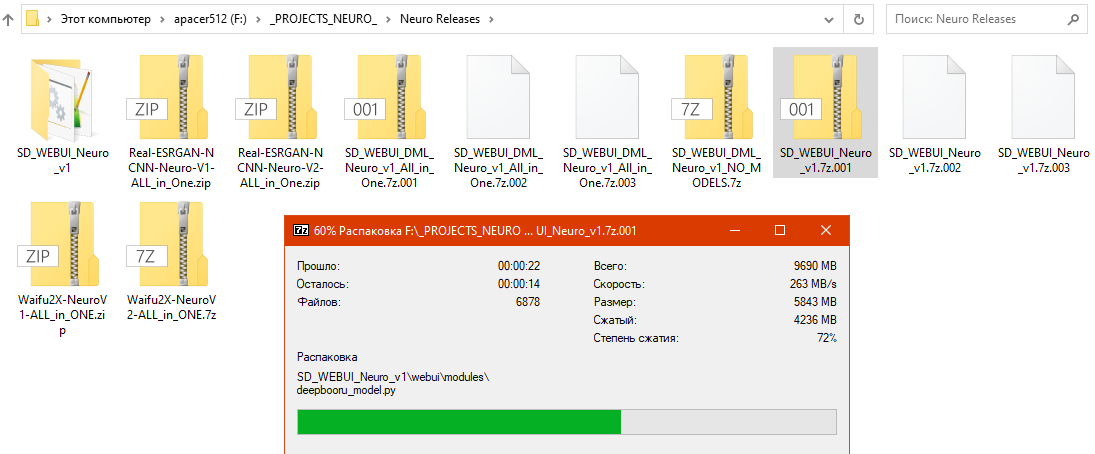 Пожалуй с тестами хватит, сборка работает, явных проблем я не выявил, а значит можно паковать и загружать в GitHub, мучительно и долго через мобильный интернет... К слову, первая версия сборки была доступна только в варианте "всё в одном", но сейчас я загружу и вариант "NO_MODELS", что будет полезно людям которые предпочитают сами устанавливать нужные модели.