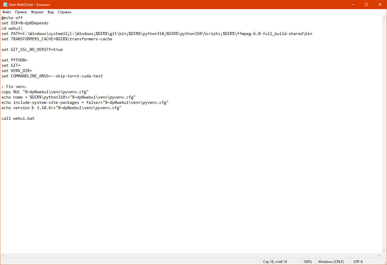 Теперь время обратить внимание на BAT файлы для запуска SD WebUI, было решено убрать код отвечающий за автоматический выбор cudart библиотеки в зависимости от операционной системы, вообще я думал сделать файл с настройками и там указать текущую используемую версию, но это бессмысленно усложнит всё.