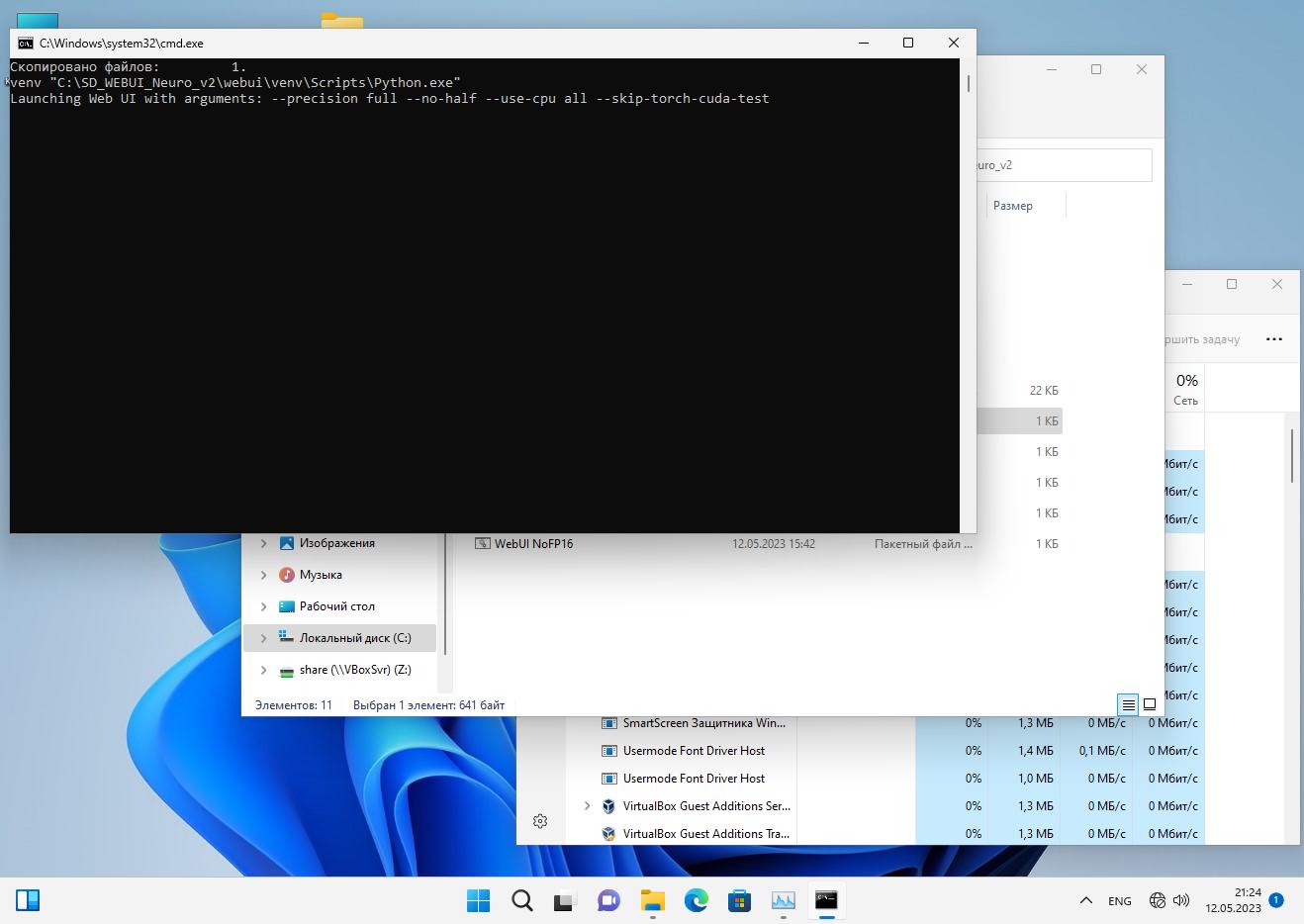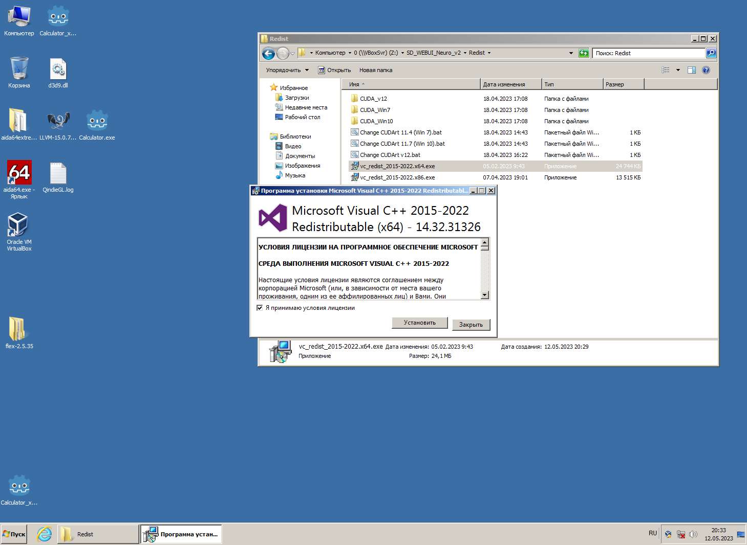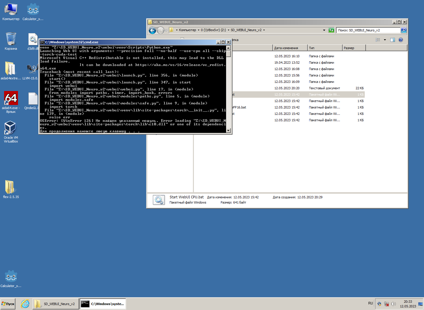 Чтобы подлить масла в огонь я буду запускать сборку SD WebUI Neuro через общую сетевую папку, но с отключенным интернетом в виртуальной машине, да, я не буду копировать сборку в виртуальную машину ибо это накладно по занимаемому месту на диске... Первый запуск, упс, ругань на отсутствующий VC Redist, ничего страшного, в комплекте со сборкой есть установочный файл, достаточно оказалось установить только x64 версию VC Redist: