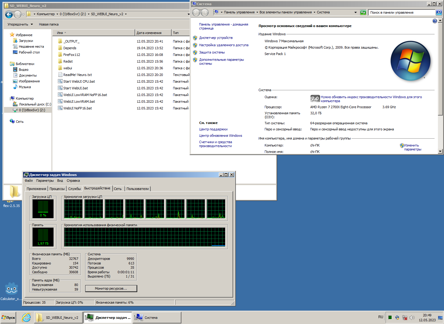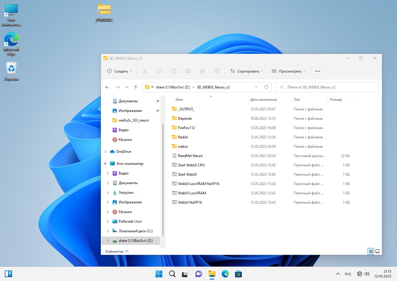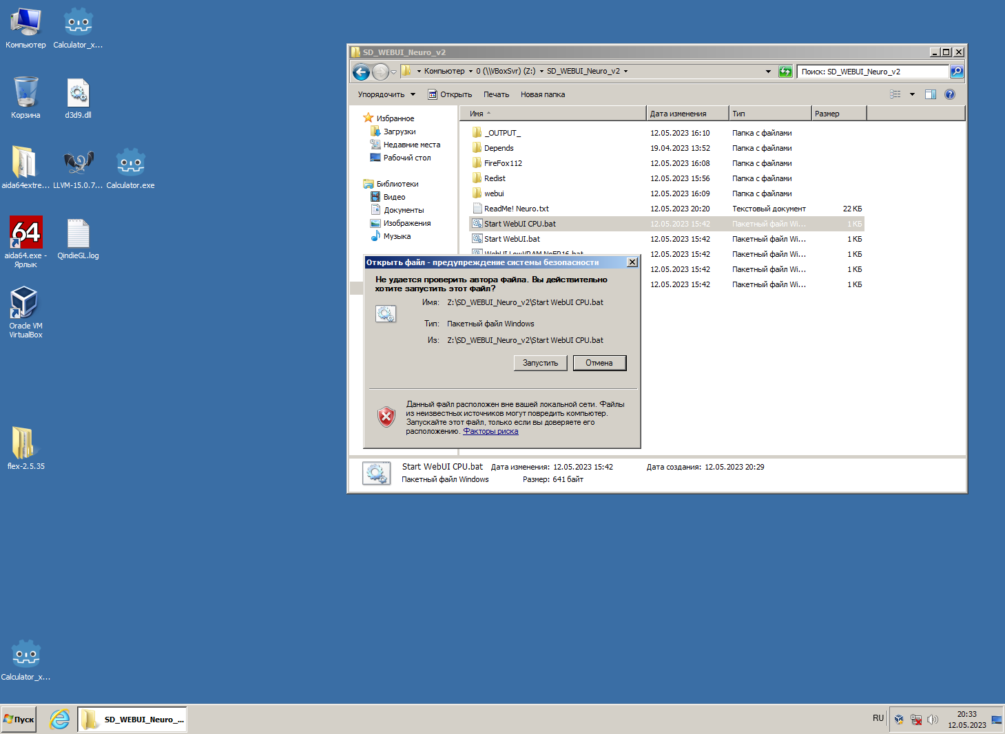 Чтобы подлить масла в огонь я буду запускать сборку SD WebUI Neuro через общую сетевую папку, но с отключенным интернетом в виртуальной машине, да, я не буду копировать сборку в виртуальную машину ибо это накладно по занимаемому месту на диске... Первый запуск, упс, ругань на отсутствующий VC Redist, ничего страшного, в комплекте со сборкой есть установочный файл, достаточно оказалось установить только x64 версию VC Redist: