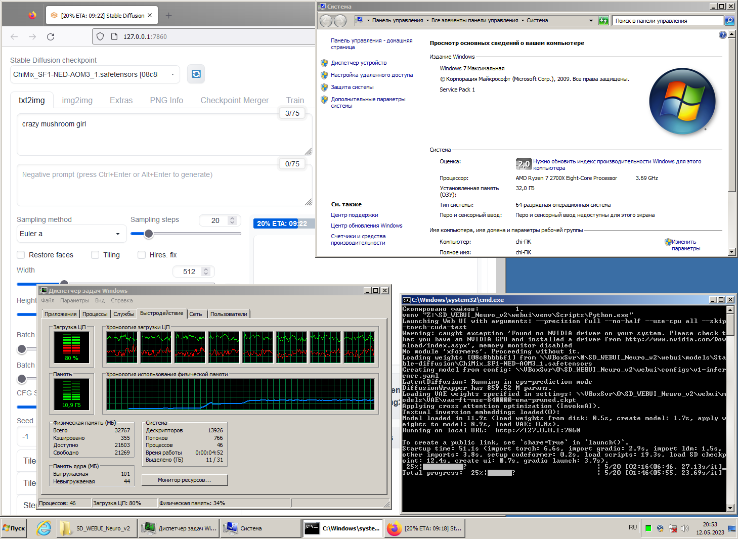 С одной стороны пользователь может запустить хоть десяток Stable Diffusion одновременно, только вот хватит ли у обычного пользователя памяти на это? Я запустил всего один экземпляр CUDA GPU и два экземпляра CPU, а у меня уже почти 30 ГБ ОЗУ занято: