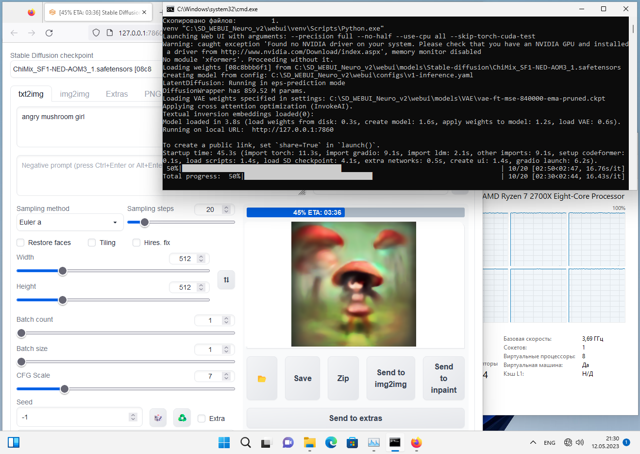Ладно, фреймворки установлены, запускаю сборку и она прекрасно запустилась! А ещё 12 ГБ памяти оказалось слишком мало, да и в виртуальной машине нет видеокарты, потому я использую ЦП для генерации: