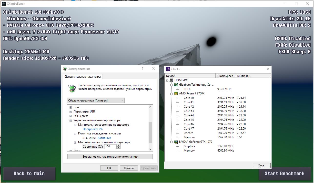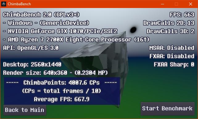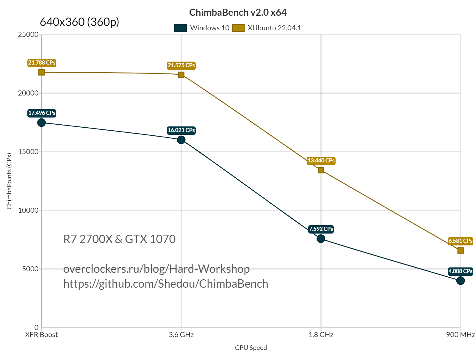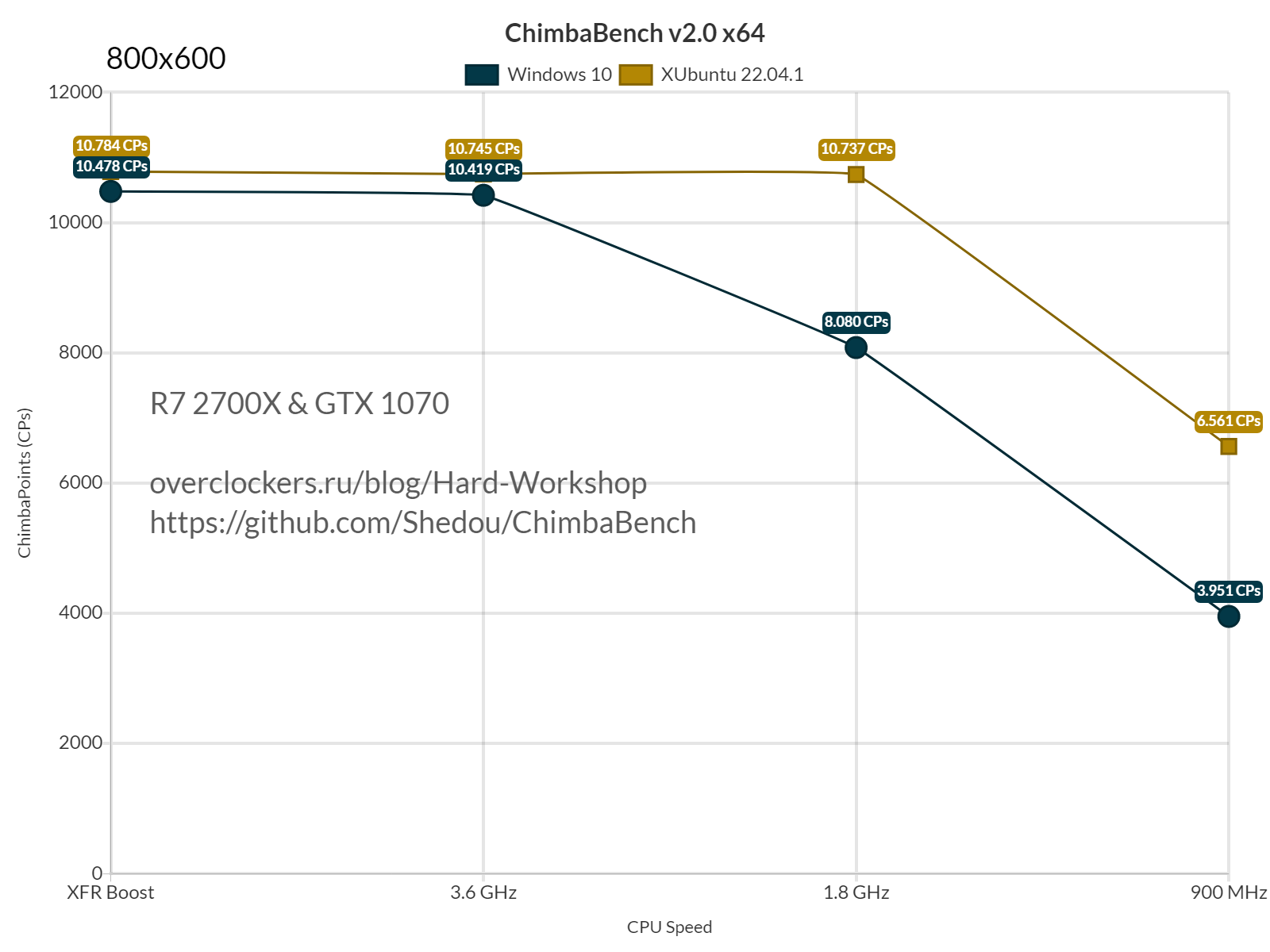 По итогу я собрал результаты в среде Windows 10 с активным XFR Boost у процессора Ryzen 7 2700X, сначала в разрешении 640x360, потом 800x600, и в конце 1280x720, MSAA естественно отключен, так же соберу результаты и в XUbuntu 22.04.1, а там уже отключу XFR у ЦП и буду понижать частоту.