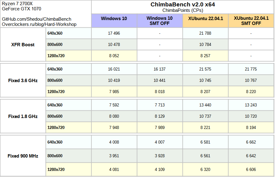 Результаты собраны, в таблицу вписаны, и пока не особо наглядно это дело получилось, но уже можно заметить очень примечательный факт, производительности GTX 1070 явно было недостаточно чтобы R7 2700X стал бутылочным горлышком при минимальном разрешении 640x360 работая в XUbuntu, ибо дополнительные ~600 МГц от XFR Boost не повысили заметно результат: