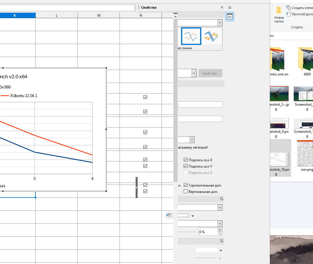 Тут должны были быть нормальные графики по отдельным результатам, но Open Source как всегда кривой... Я попытался сделать графики прямо в Libre Office, и у меня даже почти получилось, но господи, названия по оси X изменить невозможно, просто идёт нумерация 1, 2, 3, 4, а мне нужно туда вписать частоту процессора, где-то в интернете видел что через пляски с бубном можно переименовать значения по оси X, но у меня не получилось правильно поплясать чтобы сработало: