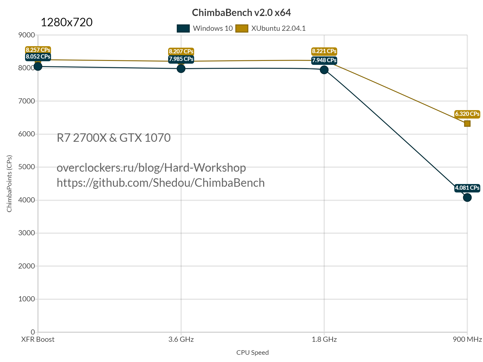 При разрешении 1280x720 упор в видеокарту происходит даже когда Ryzen 7 2700X работал на частоте ядер 1.8 ГГц, и даже при частоте ядер всего 900 МГц производительность снизилась незначительно в среде Linux, чего не сказать про Windows.