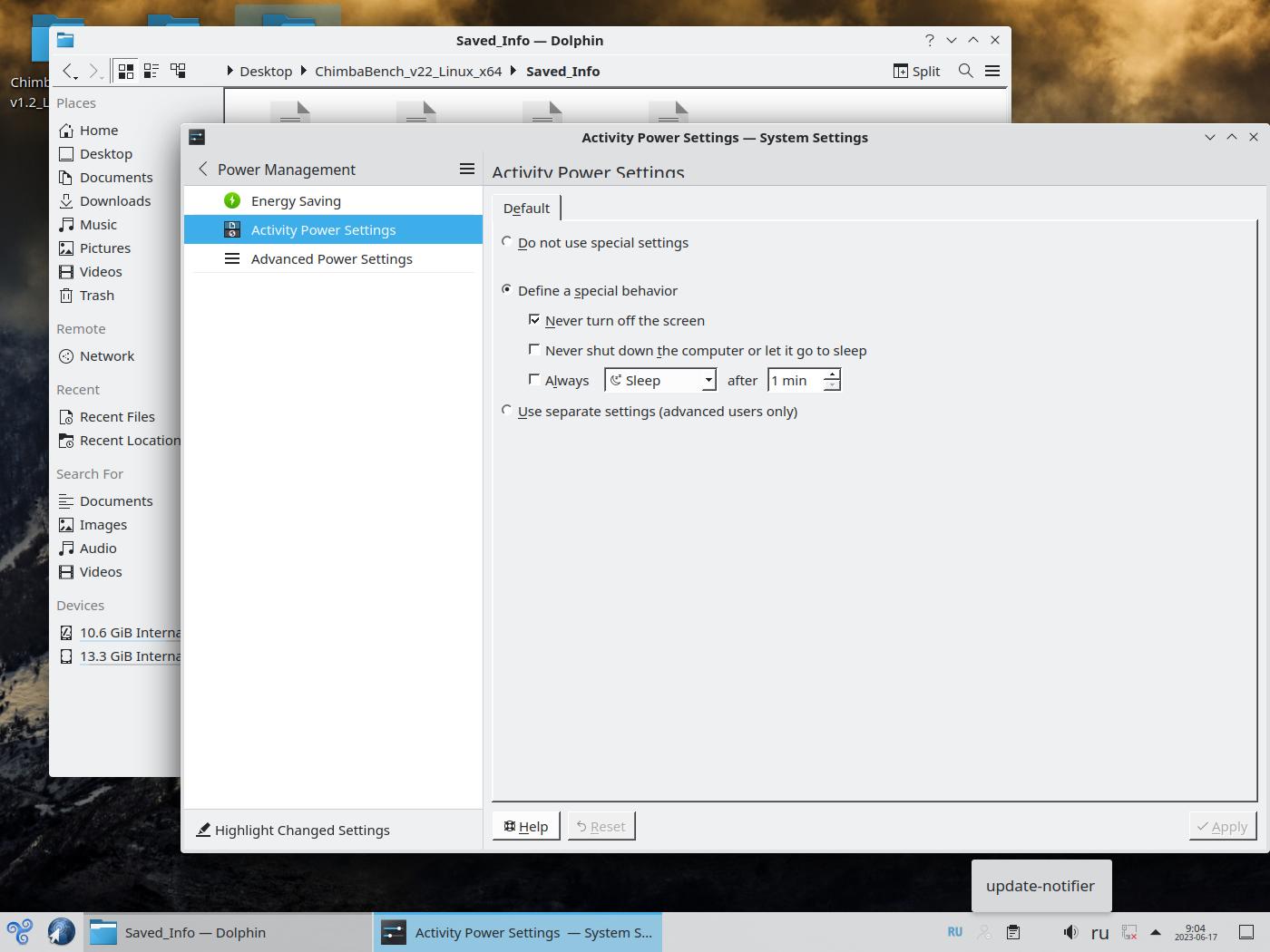 А вот дальше я отлучился на некоторое время, но вернувшись экран дистрибутива оказался заблокирован, хотя отключал блокировку экрана при отсутствии активности, ох уж эти линуксы... Конечно проблему с блокировкой экрана исправил расковыряв изначально спрятанные настройки, но это не самое интересное, что произошло.