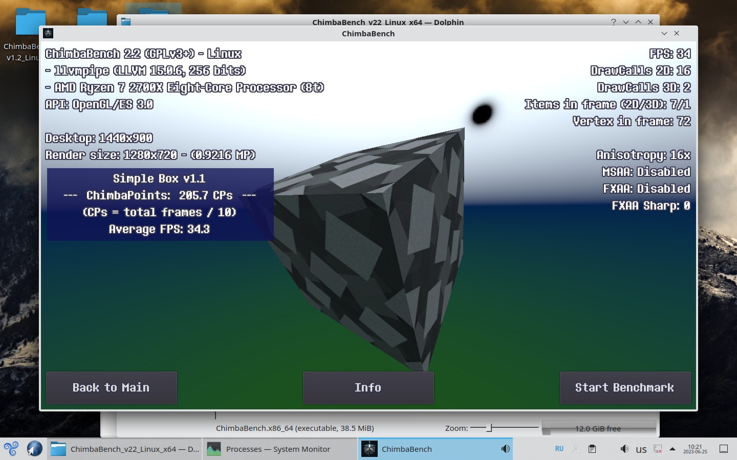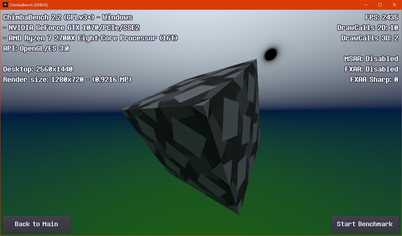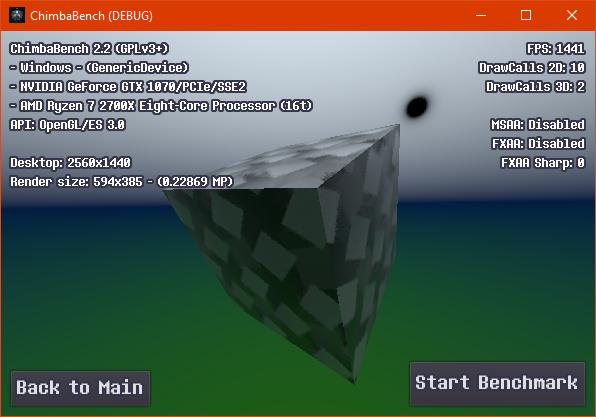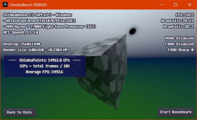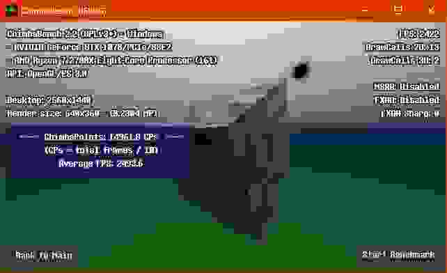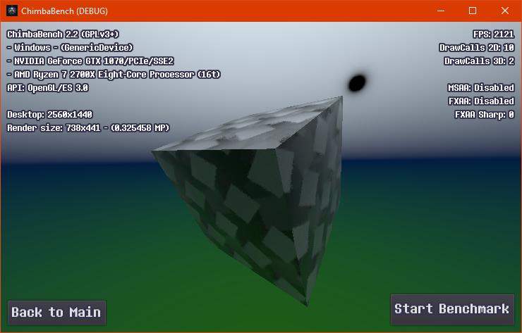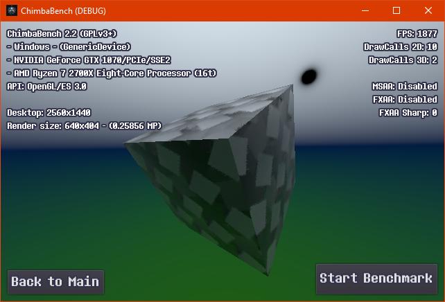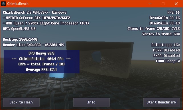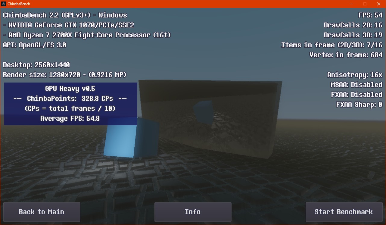 Впрочем, думаю пора на этом завершать ChimbaBench версии 2.2, новая сцена конечно "вышла" на сцену, но пока только в зачаточном состоянии, хотя уже в текущем состоянии новый тест GPU Heavy настолько тяжёлый, что Ryzen 7 2700X в виртуальной машине через LLVM уже не способен даже один кадр в минуту выдать, так что да, без видеокарты тест GPU Heavy нет смысла запускать: