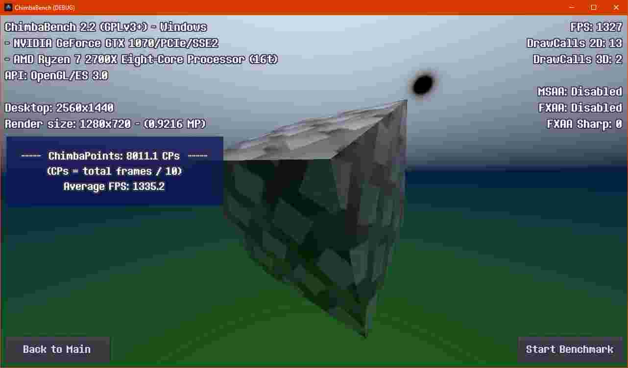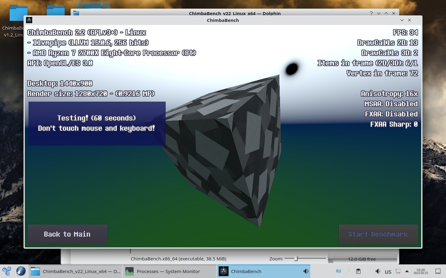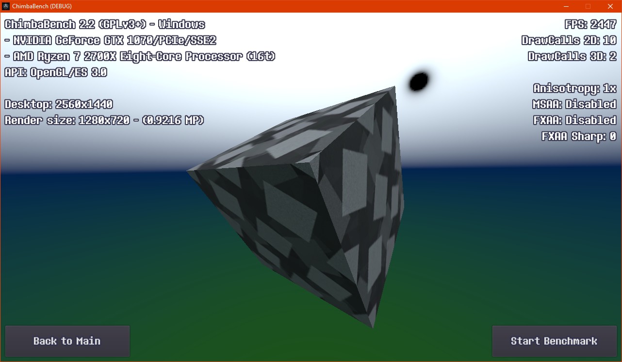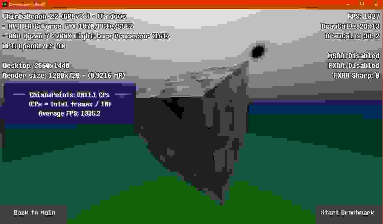 Впрочем, думаю пора на этом завершать ChimbaBench версии 2.2, новая сцена конечно "вышла" на сцену, но пока только в зачаточном состоянии, хотя уже в текущем состоянии новый тест GPU Heavy настолько тяжёлый, что Ryzen 7 2700X в виртуальной машине через LLVM уже не способен даже один кадр в минуту выдать, так что да, без видеокарты тест GPU Heavy нет смысла запускать: