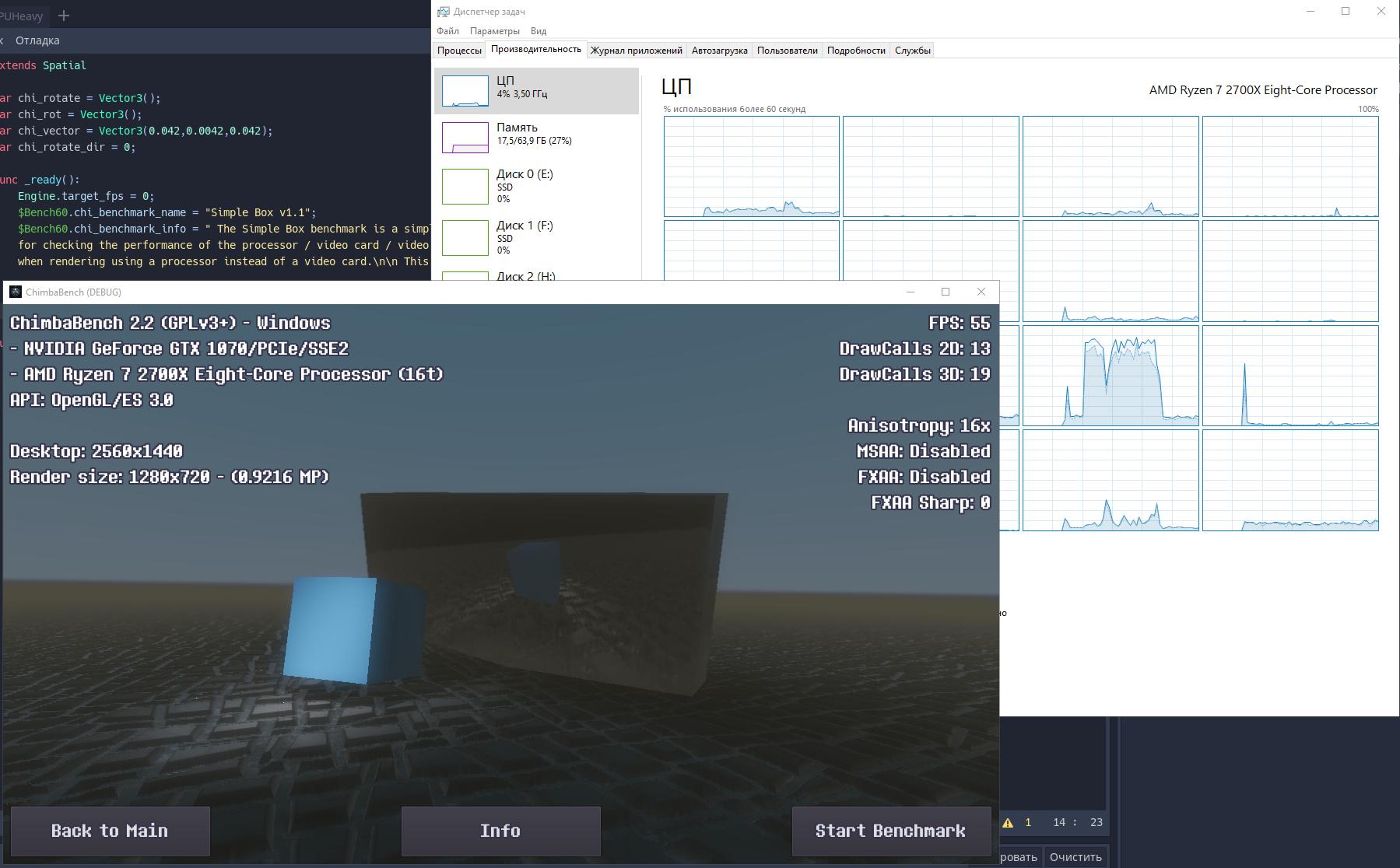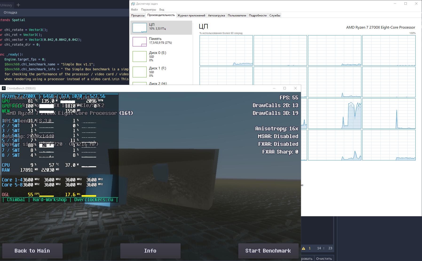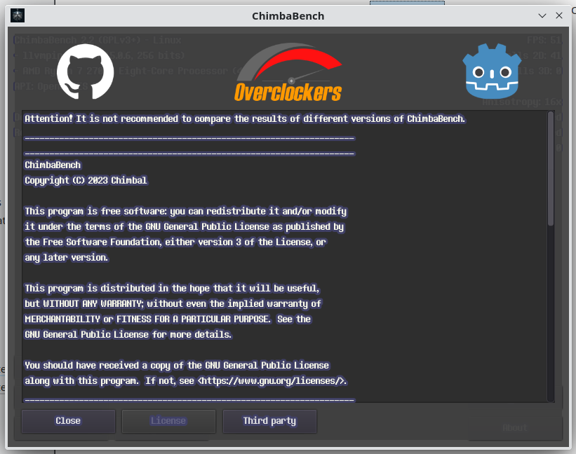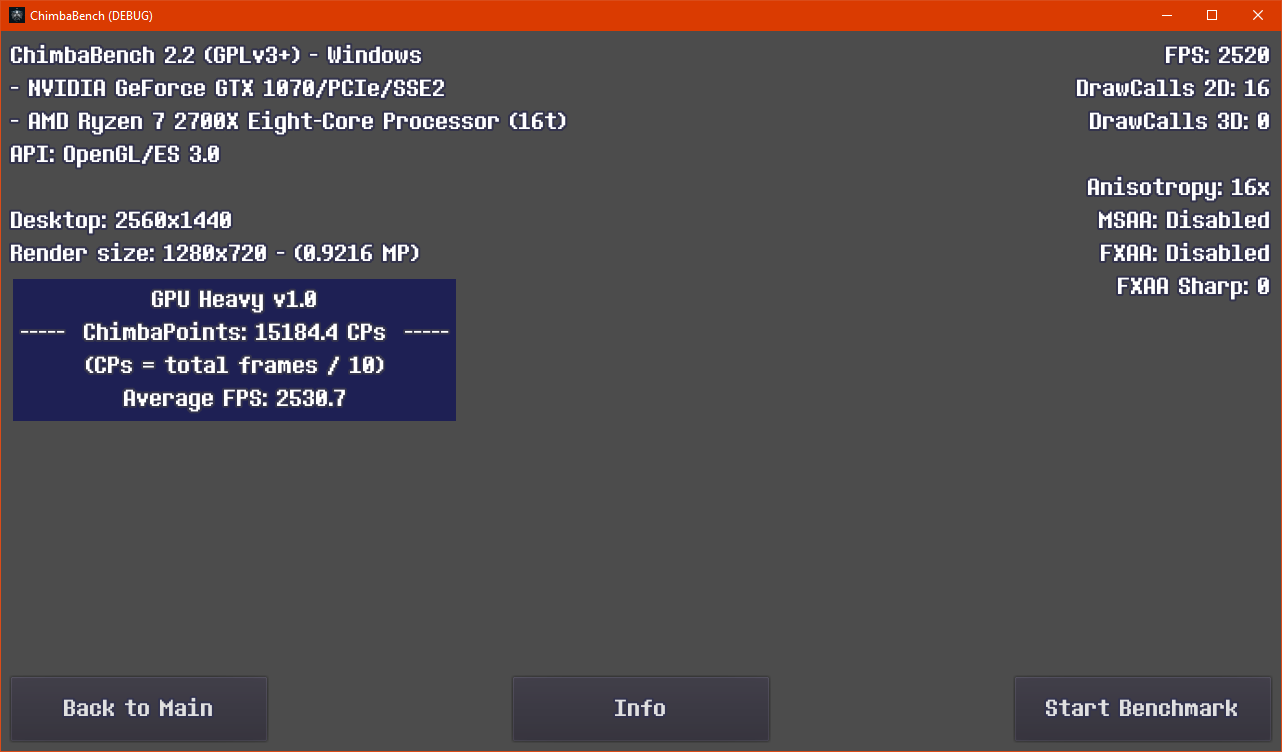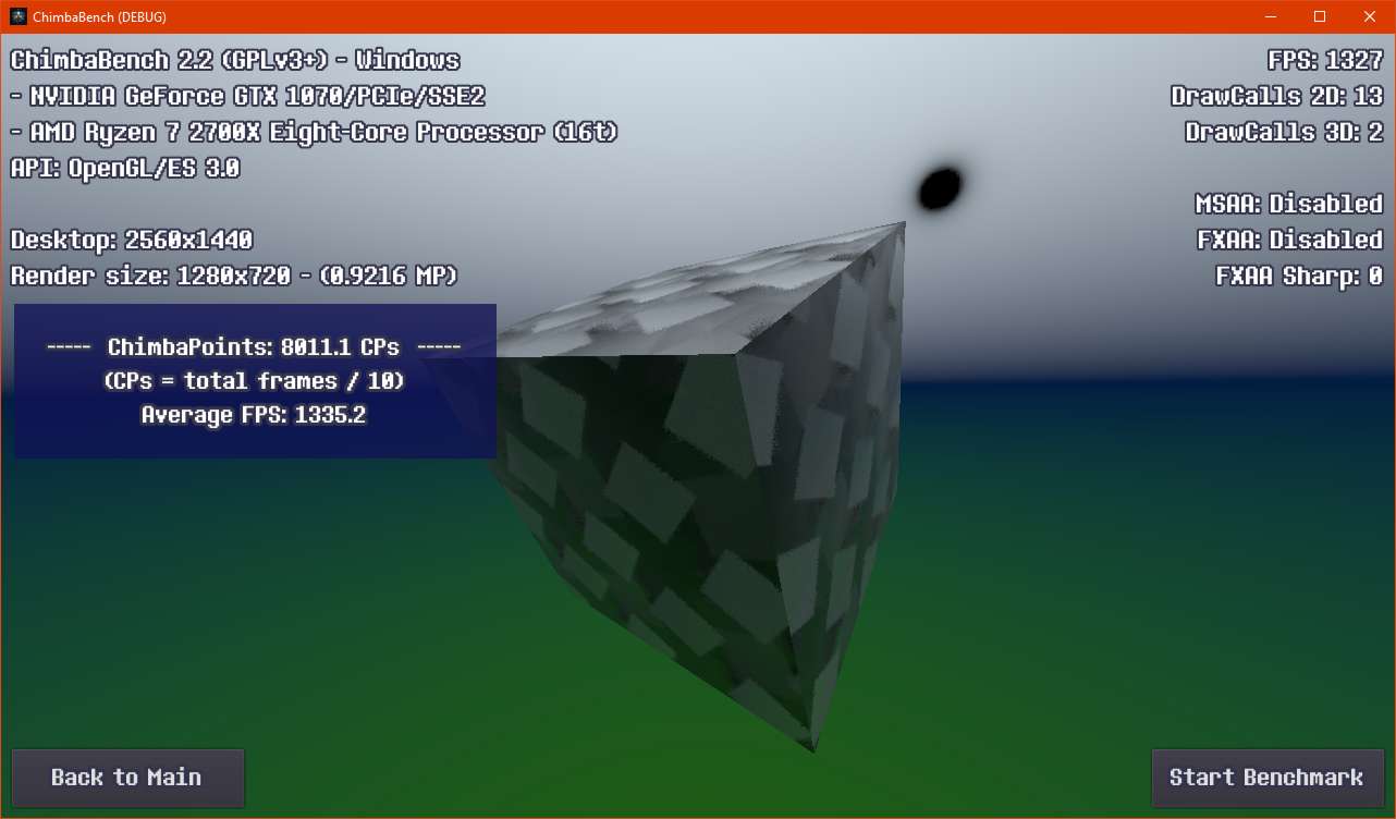 Впрочем, думаю пора на этом завершать ChimbaBench версии 2.2, новая сцена конечно "вышла" на сцену, но пока только в зачаточном состоянии, хотя уже в текущем состоянии новый тест GPU Heavy настолько тяжёлый, что Ryzen 7 2700X в виртуальной машине через LLVM уже не способен даже один кадр в минуту выдать, так что да, без видеокарты тест GPU Heavy нет смысла запускать: