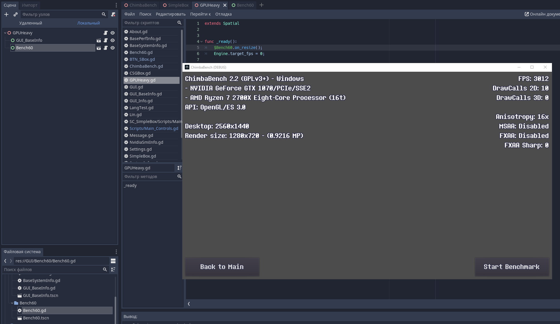 Но ещё нужно поработать и над бенчмарком... Так как я решил добавлять новые сцены, то и модуль тестирования нужно сделать универсальным, и я сделал такой модуль (Bench60), вот теперь можно и над самой сценой работать: