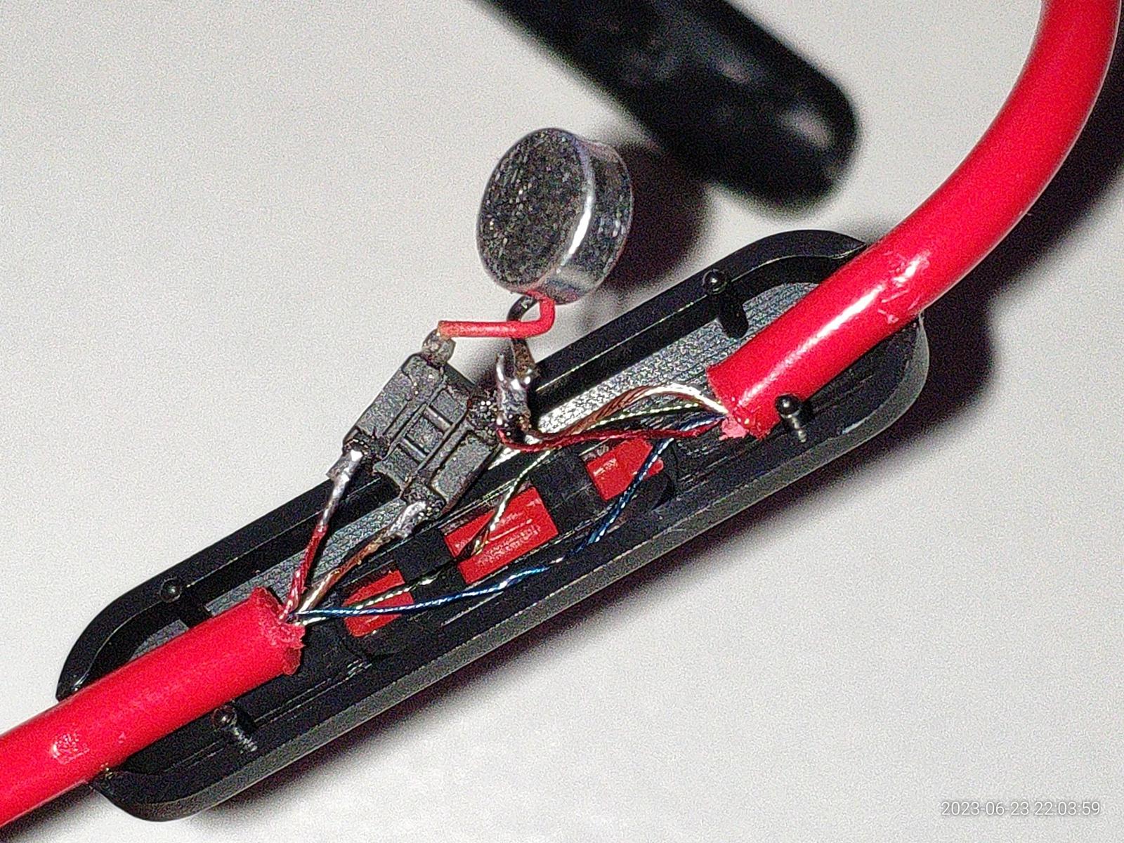 Точно, совсем позабыл про микрофон, проверять его не буду, и так понятно что чудес не будет, особенно если учесть полное отсутствие экранировки и использование совмещенных проводов одновременно на динамики и микрофон, наводки однозначно будут от питающих динамики жилок, да и от электромагнитного фона в пространстве тоже будут наводки: