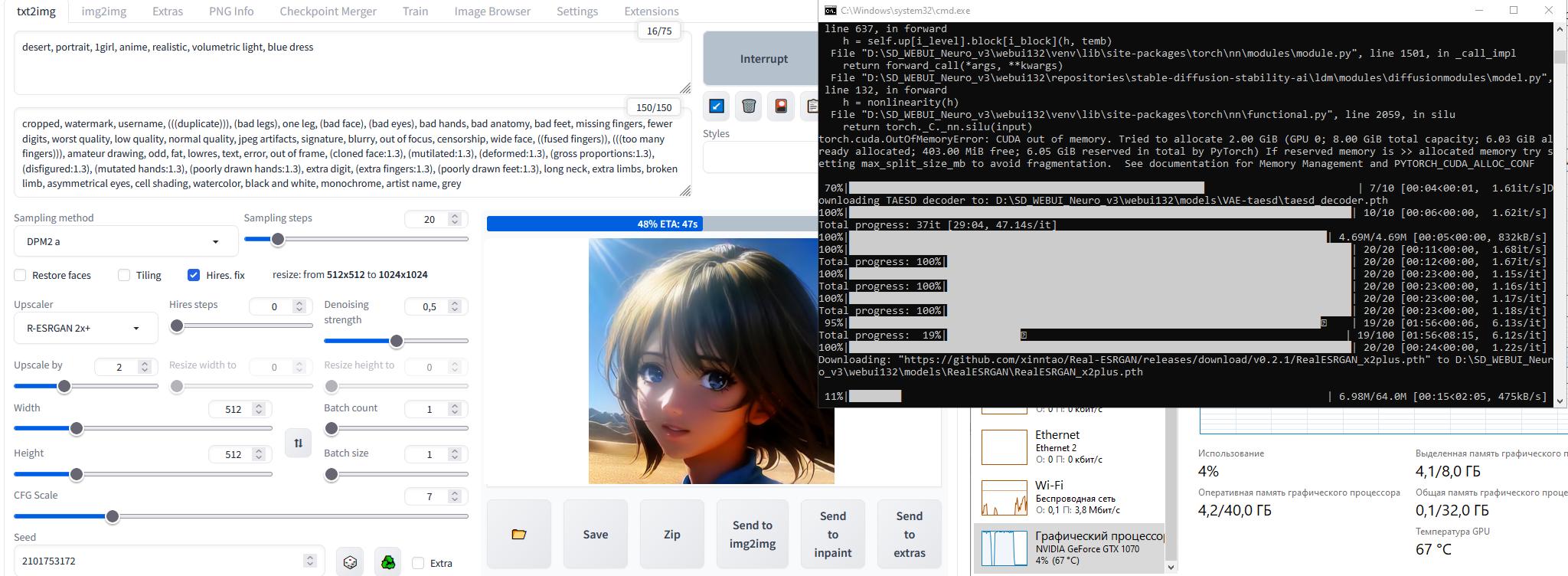 Моя GTX 1070 даже осилила генерацию в размере 2048x2048, и видеопамяти при этом было занято чуть больше 4 ГБ, пока не настал завершающий этап генерации с применением VAE, с одной стороны вроде и генерировал в разрешении 2048x2048, и памяти было занято мало, но в самом конце всё обломалось: