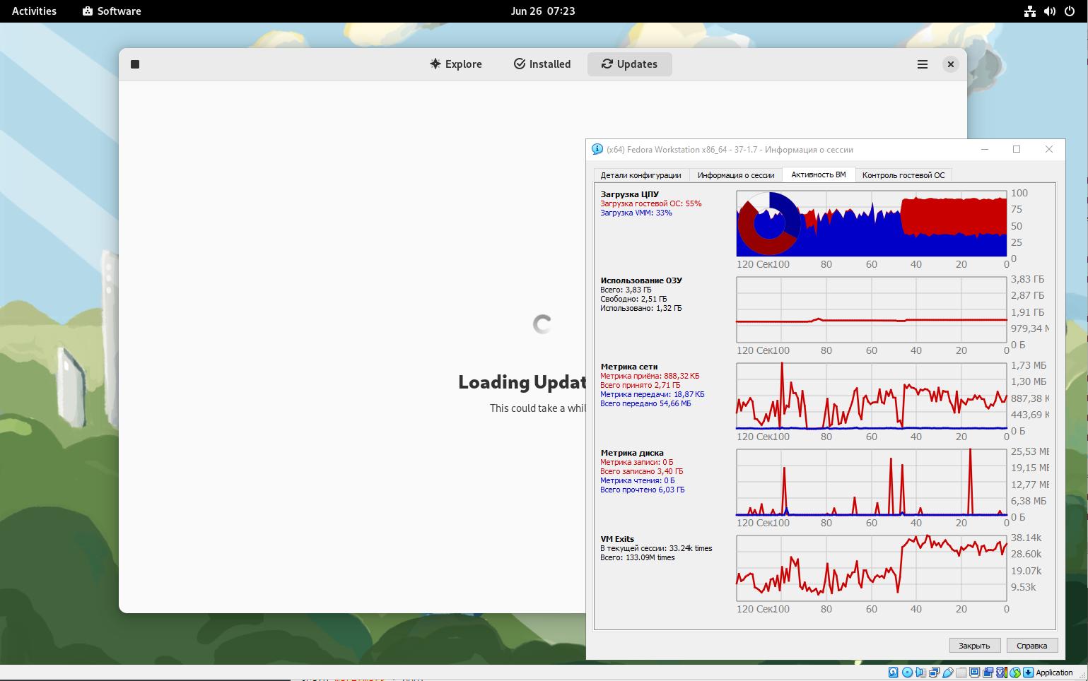 Чтобы исключить вероятность косяков с терминалом, я жёстко перезагрузил виртуальную машину с дистрибутивом, но сетевая активность всё равно продолжалась после загрузки ОС, судя по всему это обновления насасываются... Причём я не нашёл нигде настроек для запрета принудительных обновлений, это ещё хуже, чем в Windows 10/11 по факту: