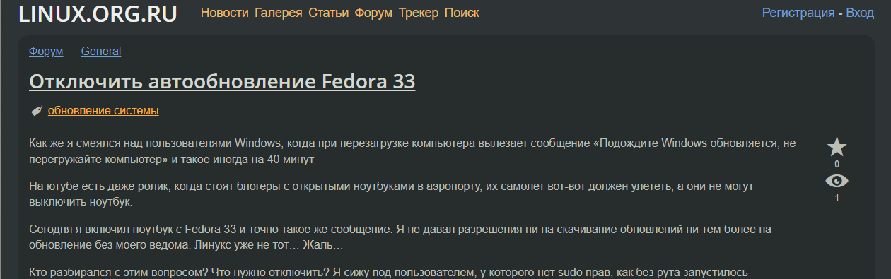 Вот я пользователь, и я хочу чтобы операционная система работала как часы и не ломалась по вине всяких там обновлений кривых, так почему меня лишают возможности реализовать своё желание полностью отказавшись от обновлений которые могут поломать мне систему? Это ли хвалёная свобода линуксоидная? Сидеть в зависимости от всего что возможно и молиться чтобы разработчики ничего не удалили и не поломали? О правиле "работает - не трогай" слышали вообще эти недалёкие разработчики ставящие пользователя в максимально зависимое положение?