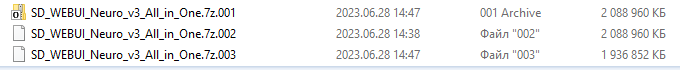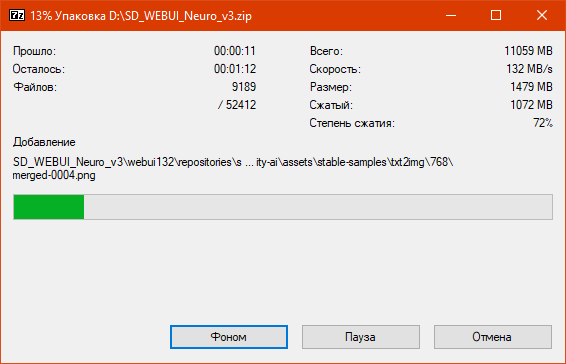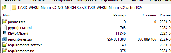 Кстати, упаковать полную версию сборки было затруднительно, чтобы уместить в три части до 2ГБ каждая, мне пришлось заняться чисткой от лишнего хлама, например папки ".git" в Stable Diffusion Web UI, и когда я смотрю на размер действительно портативной сборки Stable Diffusion: