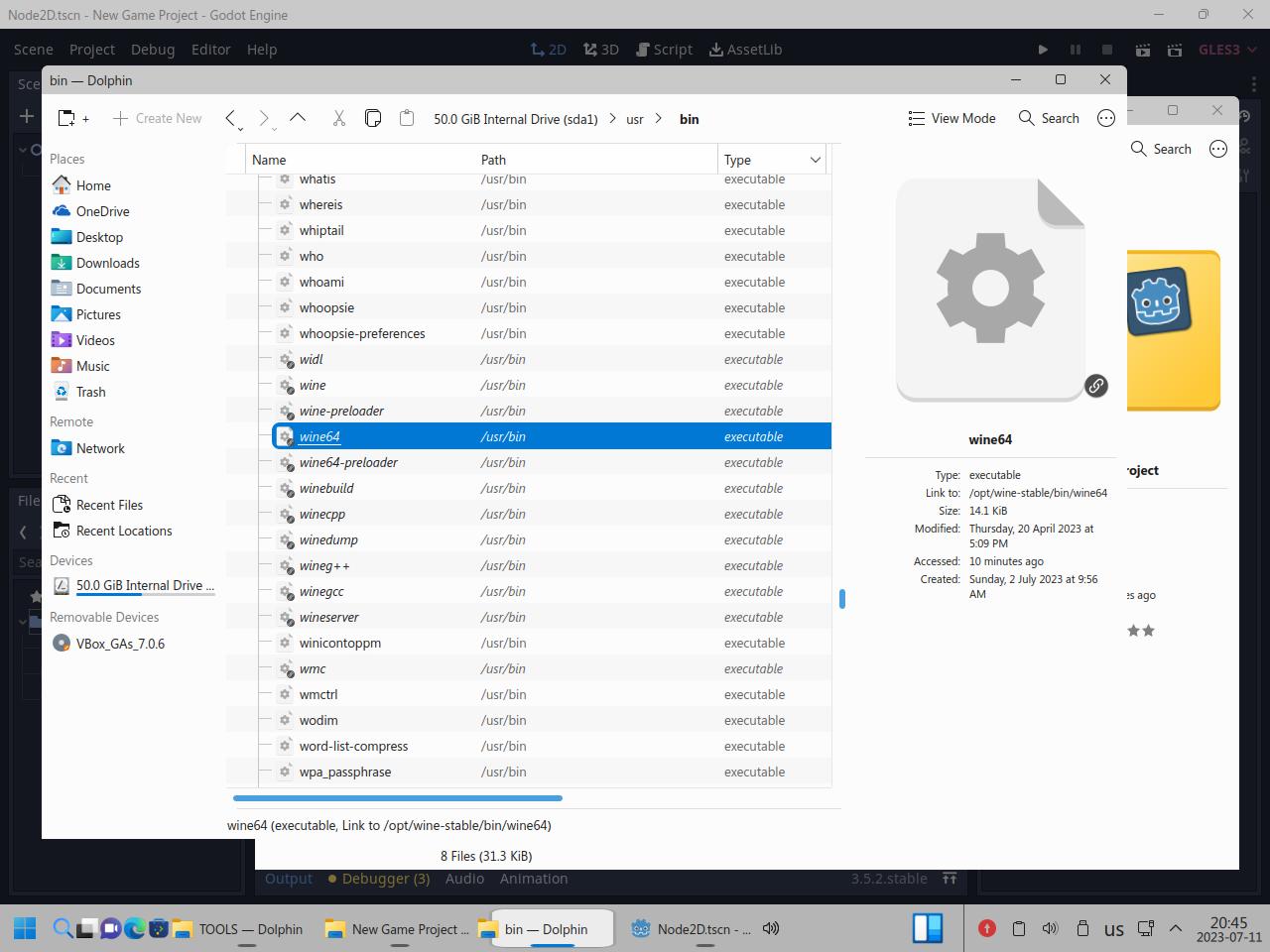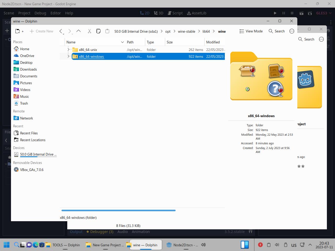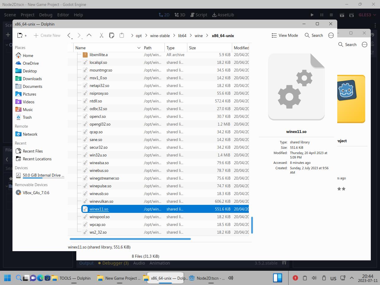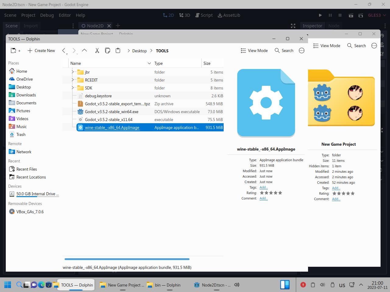 Так я скопировал папку с Godot Engine и вспомогательными инструментами, само собой я взял Linux версию Godot, но некоторые инструменты работают только из под Windows, и сразу же видна разница между исполняемыми файлами Linux и "exe" для Windows, но об этом я уже говорил в предыдущих частях обзора: