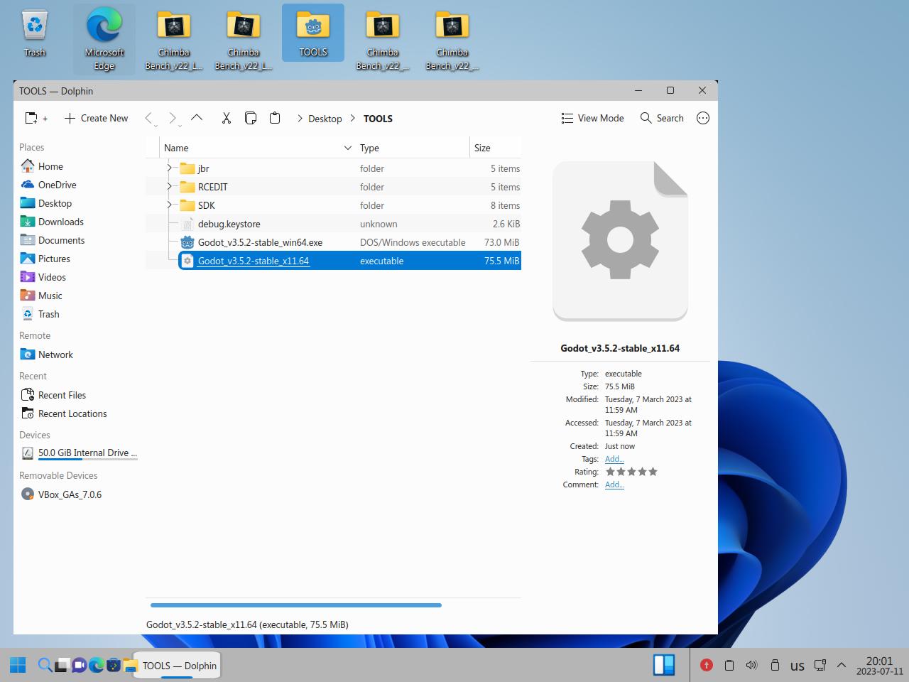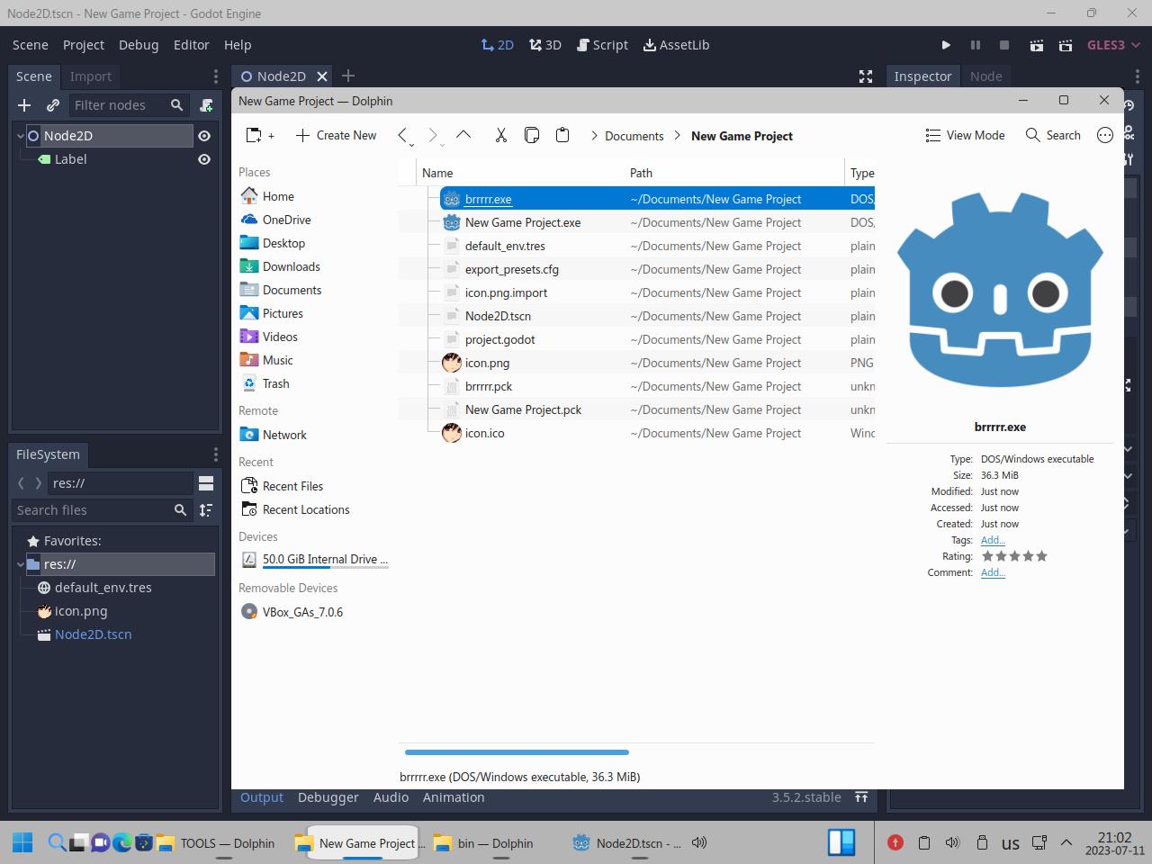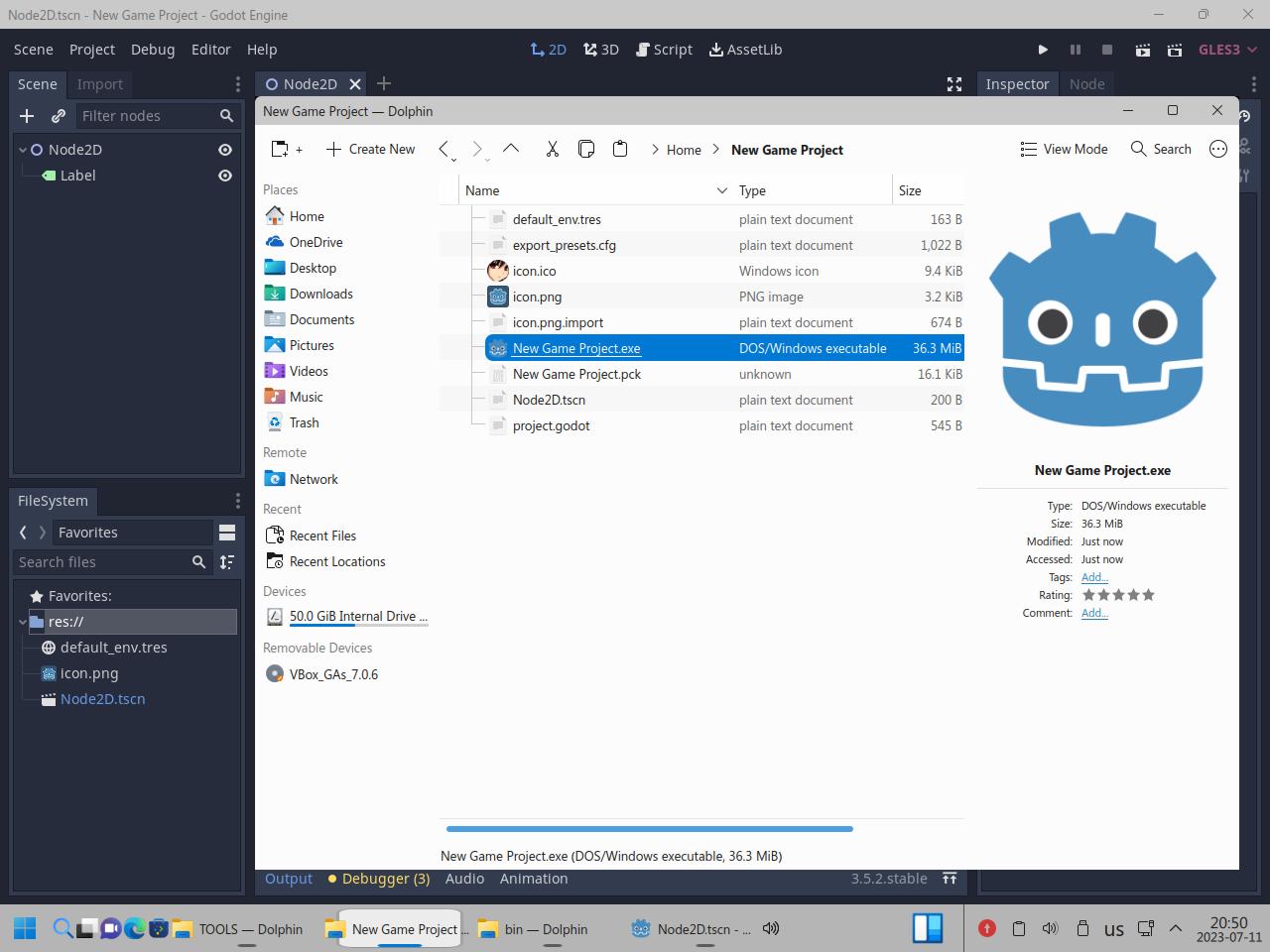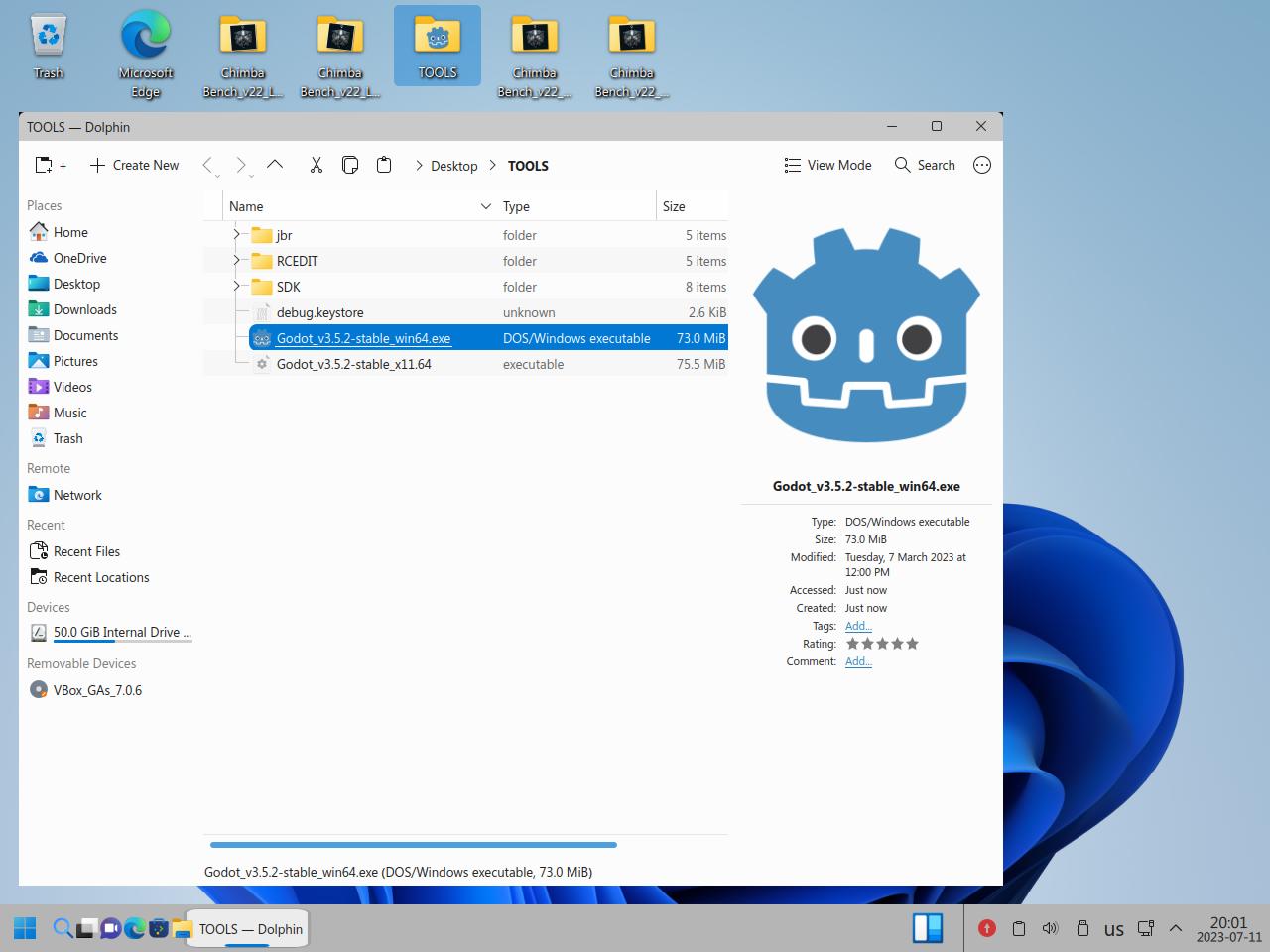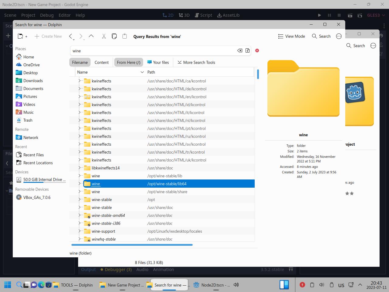 Так я скопировал папку с Godot Engine и вспомогательными инструментами, само собой я взял Linux версию Godot, но некоторые инструменты работают только из под Windows, и сразу же видна разница между исполняемыми файлами Linux и "exe" для Windows, но об этом я уже говорил в предыдущих частях обзора: