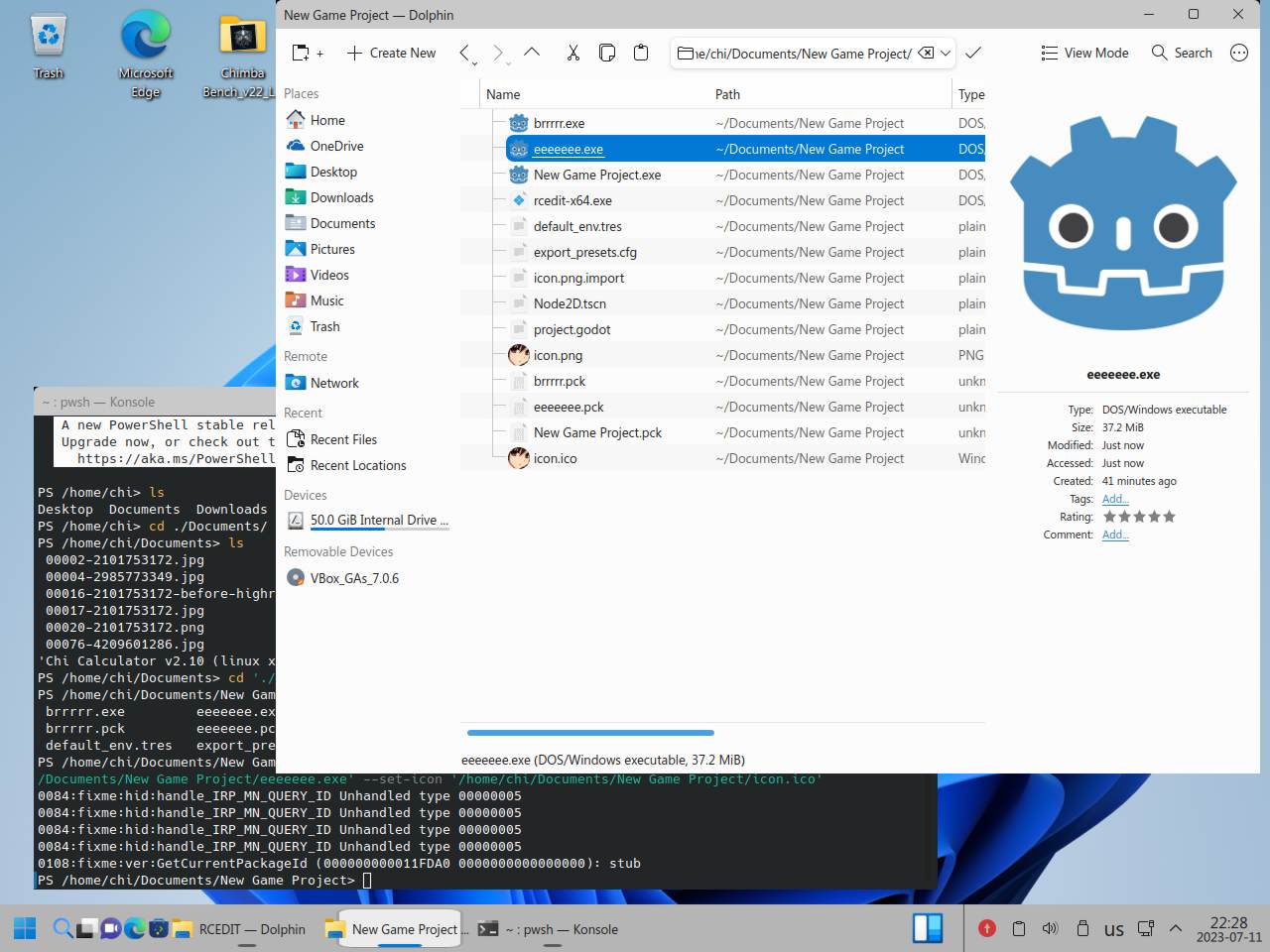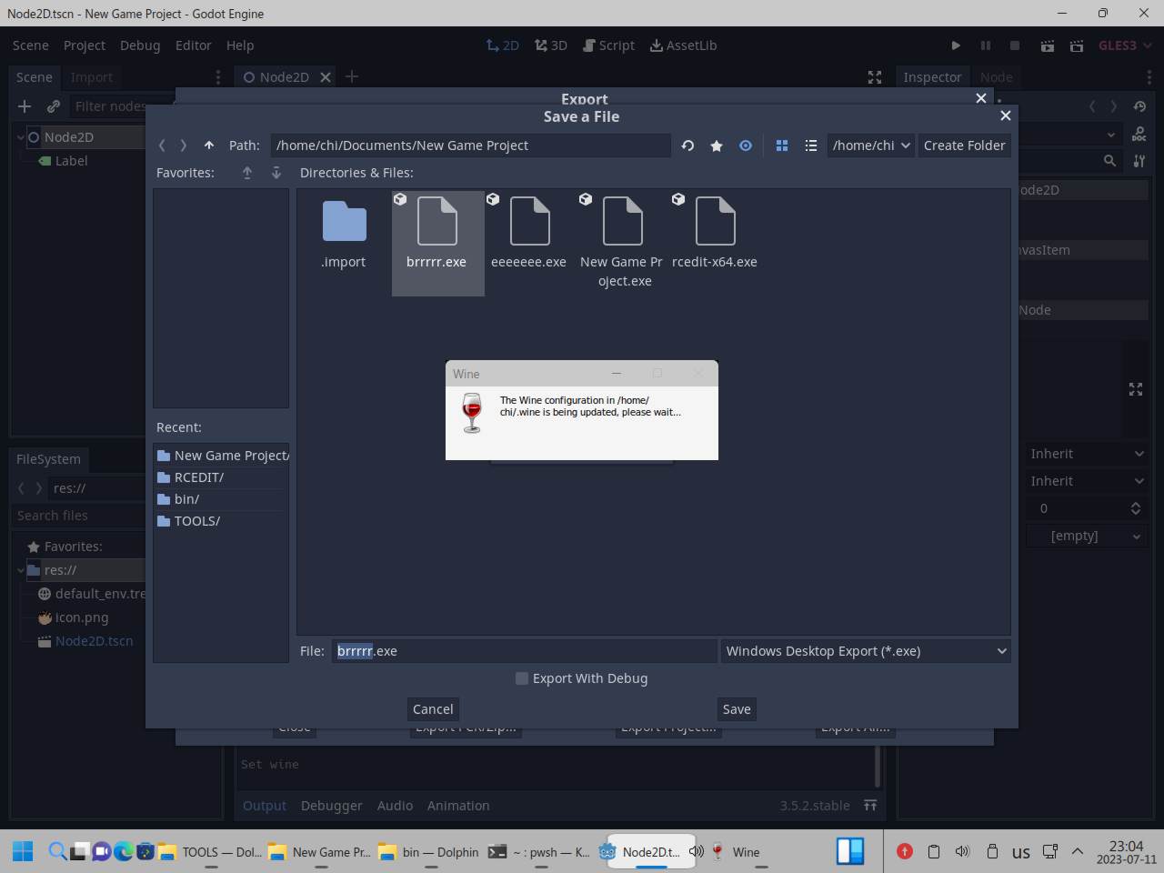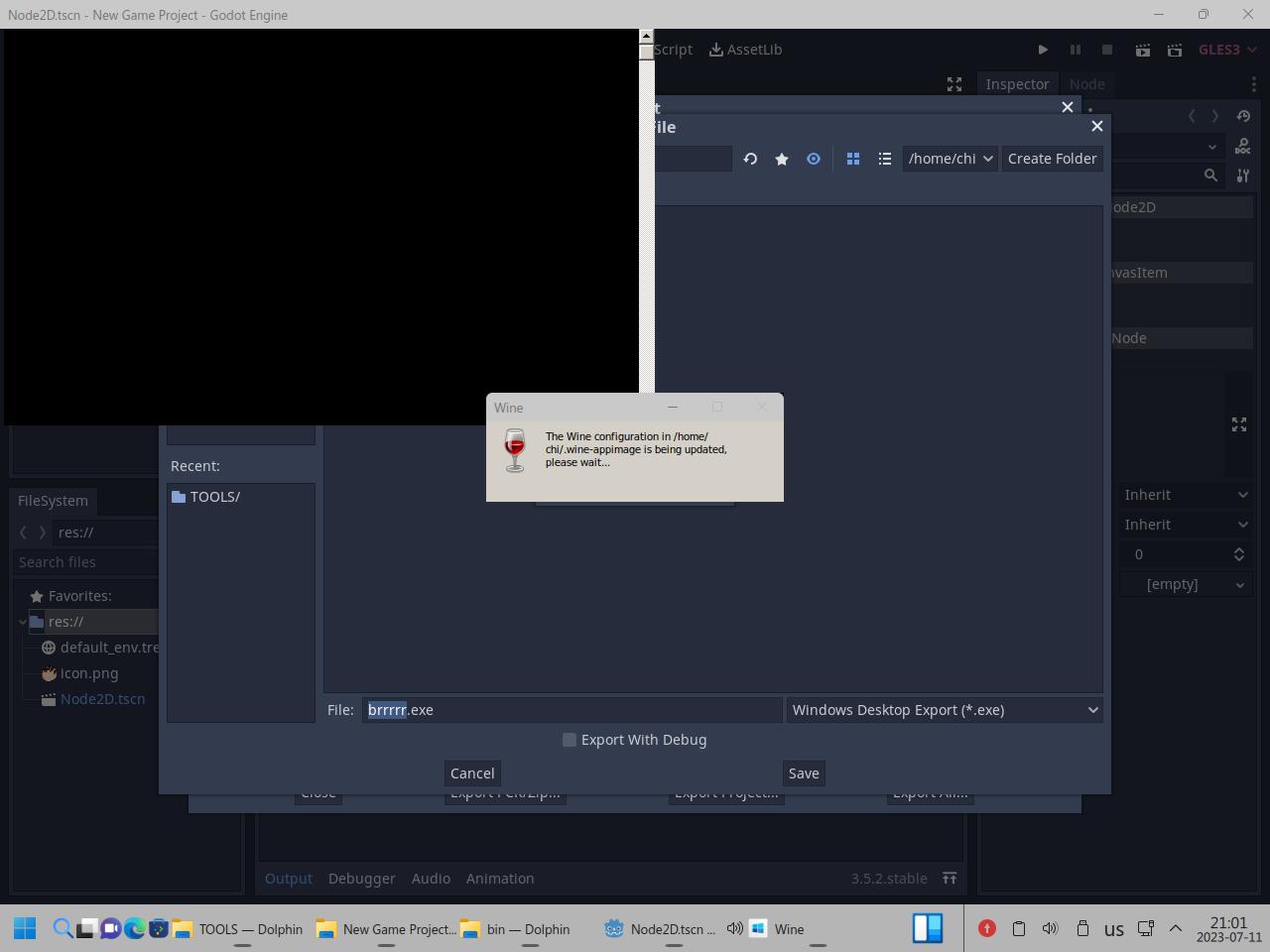 Я снова пытался приделать Wine к линуксоидной версии Godot, брал обычный Wine, брал Wine64, брал из каталога bin, rcedit тоже использовать пытался как 32 битный, так и 64 битный, в итоге от безысходности я взял Wine в виде AppImage, вдруг сработает, но он подумал и нагадил уже настоящими ошибками в консоль вывода так и не сделав что нужно было:
