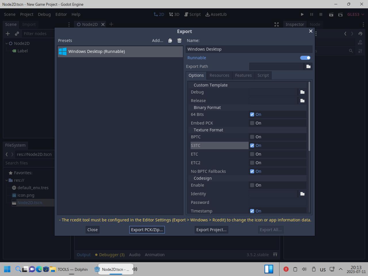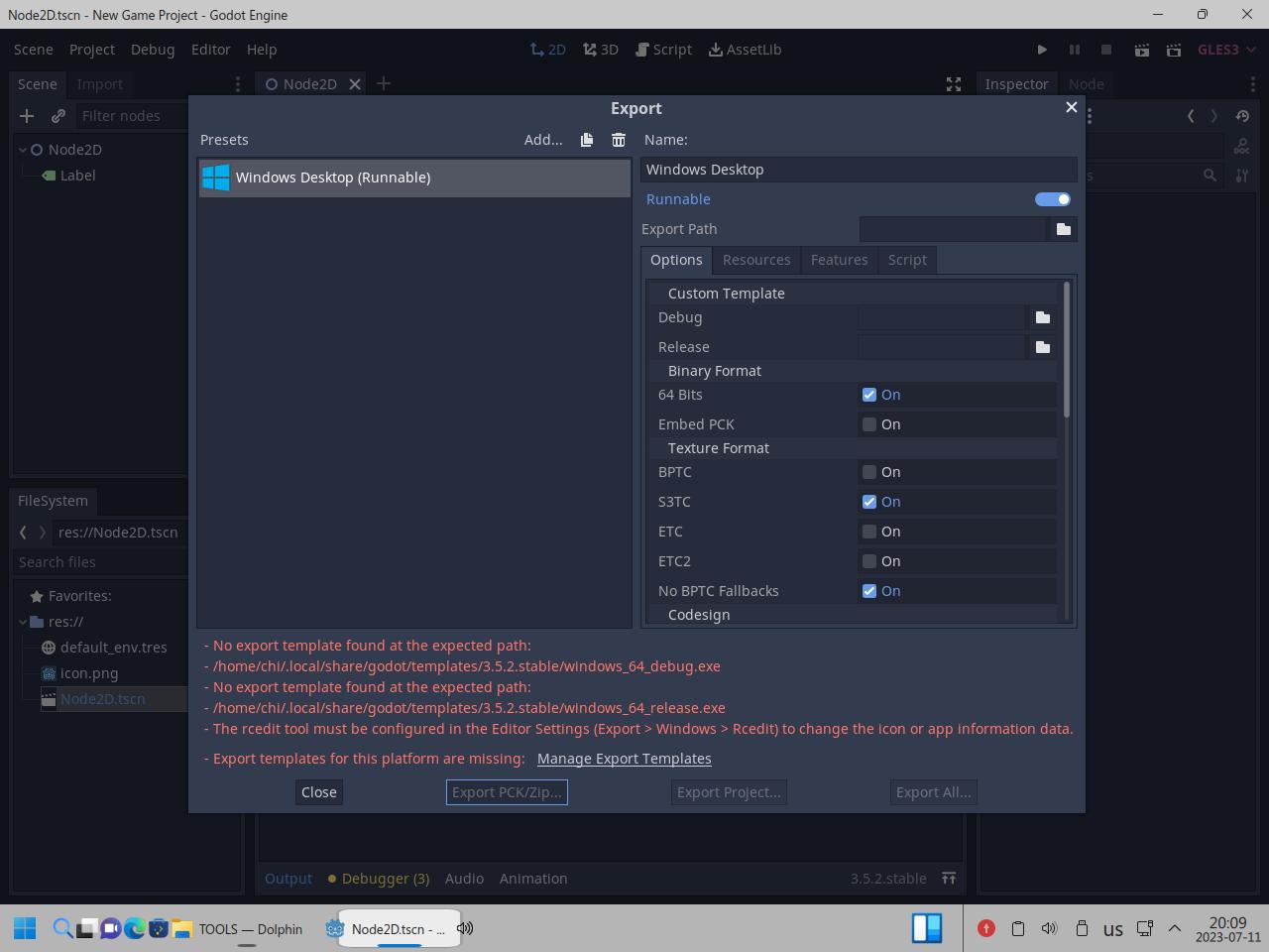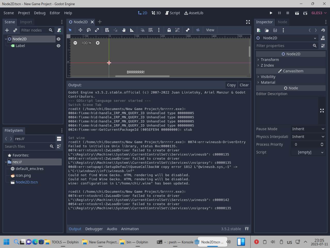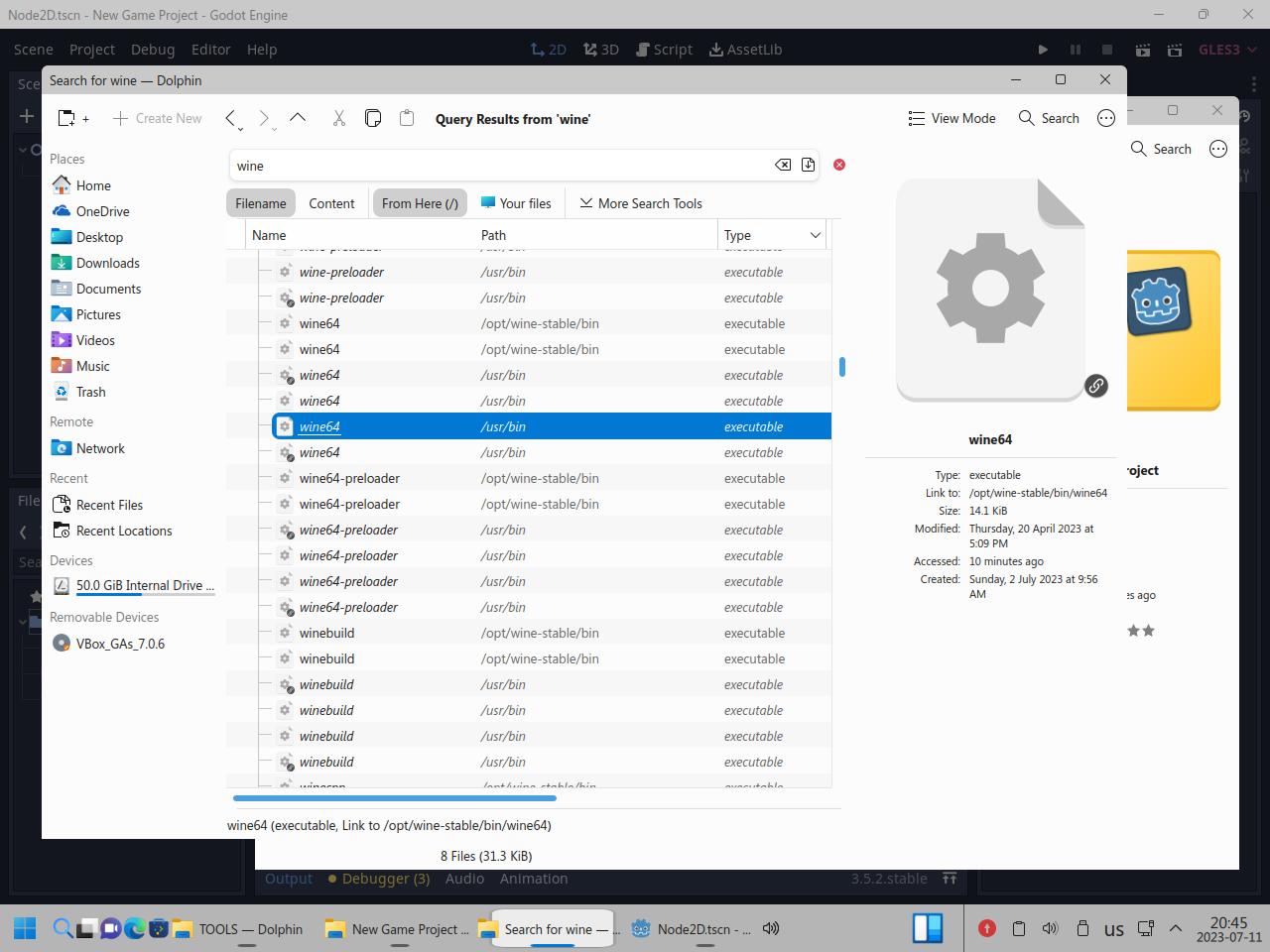 Я снова пытался приделать Wine к линуксоидной версии Godot, брал обычный Wine, брал Wine64, брал из каталога bin, rcedit тоже использовать пытался как 32 битный, так и 64 битный, в итоге от безысходности я взял Wine в виде AppImage, вдруг сработает, но он подумал и нагадил уже настоящими ошибками в консоль вывода так и не сделав что нужно было: