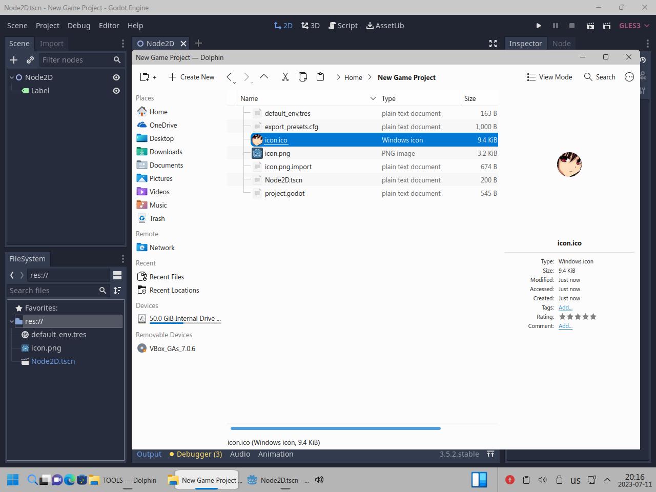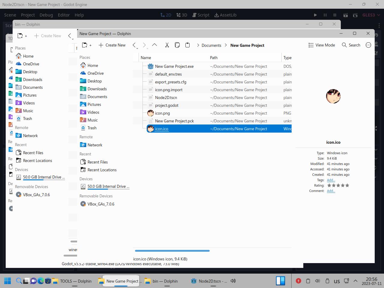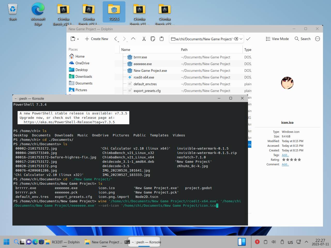 Но опять же, откуда это знать человеку который допустим только начинает работать с Godot Engine и не в курсе про такие нюансы? Вот он сразу в среде Linux начинает работать, откуда ему знать что проблема не в Wine, а в неправильно подготовленной иконке? Тем более ряд ответов поисковой системы по выпавшим "ошибкам" говорят что нужно переустанавливать Wine: