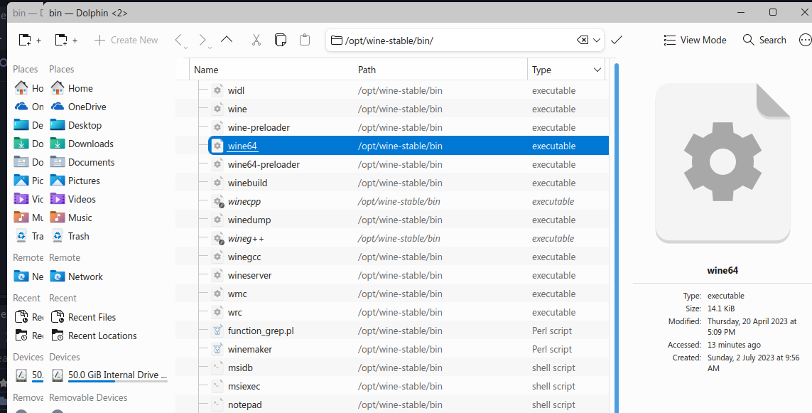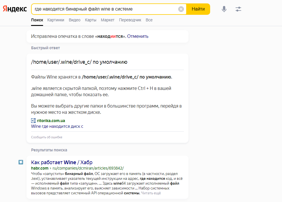 Вдруг проблема в том, что по умолчанию работает неправильный Wine? Нужно выбрать "правильный" исполняемый файл Wine, но где найти исполняемый файл? В среде Windows всё понятно, захожу в папку Program Files, а дальше в папку нужной программы, но в среде Linux даже поисковик не знает ответ на столь очевидный вопрос, я пробовал вместо "бинарный" использовать слово "исполняемый" - не помогало: