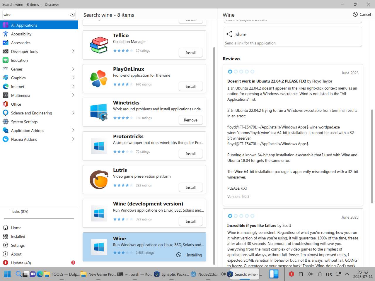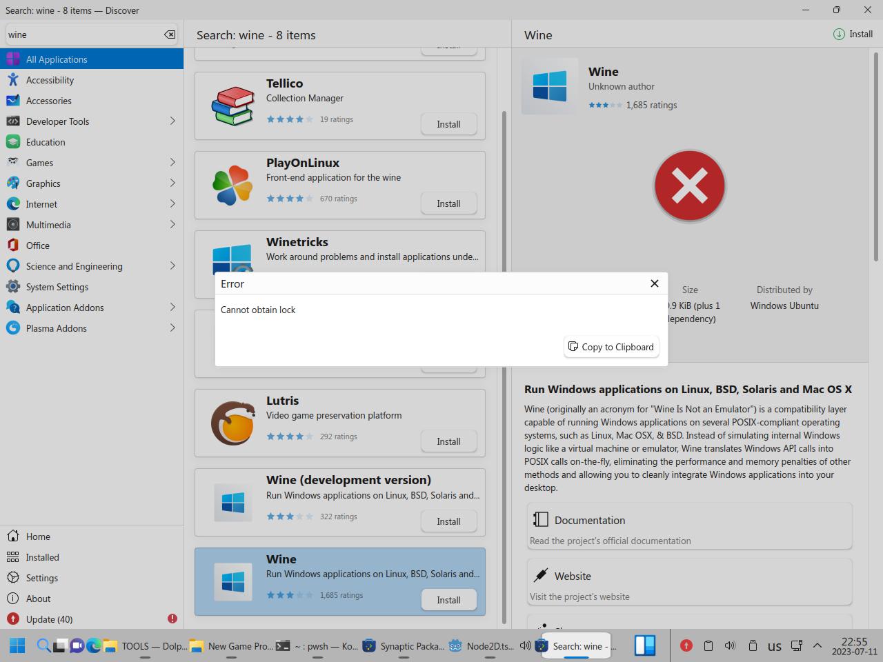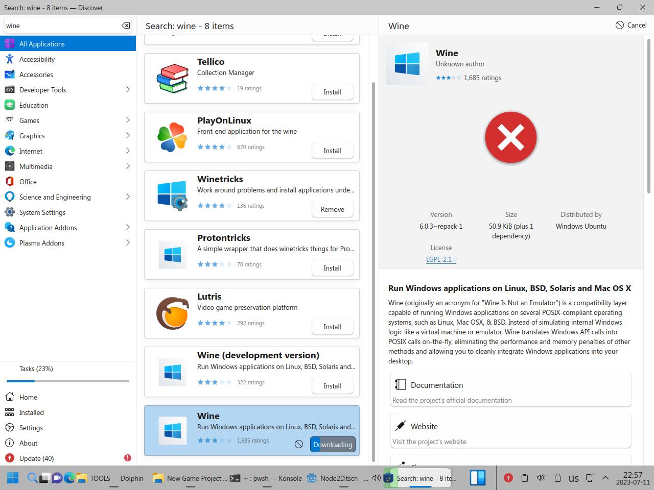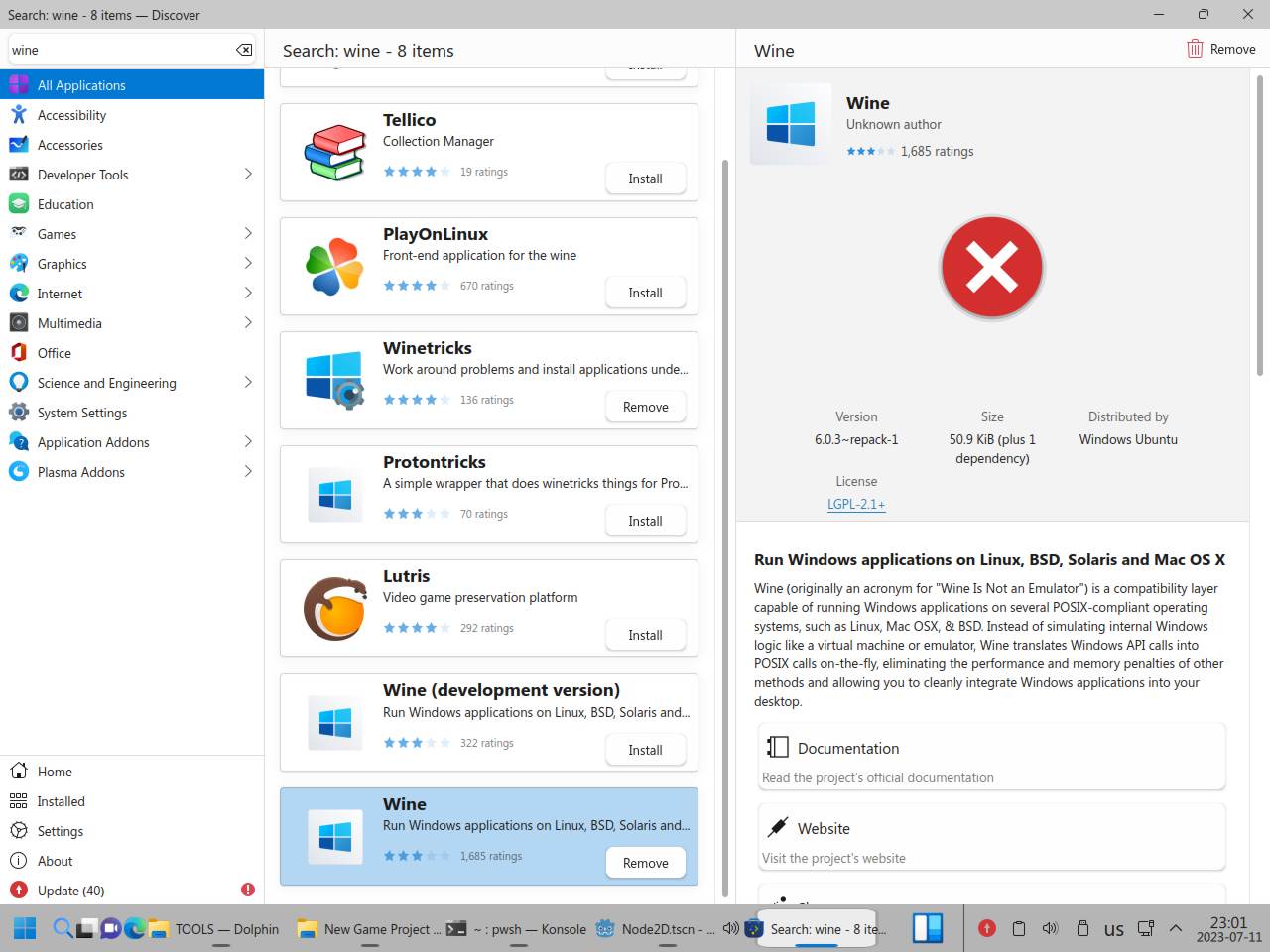Почему я полез ковырять Wine в пакетном менеджере? Да потому что в центре приложений вообще хрен знает что происходит, Wine вроде как есть в системе, но он вроде как не установлен!
