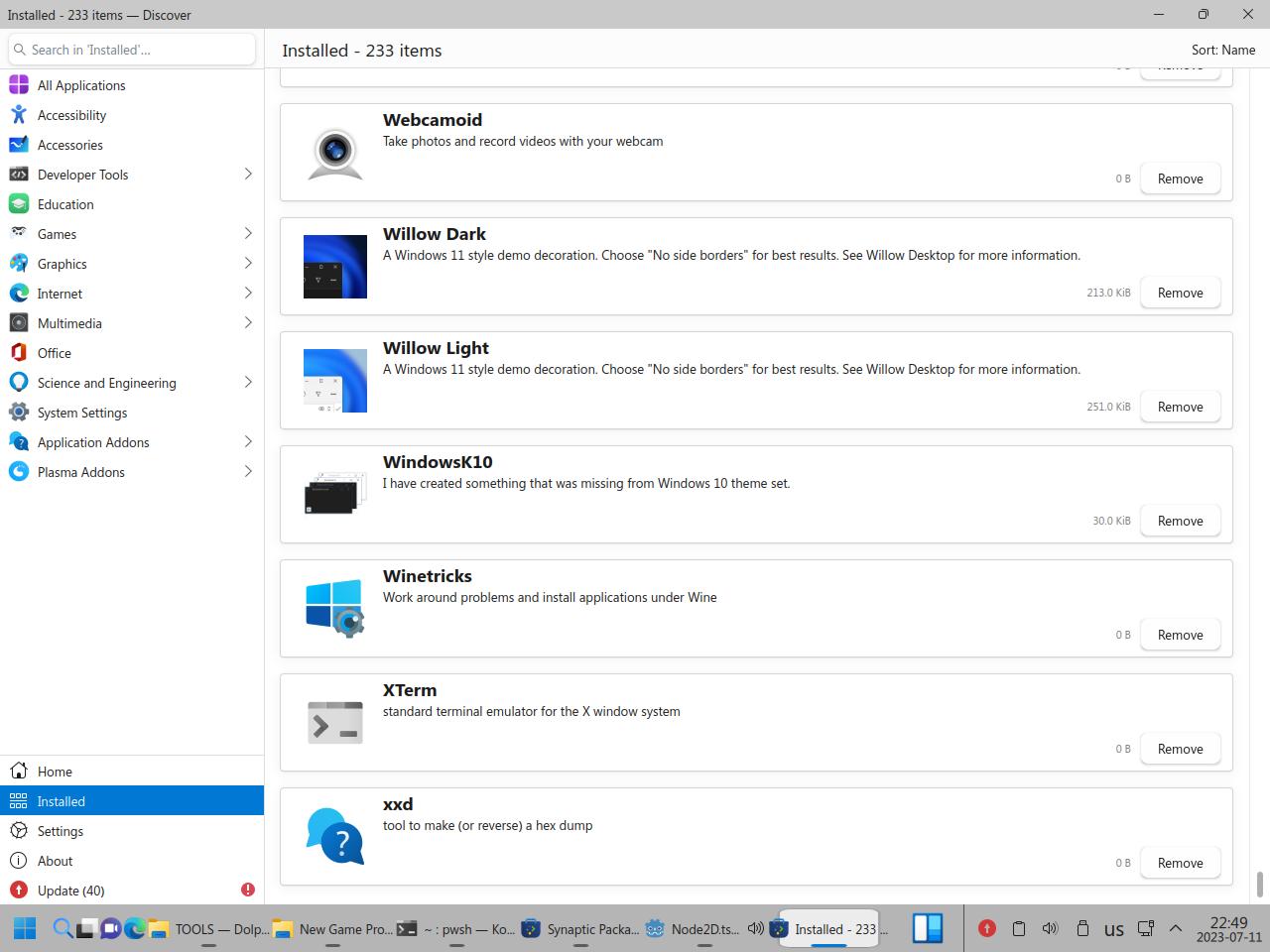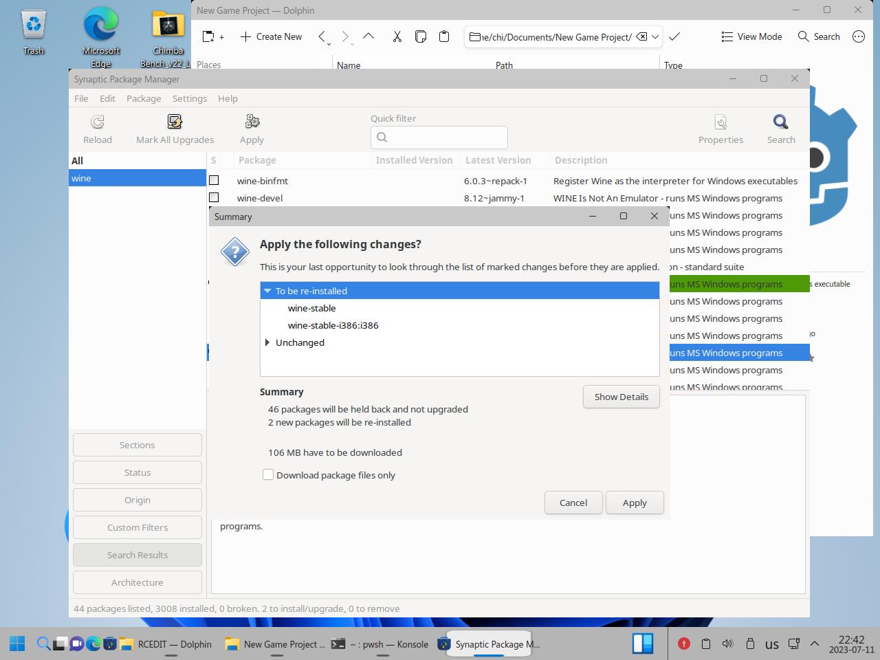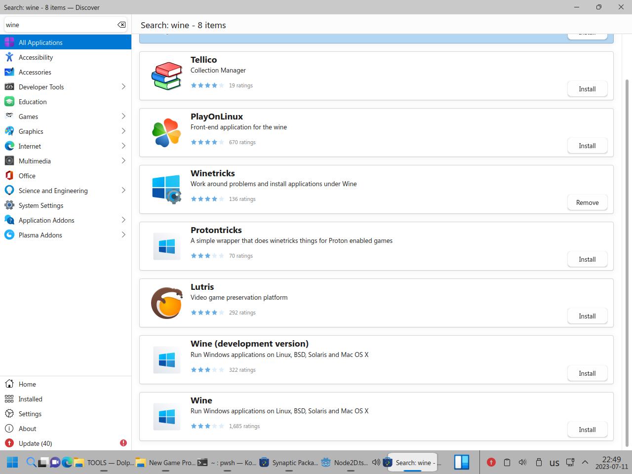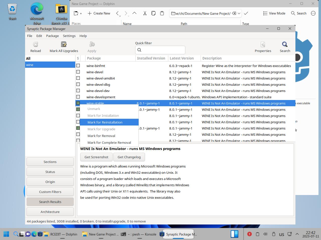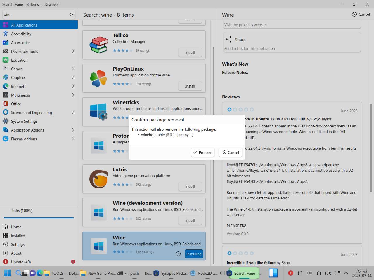 Почему я полез ковырять Wine в пакетном менеджере? Да потому что в центре приложений вообще хрен знает что происходит, Wine вроде как есть в системе, но он вроде как не установлен!