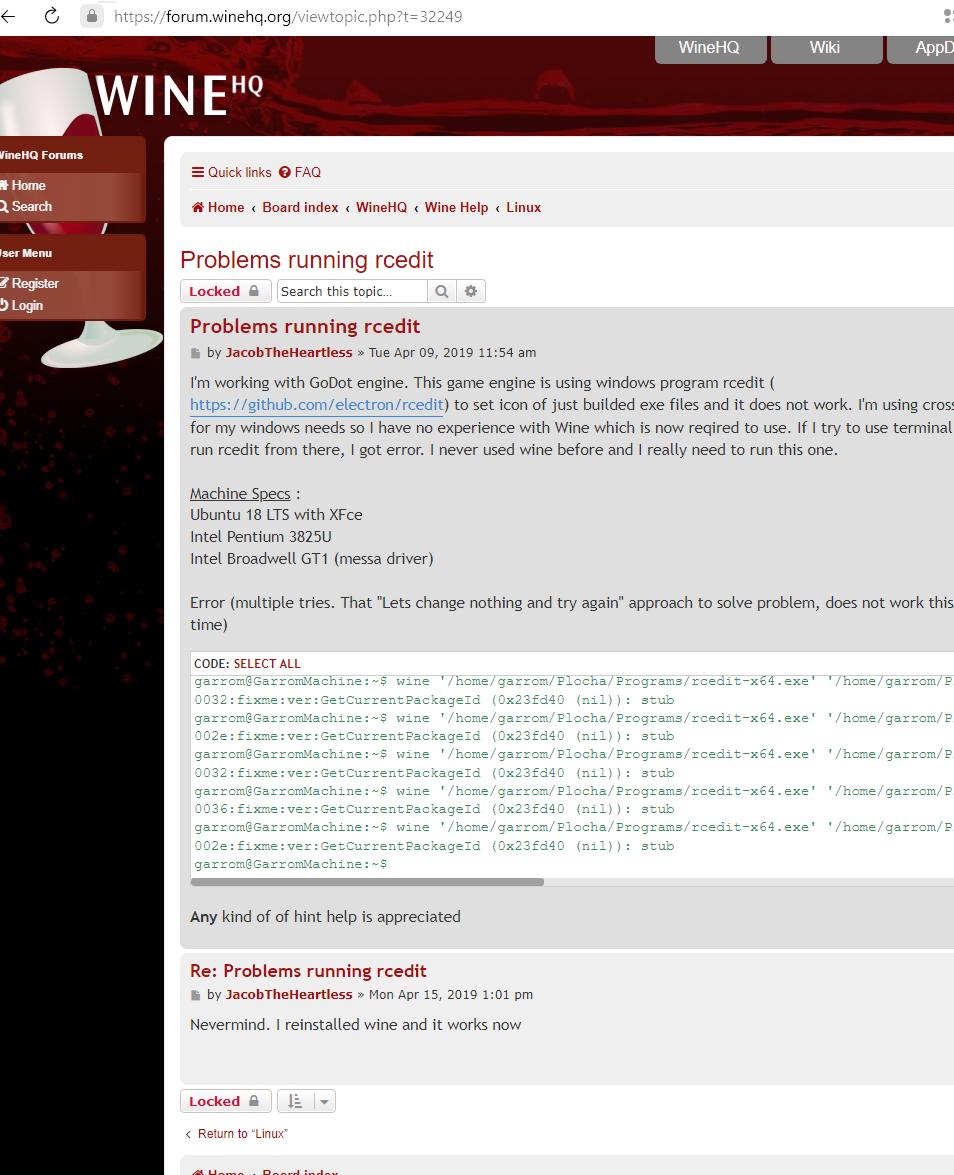 И нет, я не собираюсь обвинять Wine, он в данной ситуации просто жертва, это ситуация когда что-то сделано руками из жопы (rcedit), а страдать приходиться всем вокруг, но в первую очередь пользователю который полезет искать информацию про непонятные "ошибки" и попытается неправильным способом решить проблему... А ведь изначально кривой софт мог просто выдать ошибку "иконка неправильная", и на этом все проблемы сами собой отпали бы...