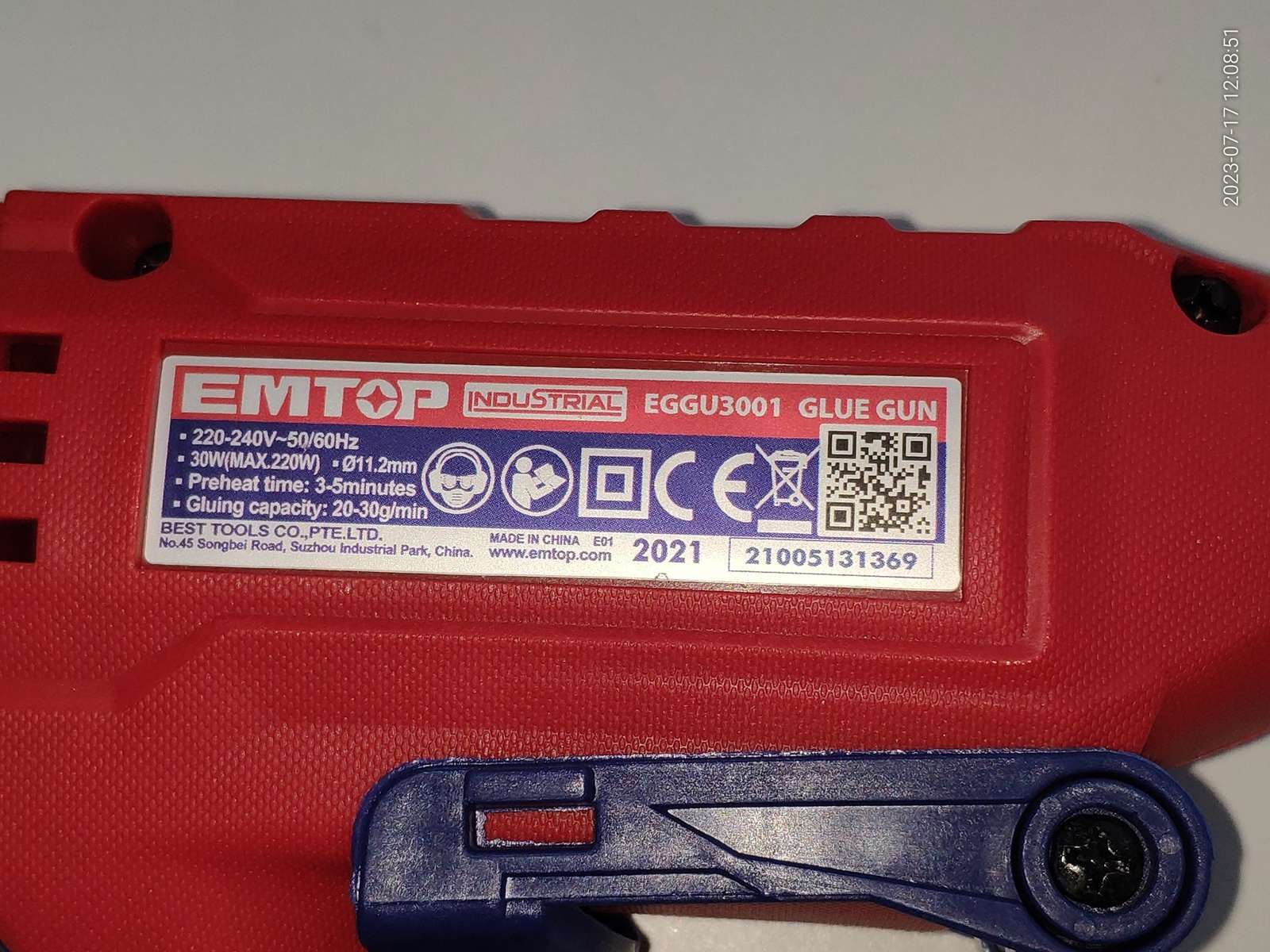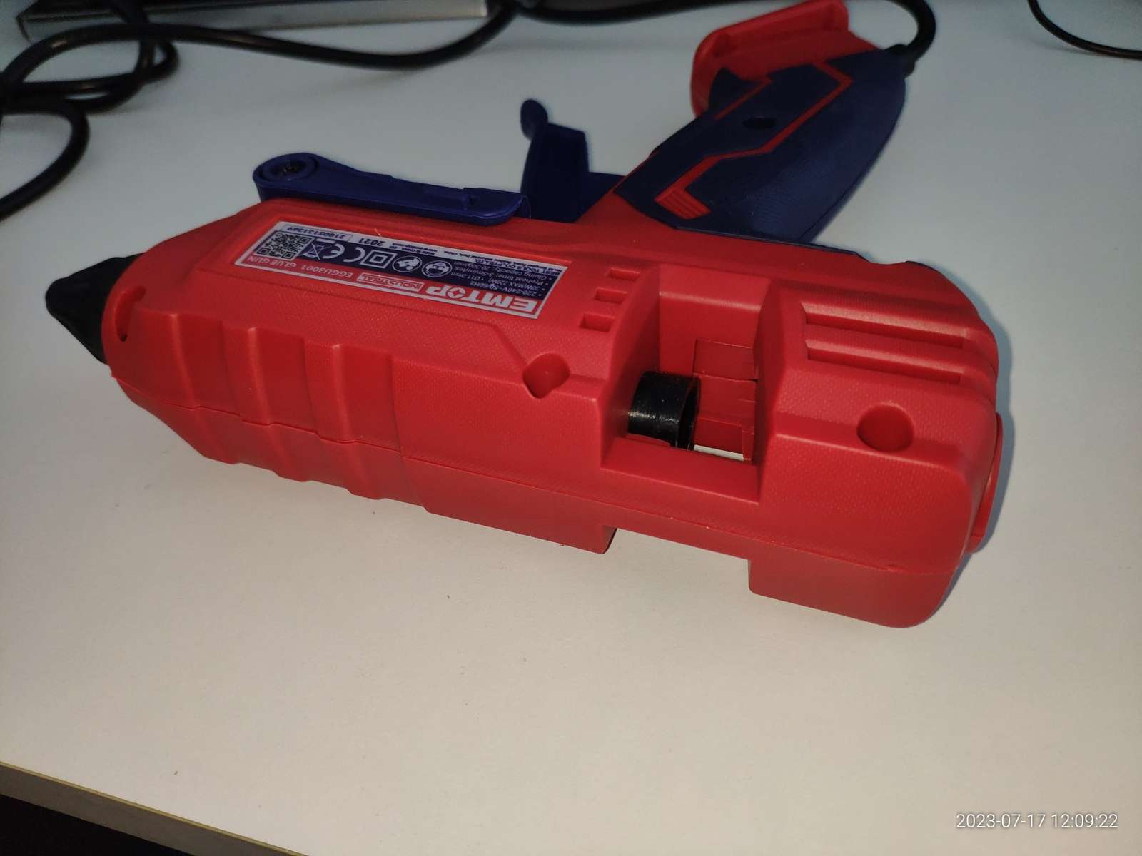 Есть наклейка с подробной информацией: Модель, напряжение 220-240в ~50/60Гц, мощность 30Вт (максимальная 220Вт), указан диаметр стержня 11.2мм, время предварительного нагрева 3-5 минут, производительность 20-30гр клея в минуту, произведено в 2021 году: