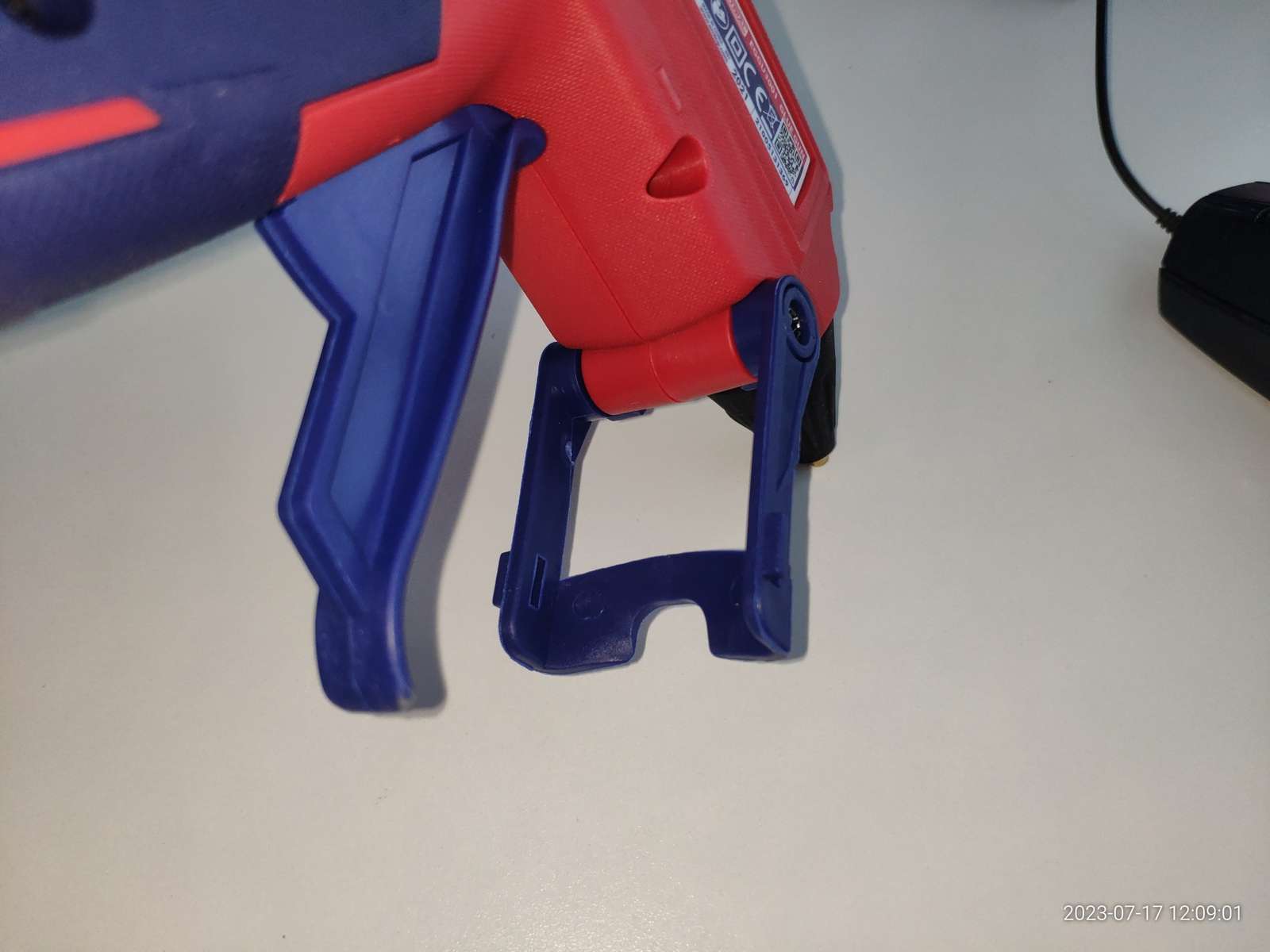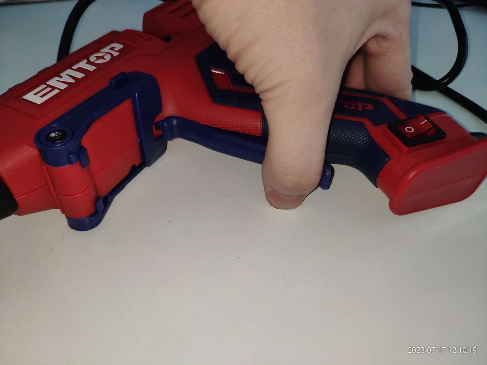 С левой стороны ручки есть выключатель, его нельзя одной рукой включить/выключить держа пистолет, а вот на выдвижной подставке облоя довольно много, и его потом пришлось снять чтобы не резался в руки при использовании: