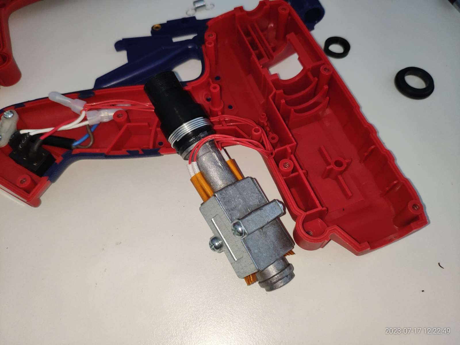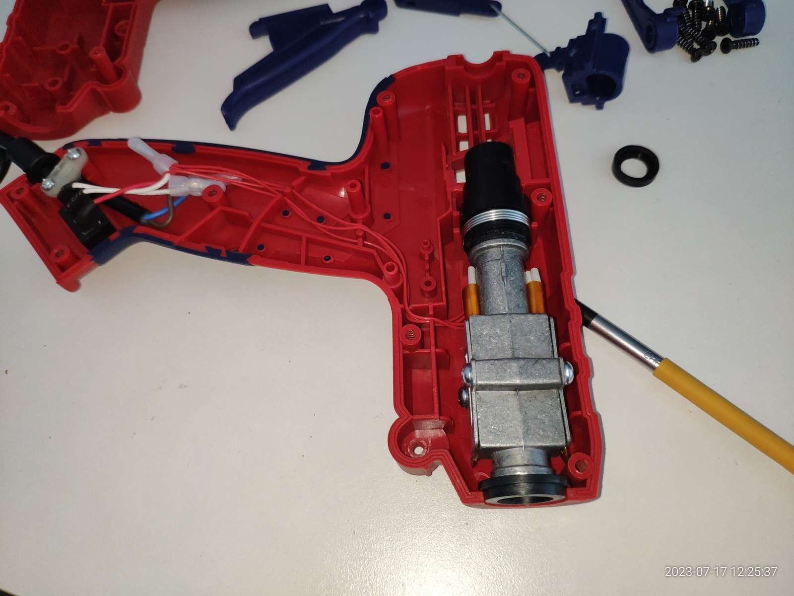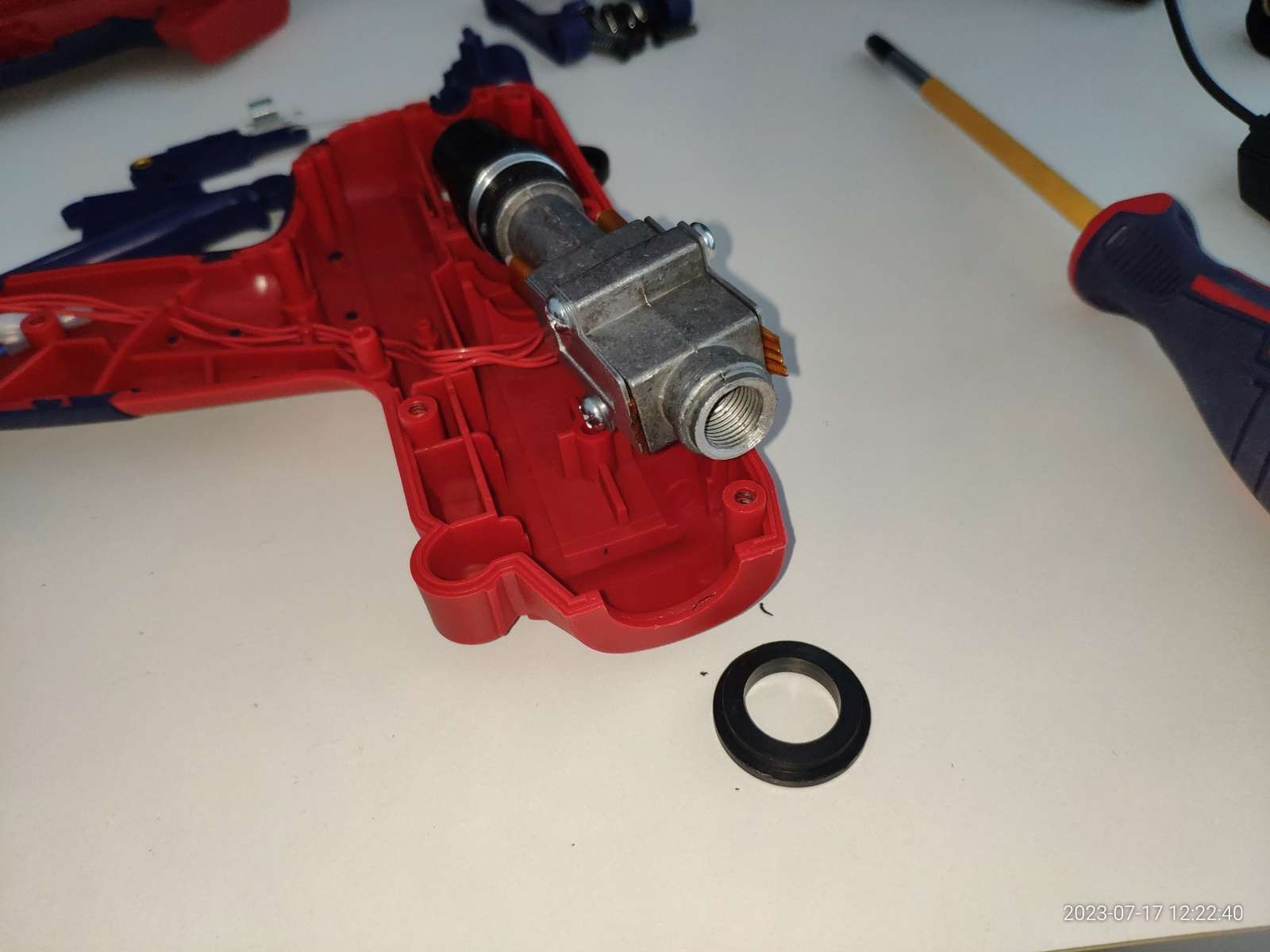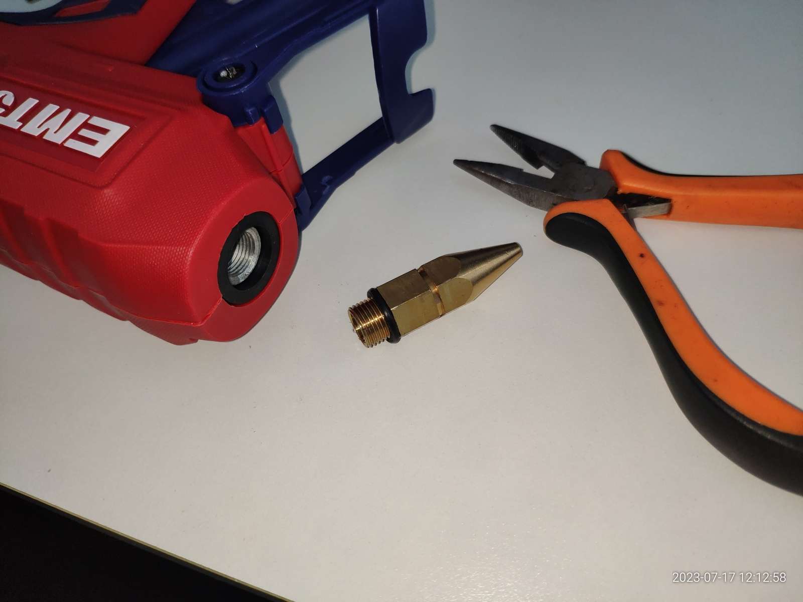 В общем ничего не взорвалось, пробоя на металлическое сопло нет, и это хорошо, можно заправлять термопластичный клей, и сразу же в дело вступают сальники: