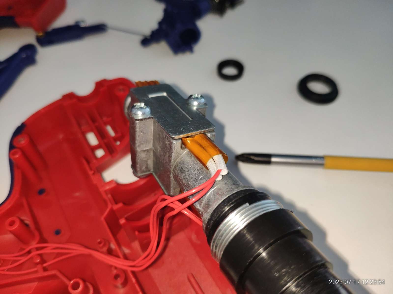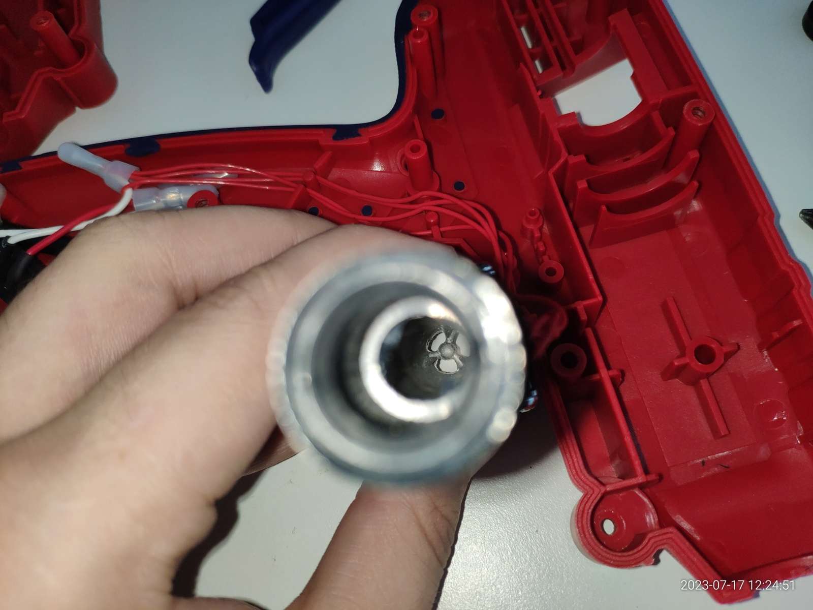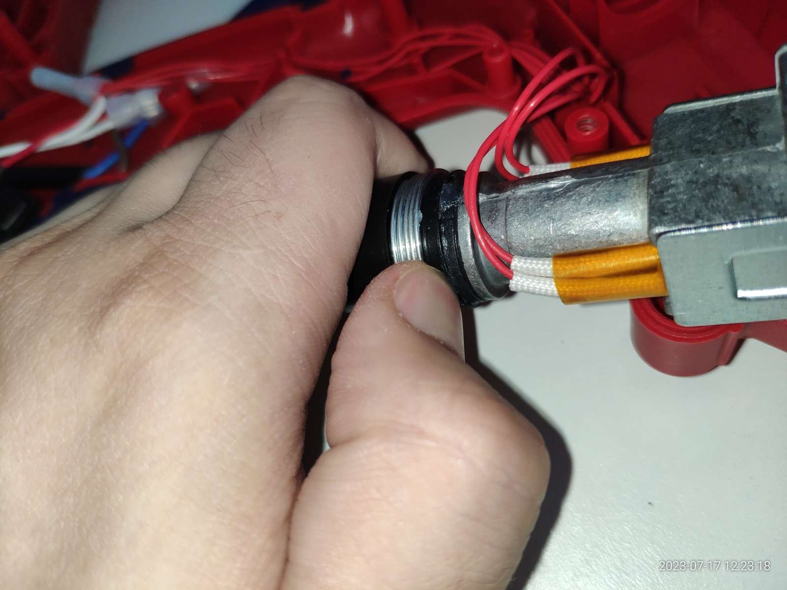 В общем ничего не взорвалось, пробоя на металлическое сопло нет, и это хорошо, можно заправлять термопластичный клей, и сразу же в дело вступают сальники: