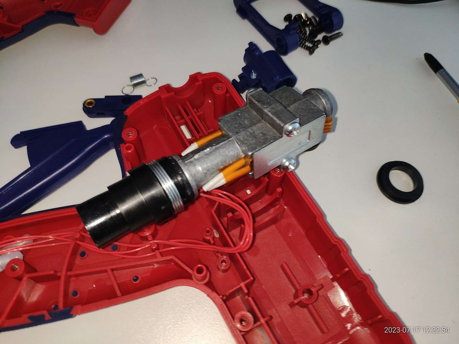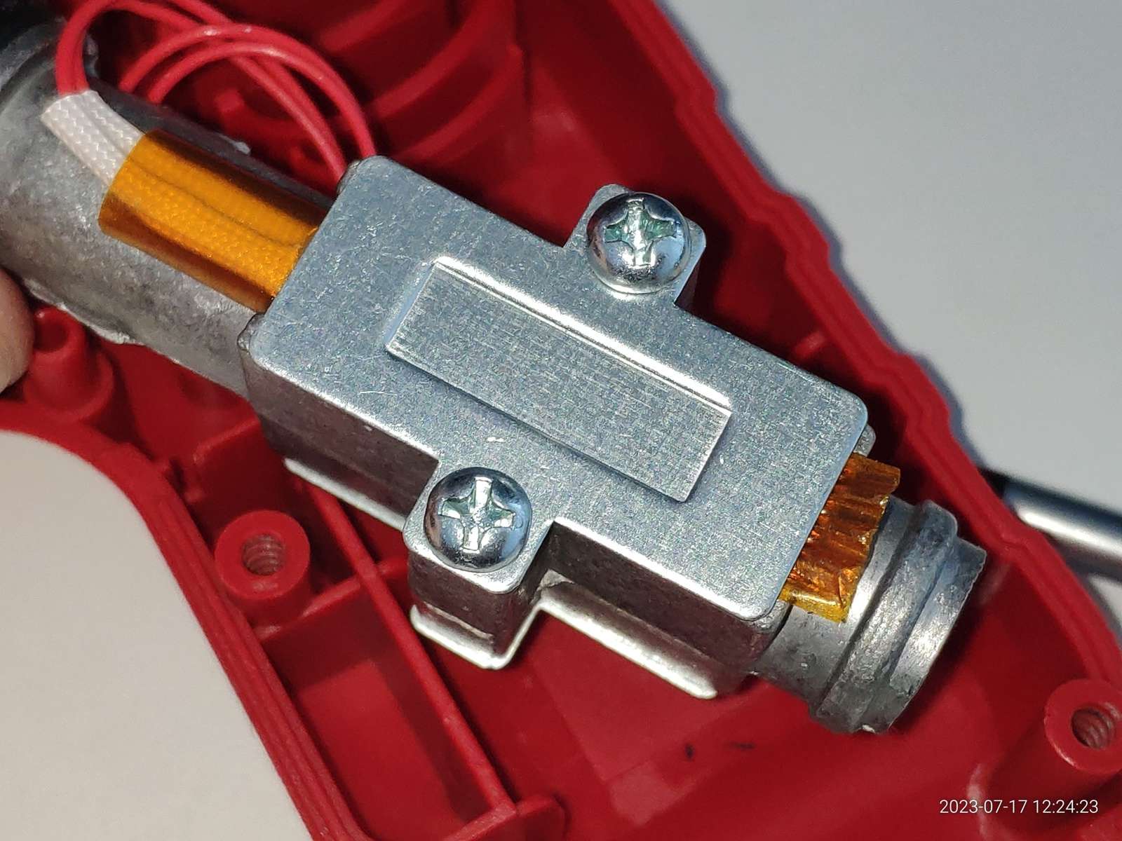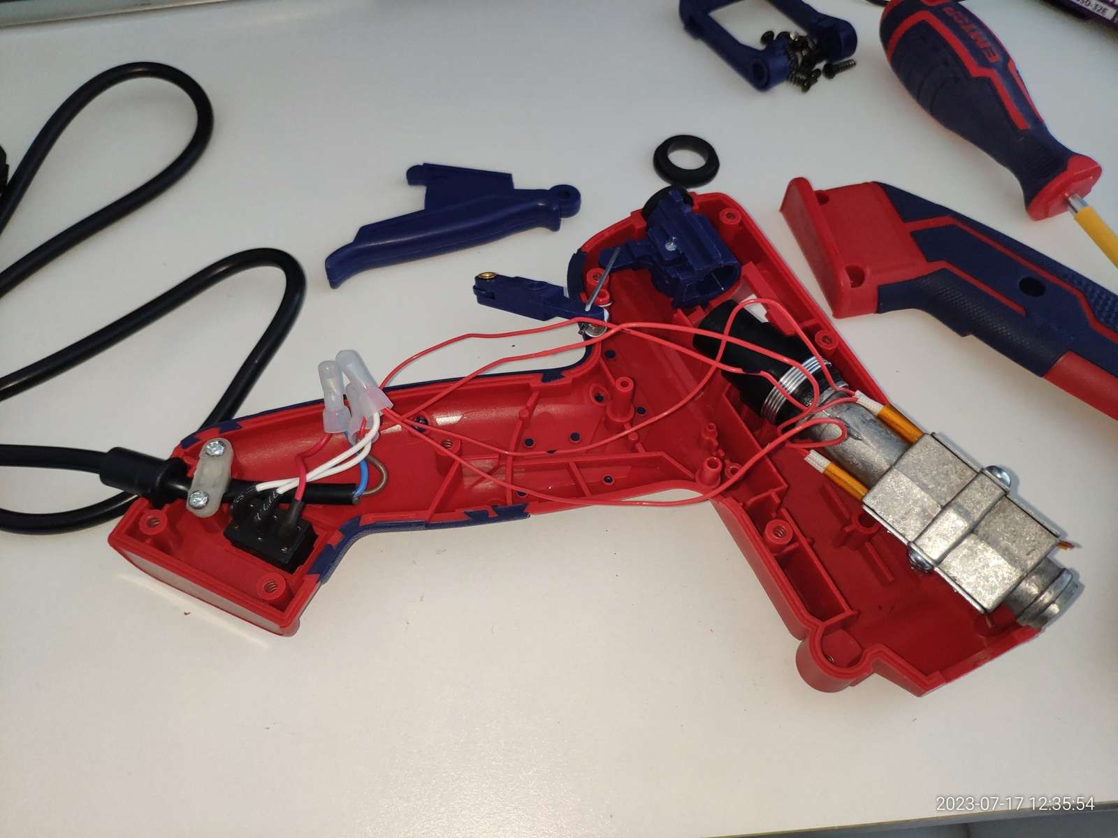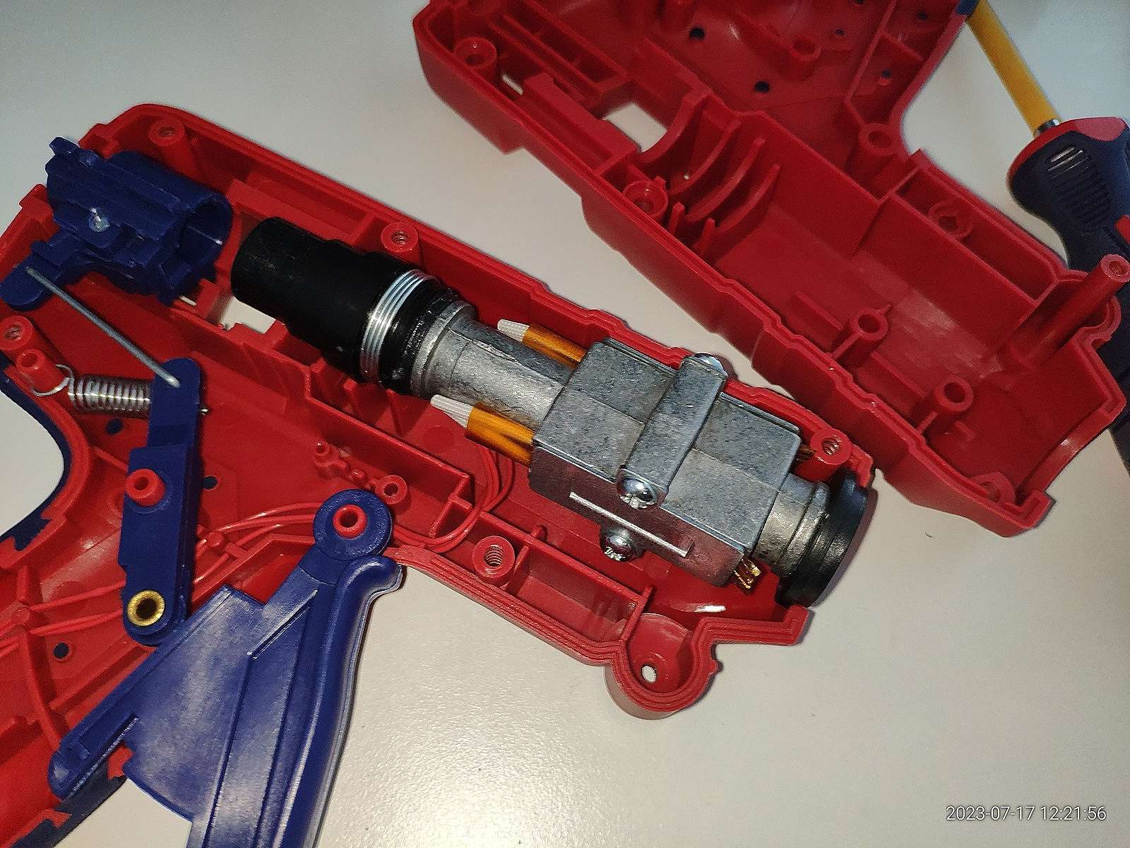 В общем ничего не взорвалось, пробоя на металлическое сопло нет, и это хорошо, можно заправлять термопластичный клей, и сразу же в дело вступают сальники: