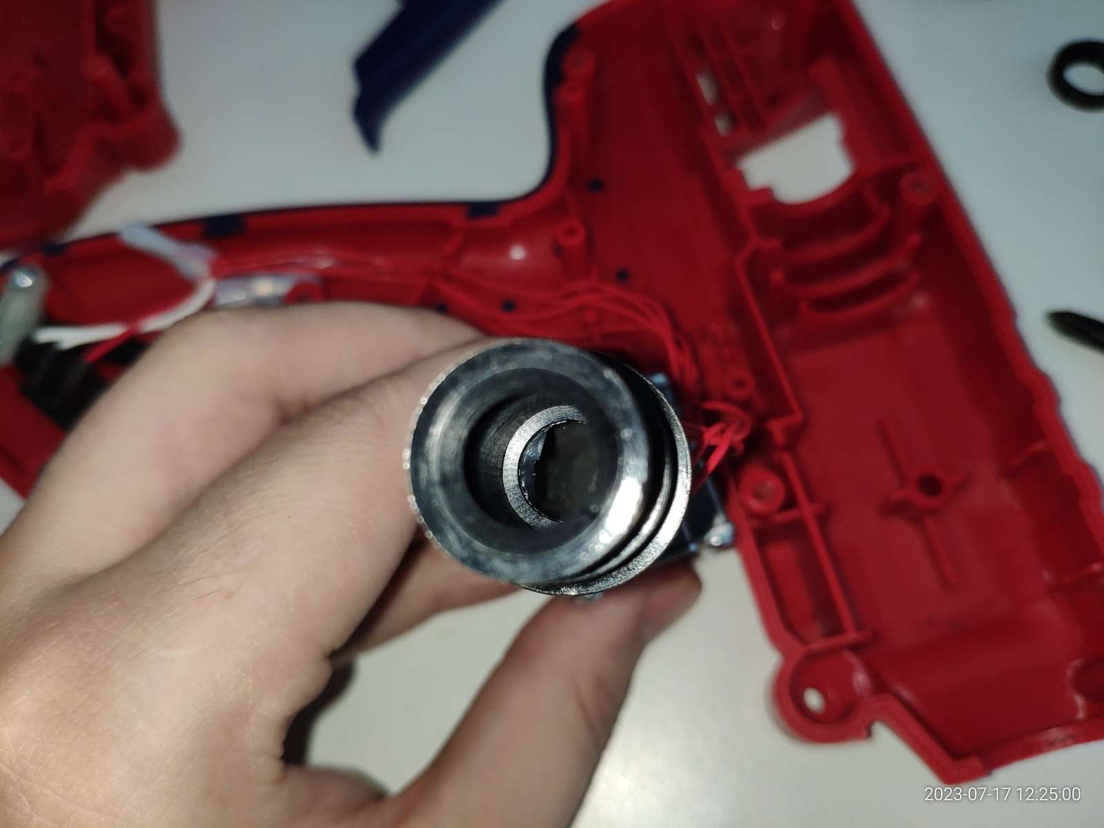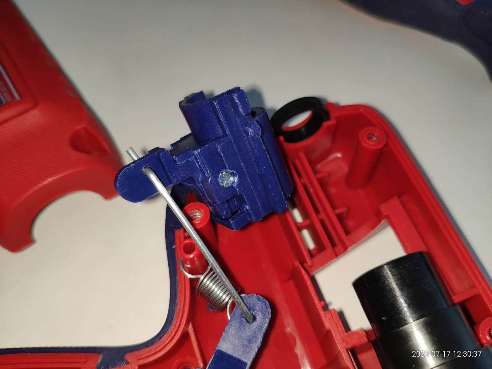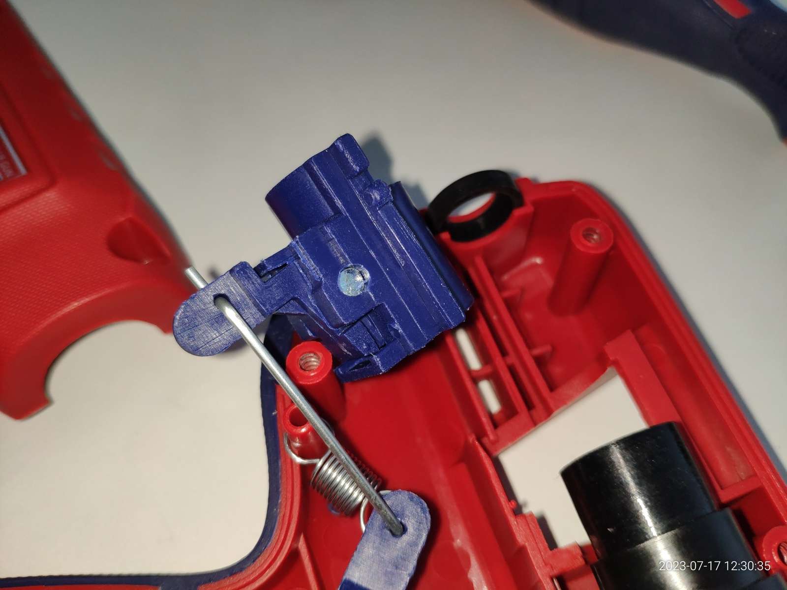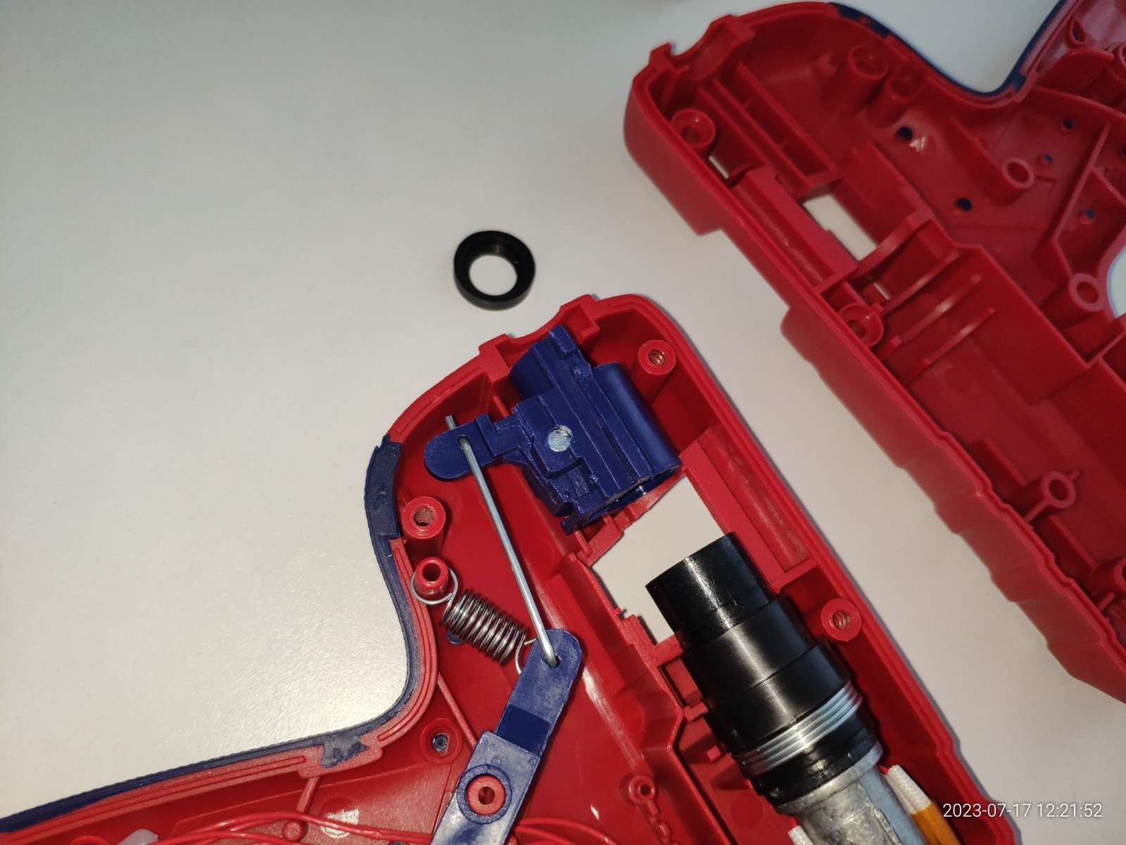 Канал ввода клея реализован силиконовым сальником, он прекрасно закреплён, я теперь уверен что клей не потечёт внутрь пистолета во время работы и не приведёт к замыканию чего-либо с последующим взрывом:
