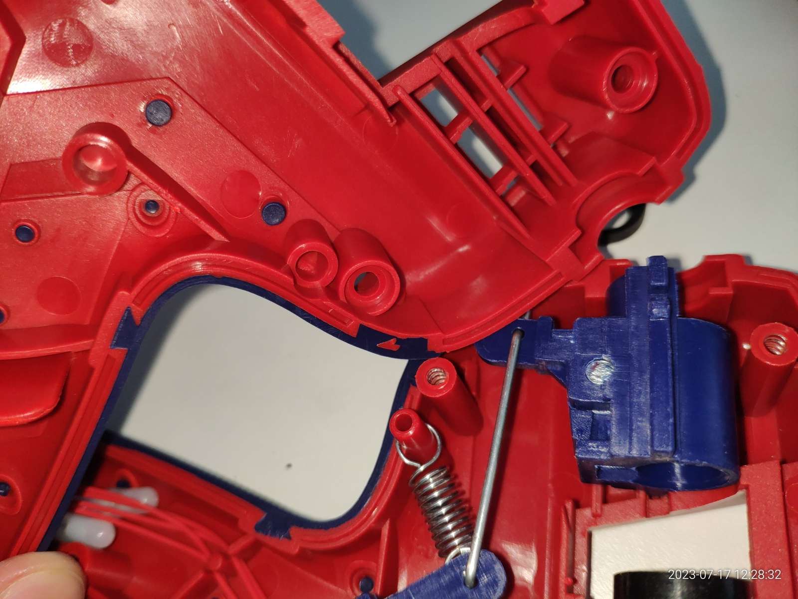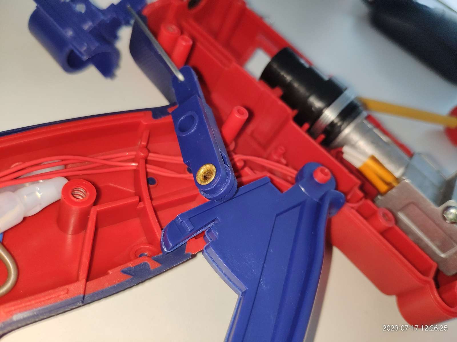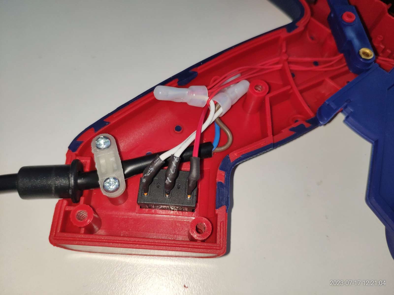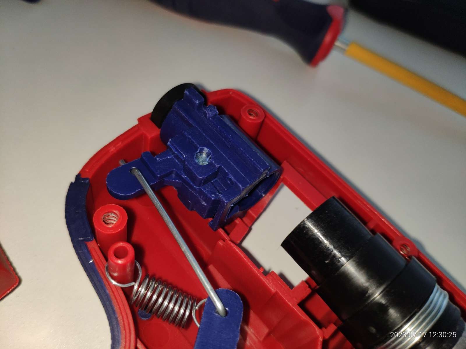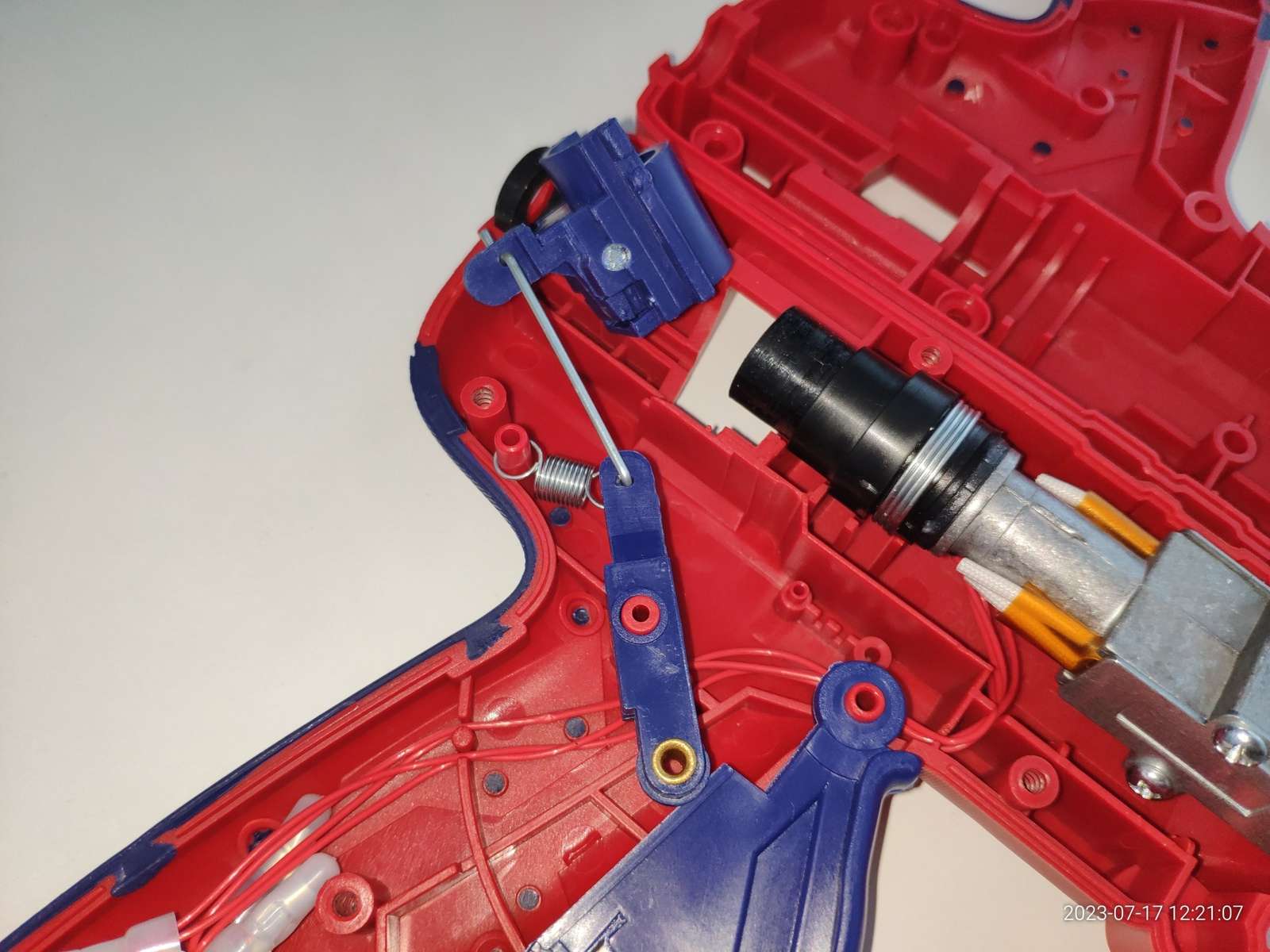 Канал ввода клея реализован силиконовым сальником, он прекрасно закреплён, я теперь уверен что клей не потечёт внутрь пистолета во время работы и не приведёт к замыканию чего-либо с последующим взрывом: