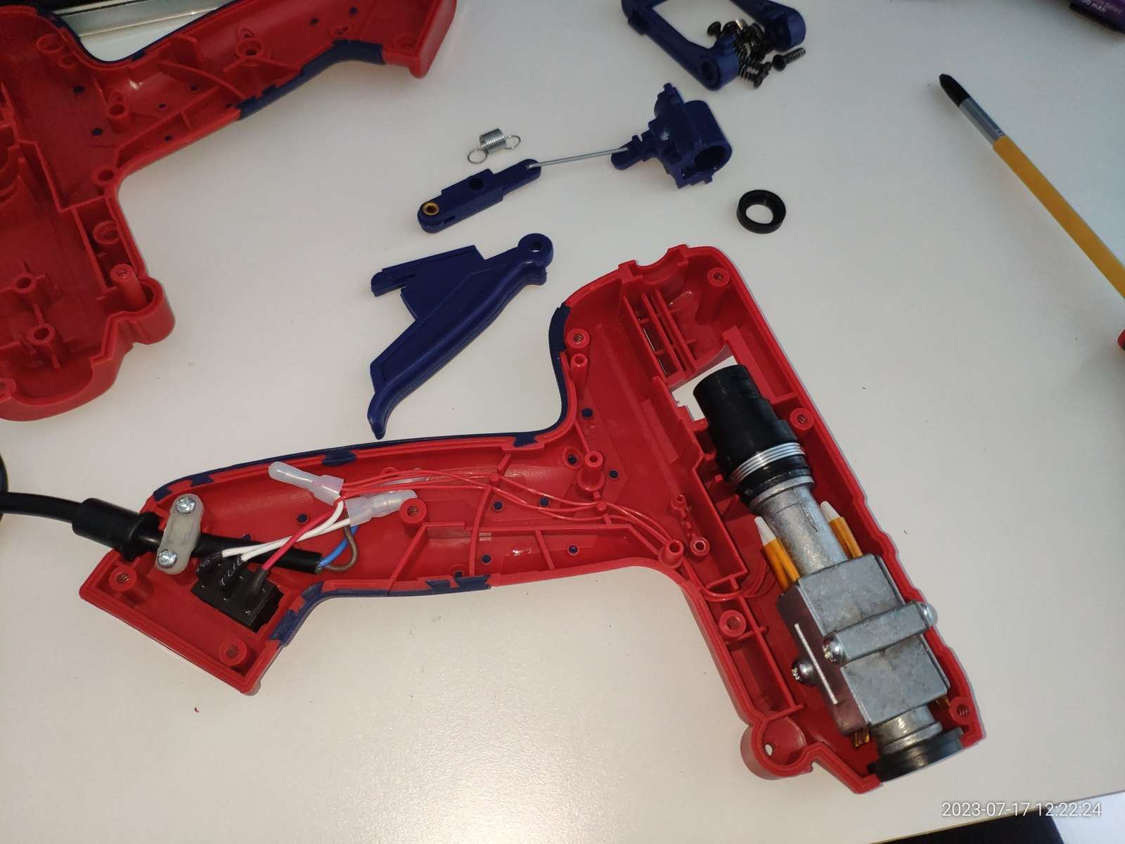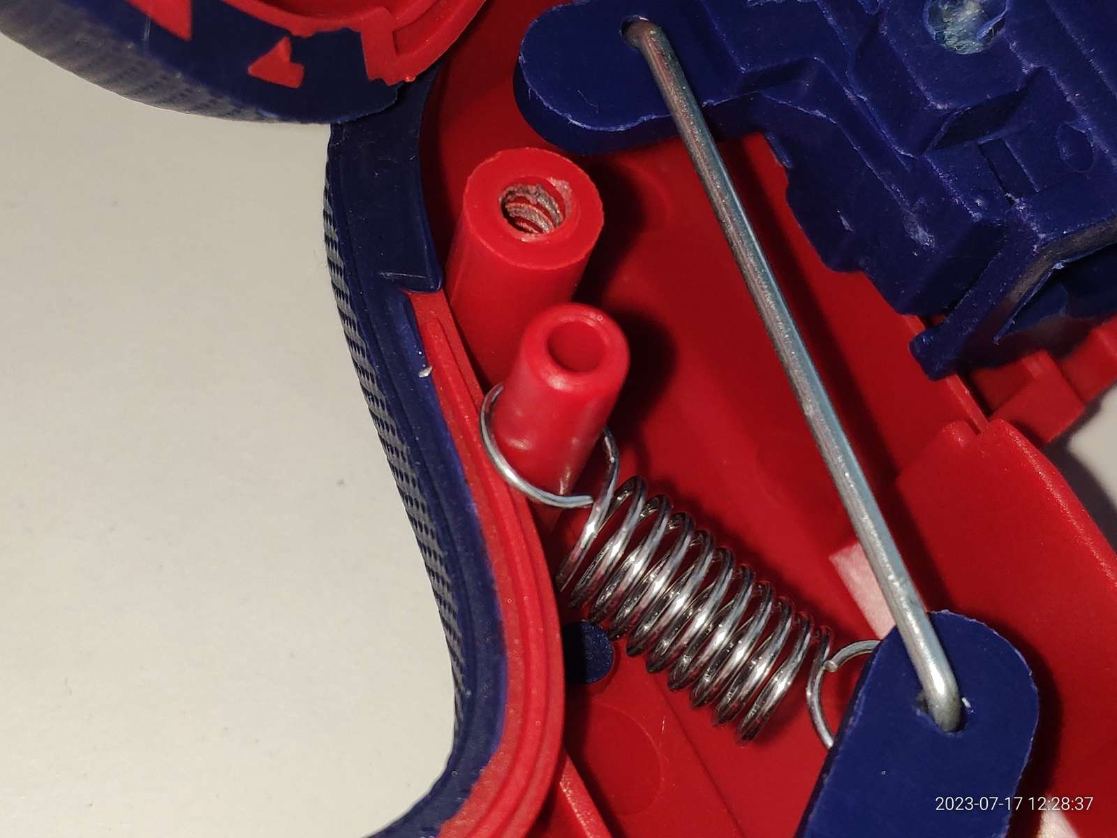 Внутри можно найти выключатель, механизм подачи клея, есть силиконовая прокладка необходимая для направления клеевого прута, она же предотвращает закусывание прутка об пластиковый корпус: