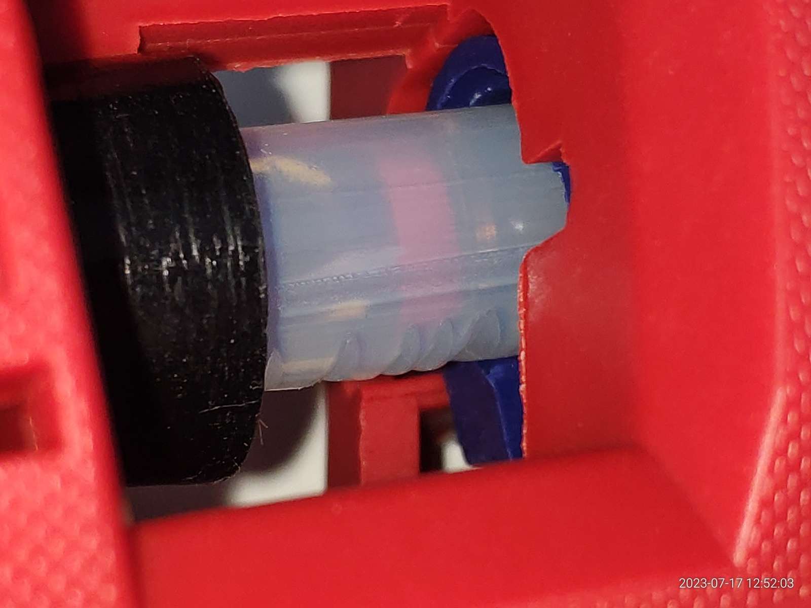 На клеевом стержне остались вмятины, это последствия работы механизма подачи, да, этот механизм при первом нажатии зажимает стержень, а при дальнейшем давлении уже зажатый стержень толкает вперёд, в итоге исключена такая ситуация как проскальзывание стержня при нажатии на рычаг: