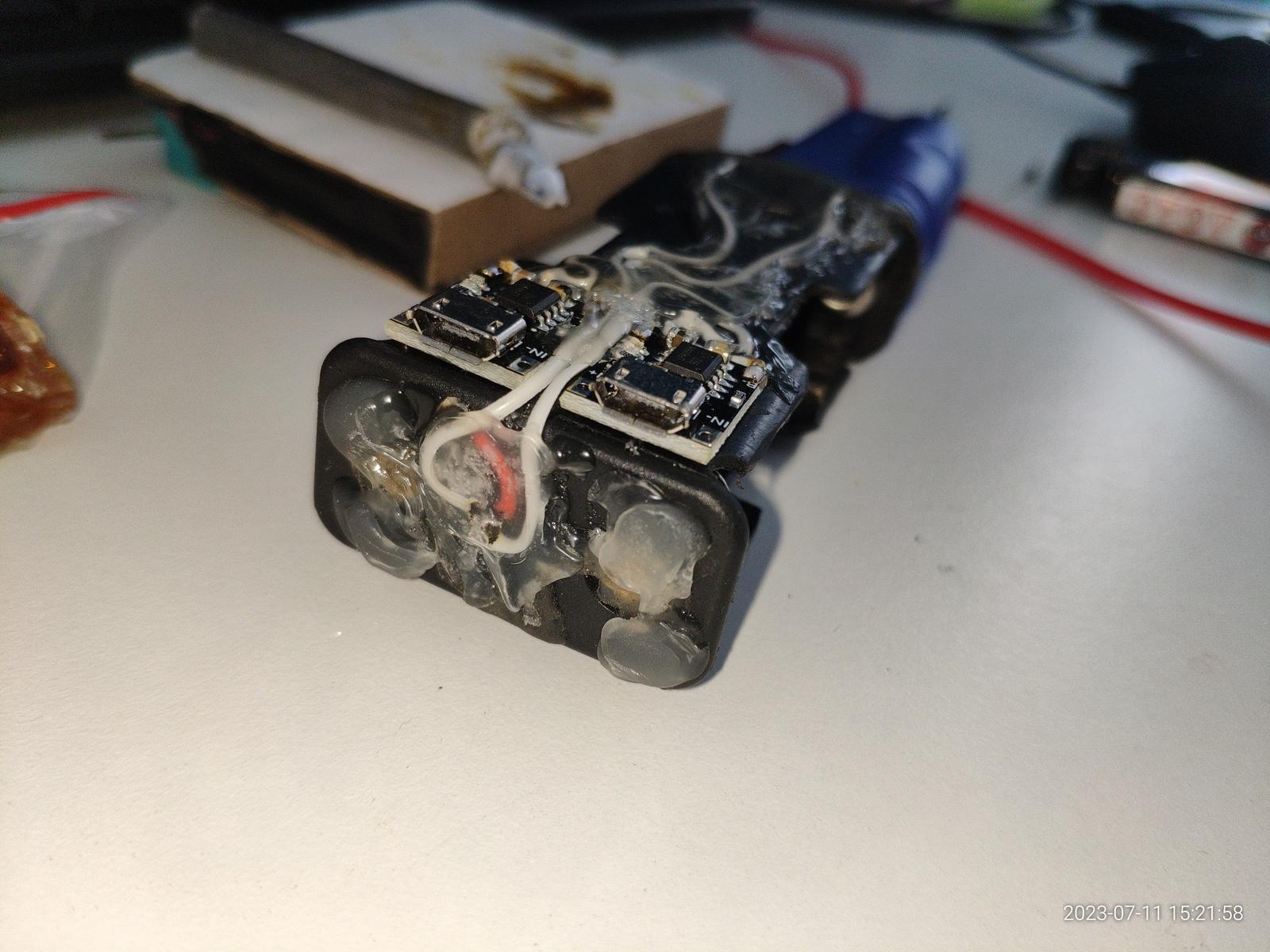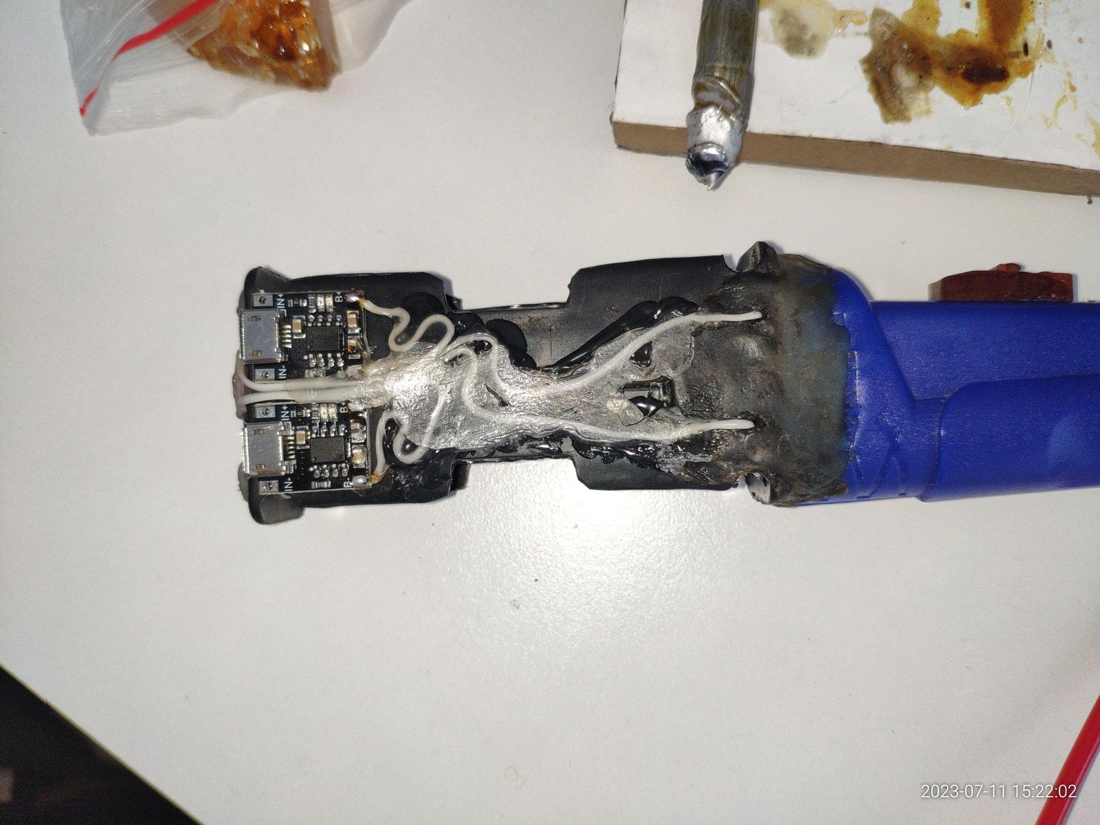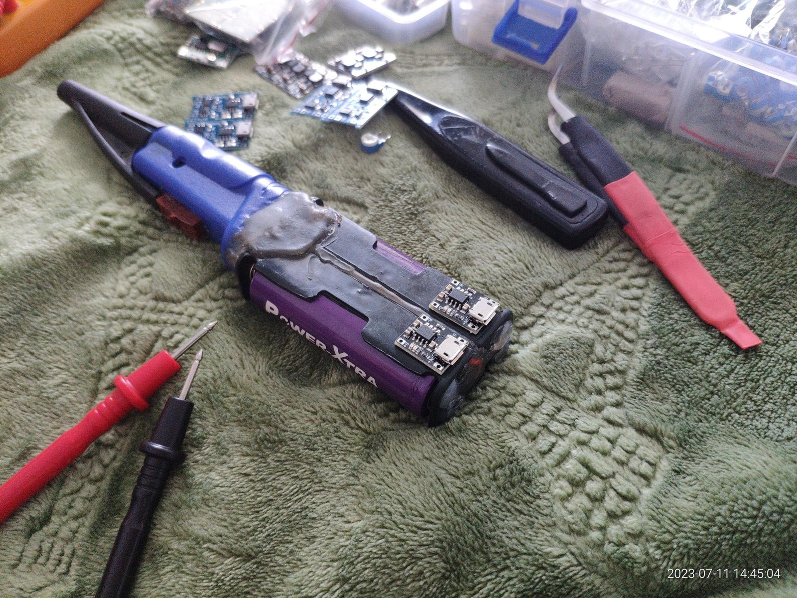 Теперь я смогу заряжать аккумуляторы пока они находятся прямо в паяльнике, само собой текущая схема подключения не позволит заряжать одновременно два аккумулятора, но мне это и не нужно сейчас, всё равно буду заряжать каждый аккумулятор по отдельности через USB тестер: