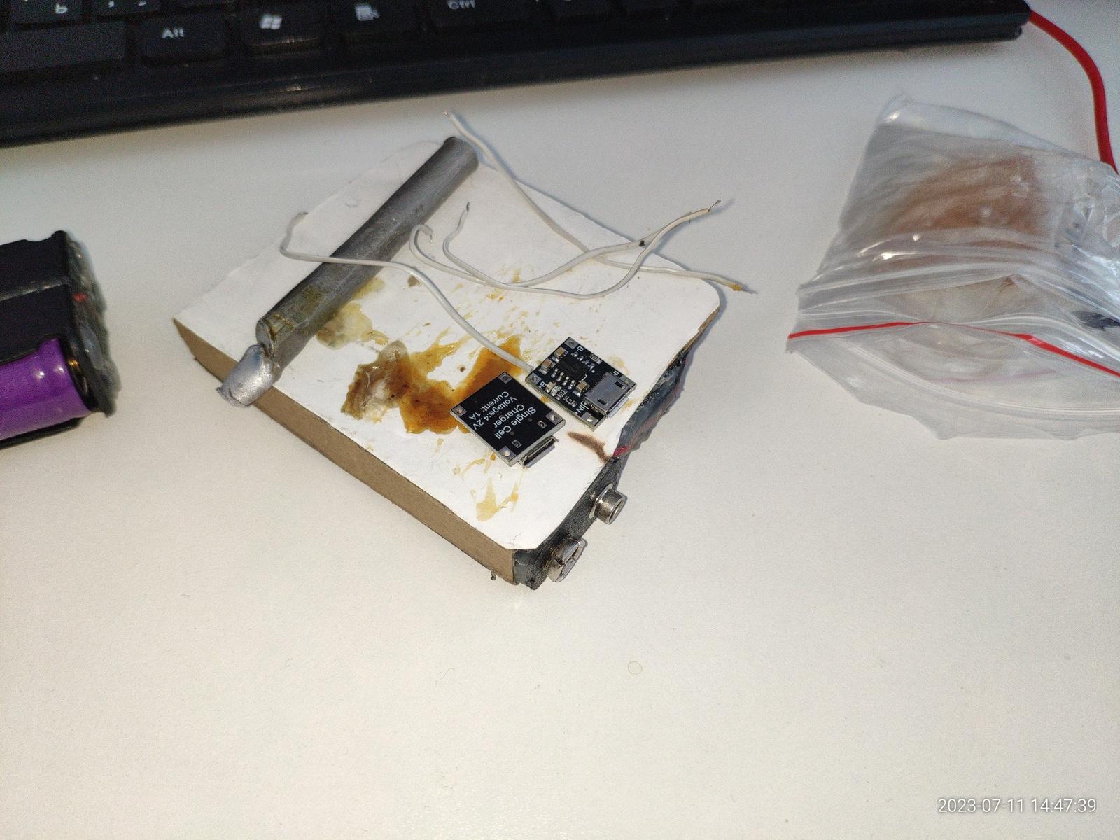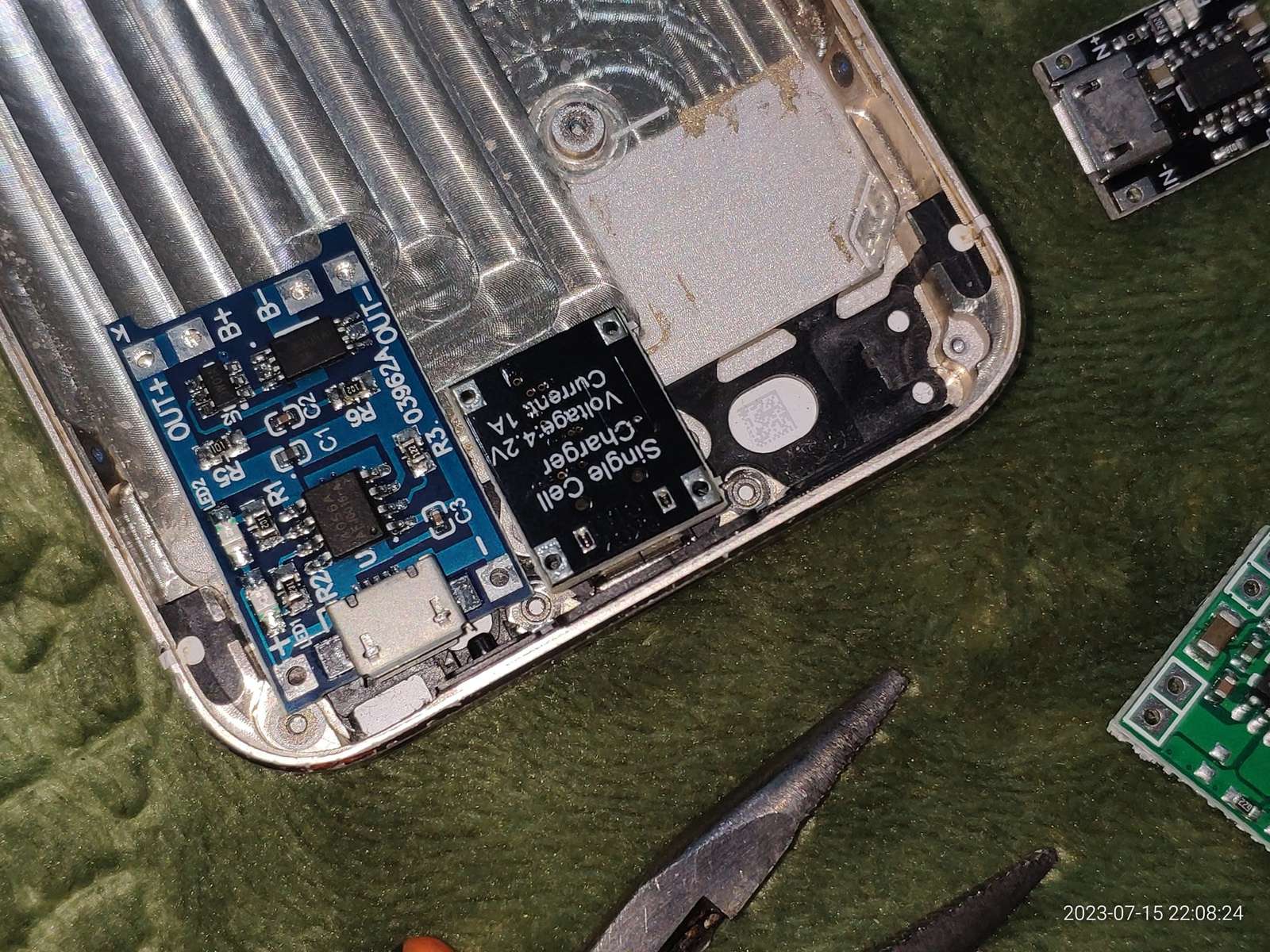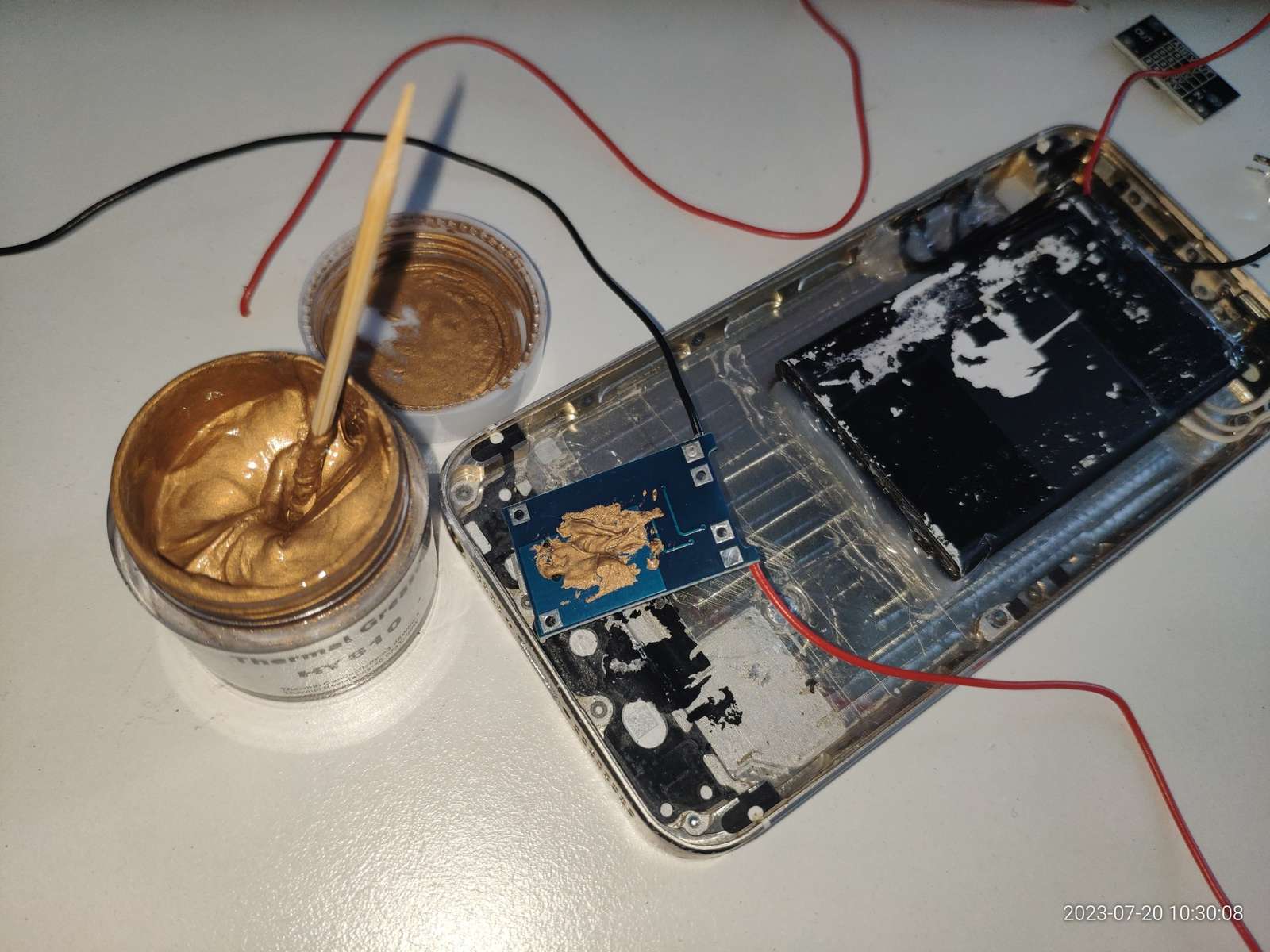 Чтобы полноценно изолировать корпус скотчем мне пришлось снять уже приклеенный контроллер зарядки, и с этого момента я решил установить более продвинутый контроллер с защитой аккумулятора от глубокого разряда, при этом намазал термопасту, чтобы улучшить отвод тепла на алюминиевый корпус при зарядке: