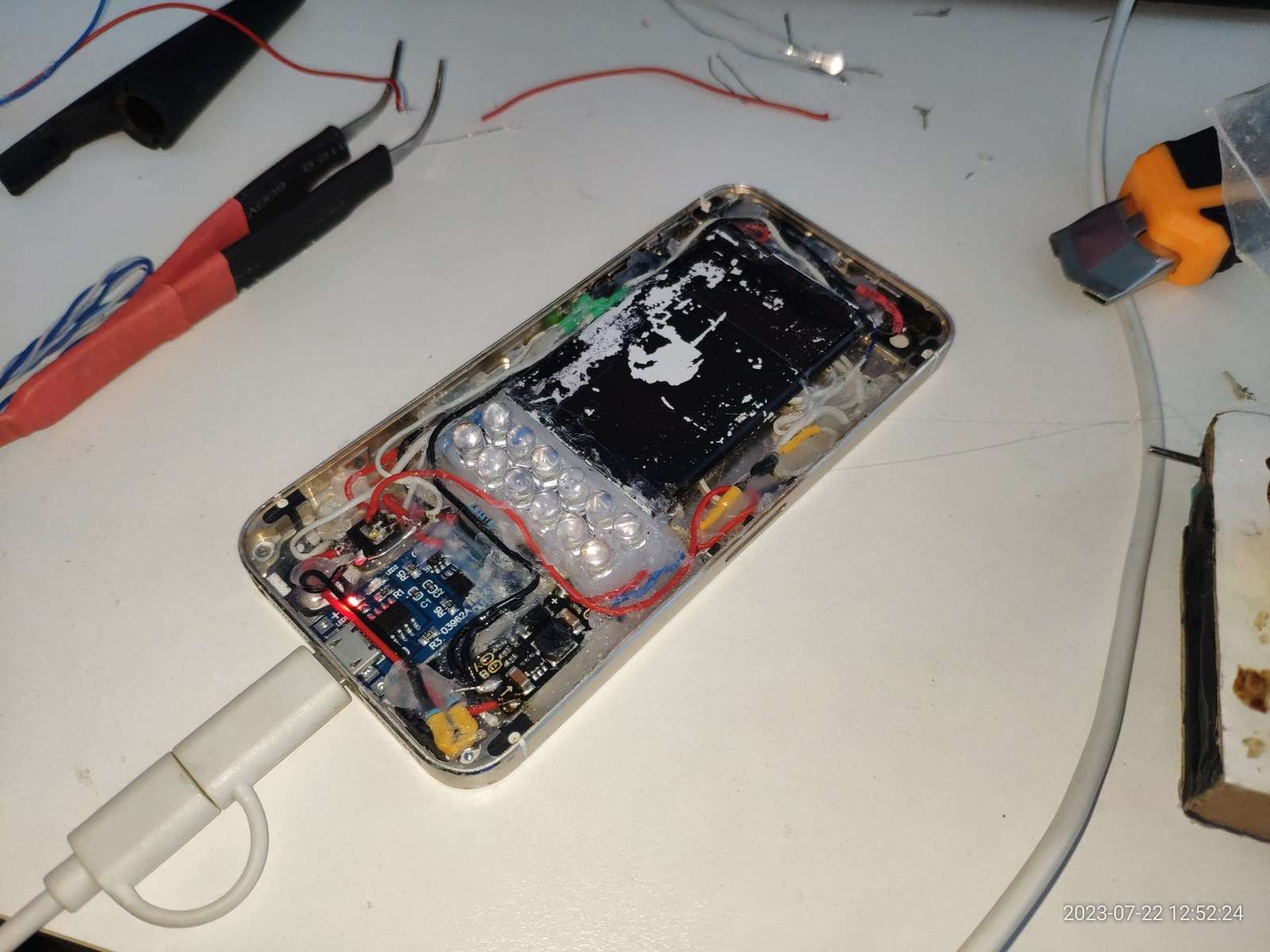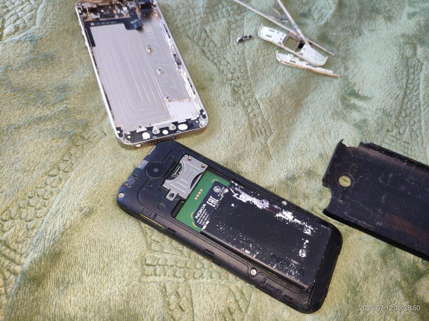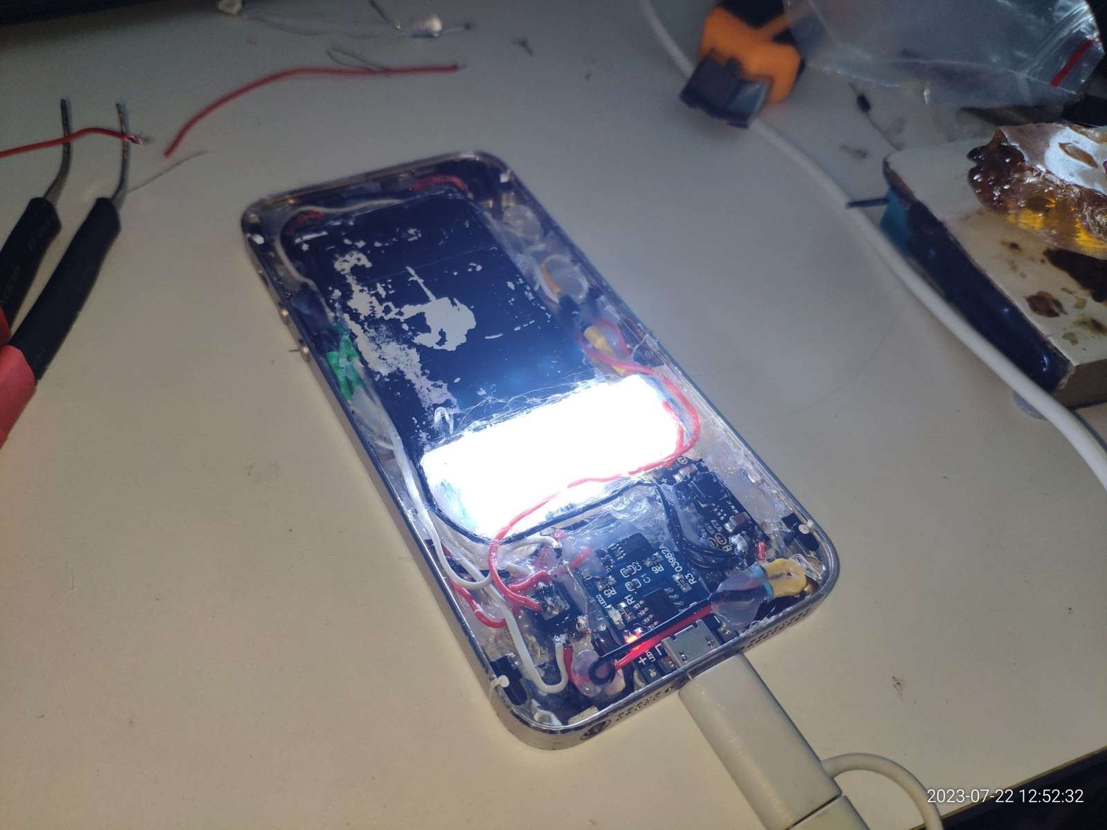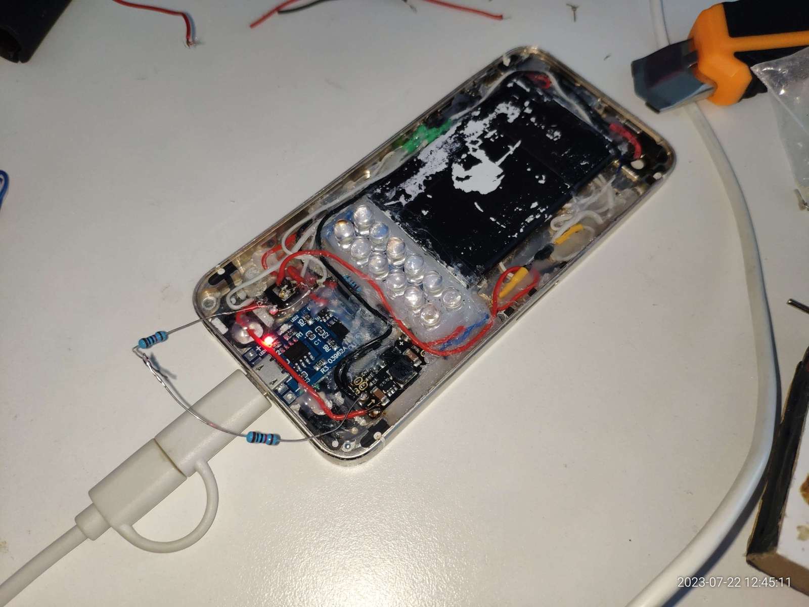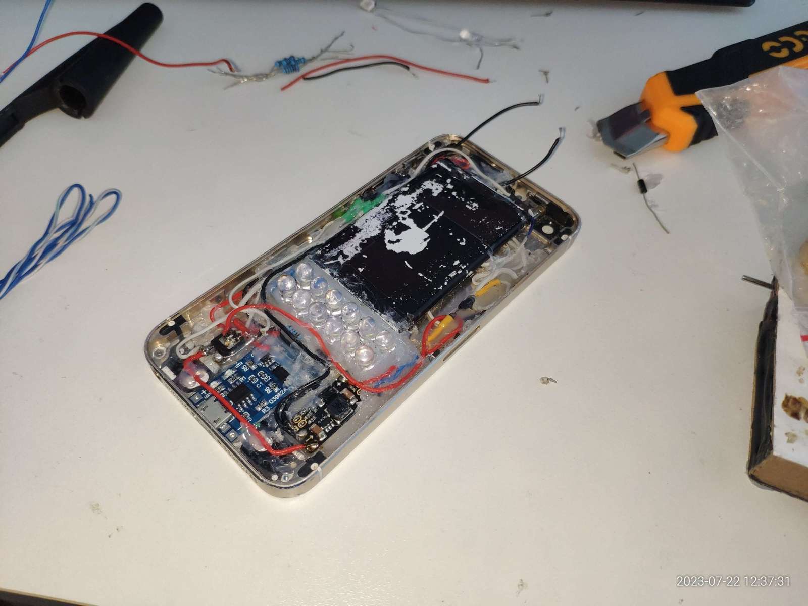 Потом я думал сделать фонарь из корпуса от iPhone, даже примерил аккумулятор от Nokia, за кадром уже открутил все лишние винтики и остатки от смартфона, но решил пока отложить данную затею: