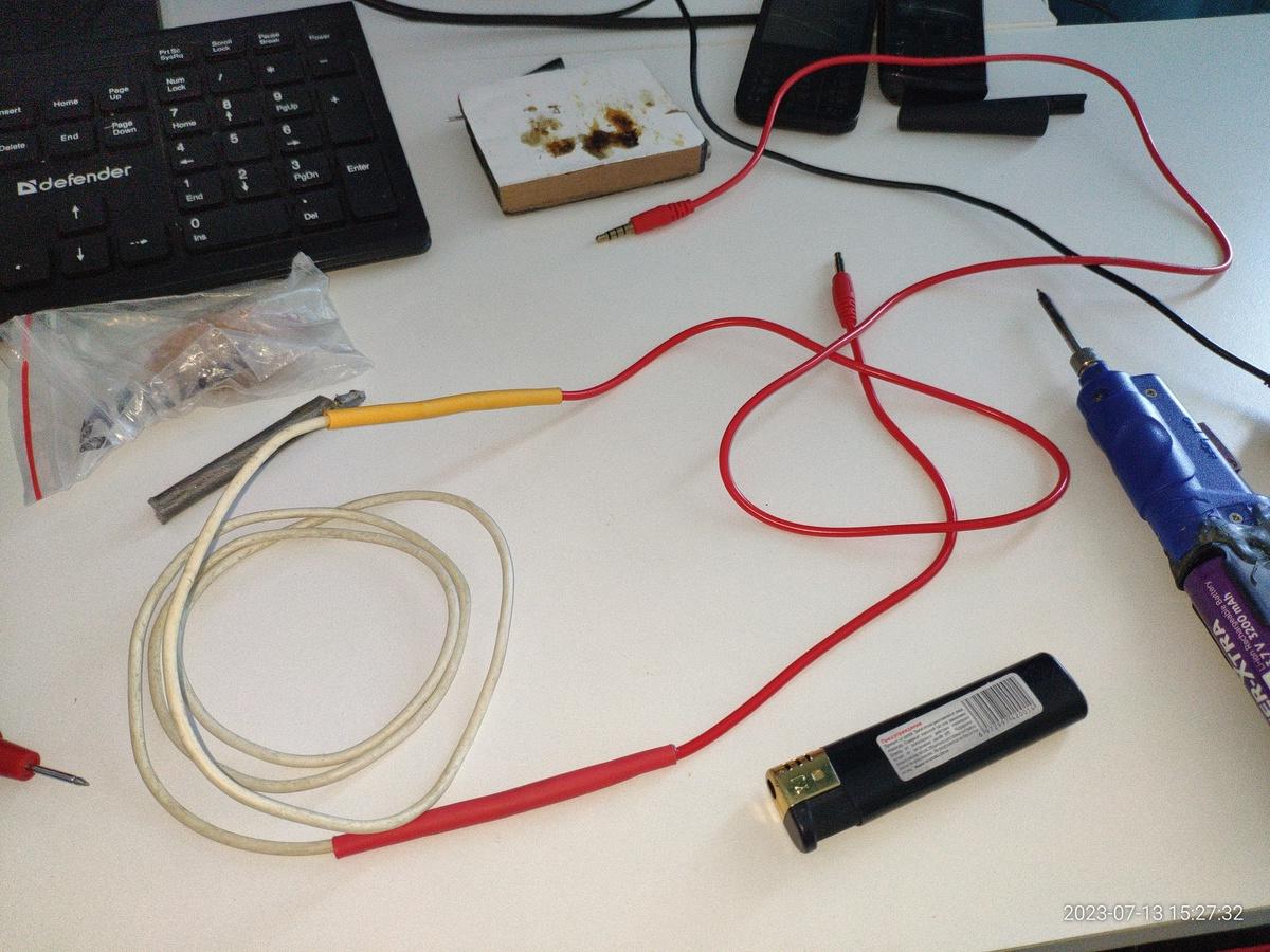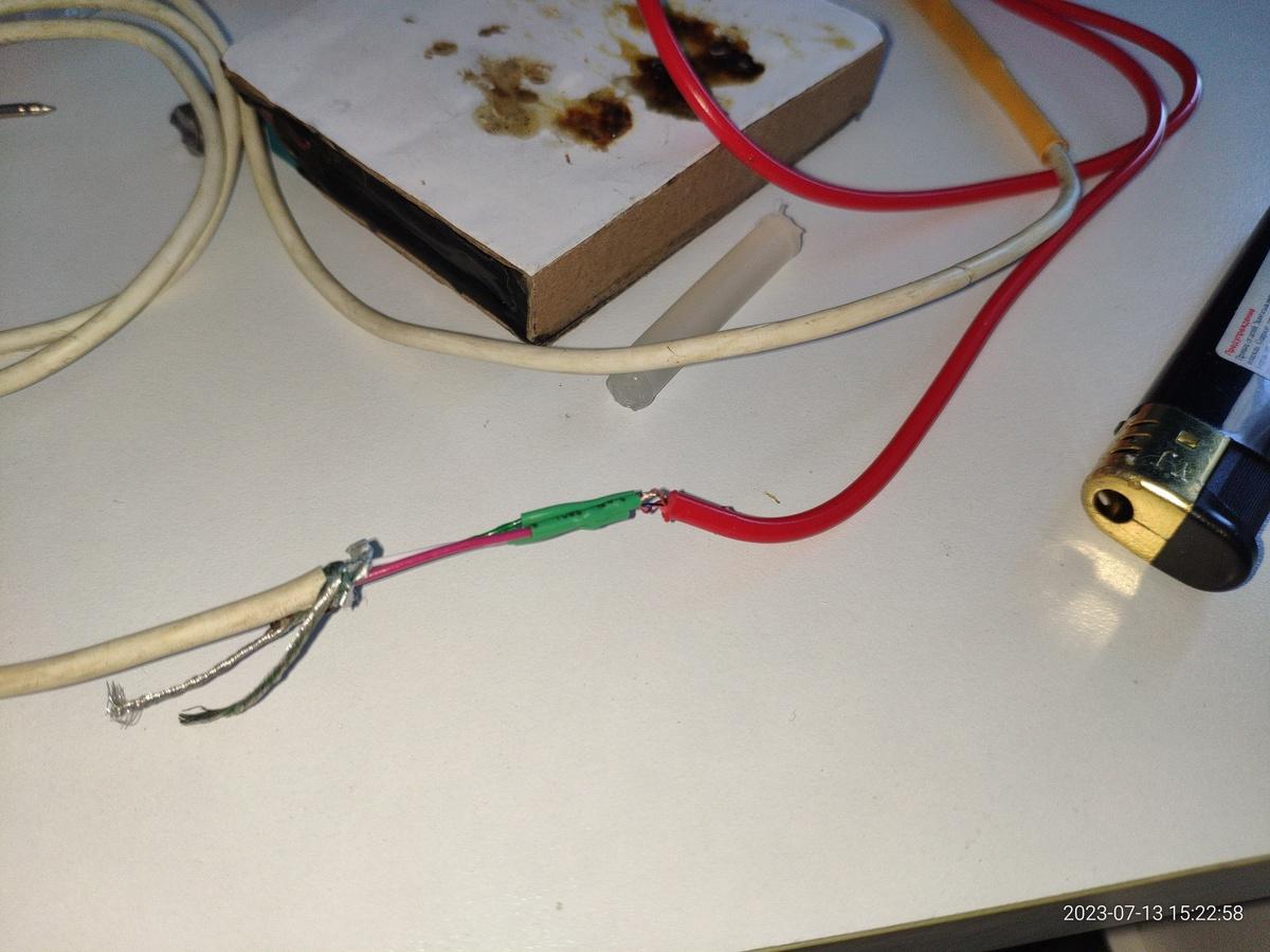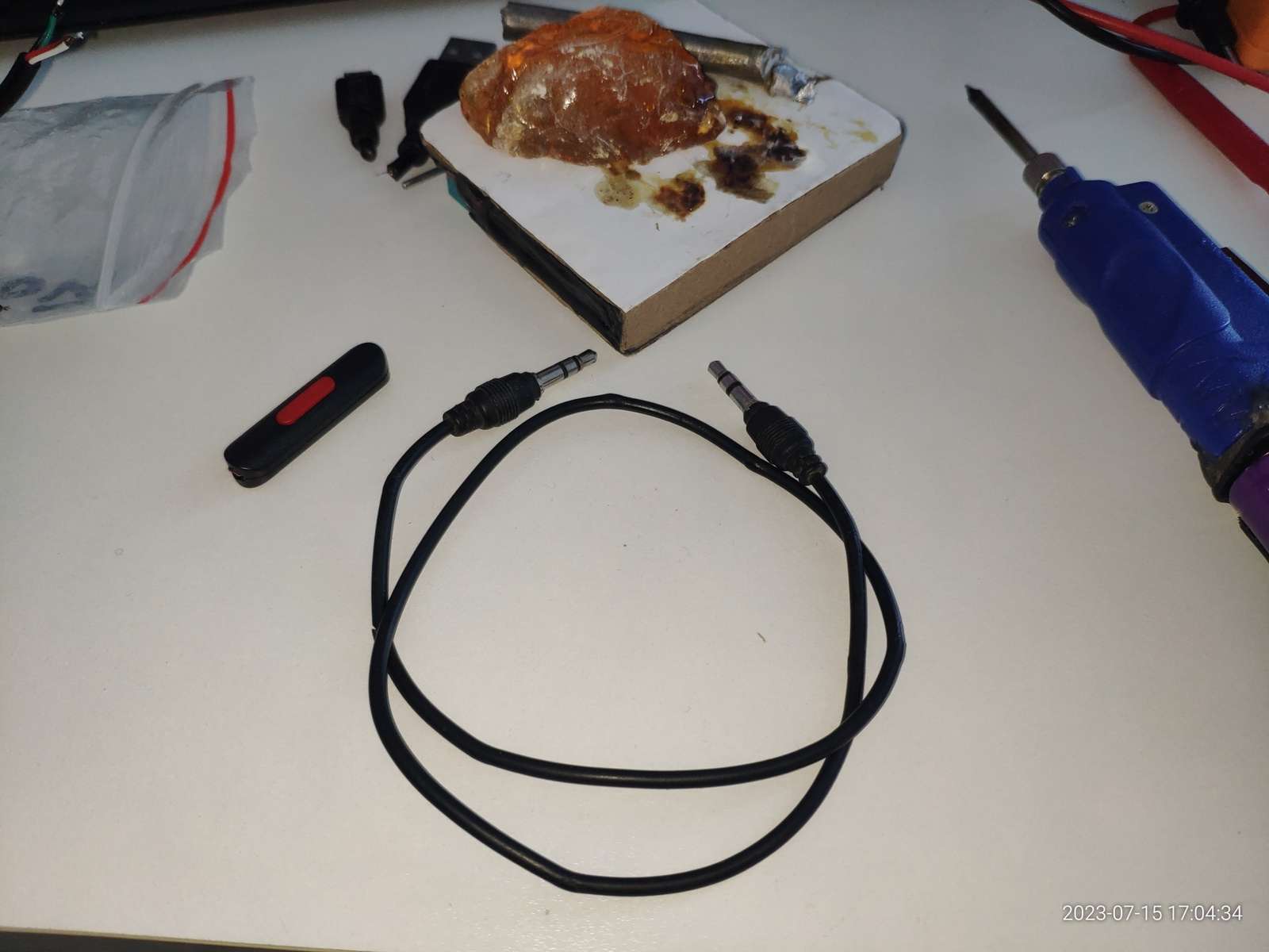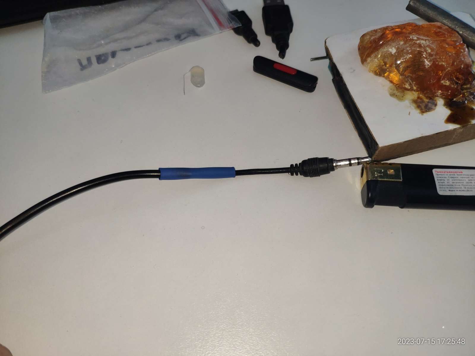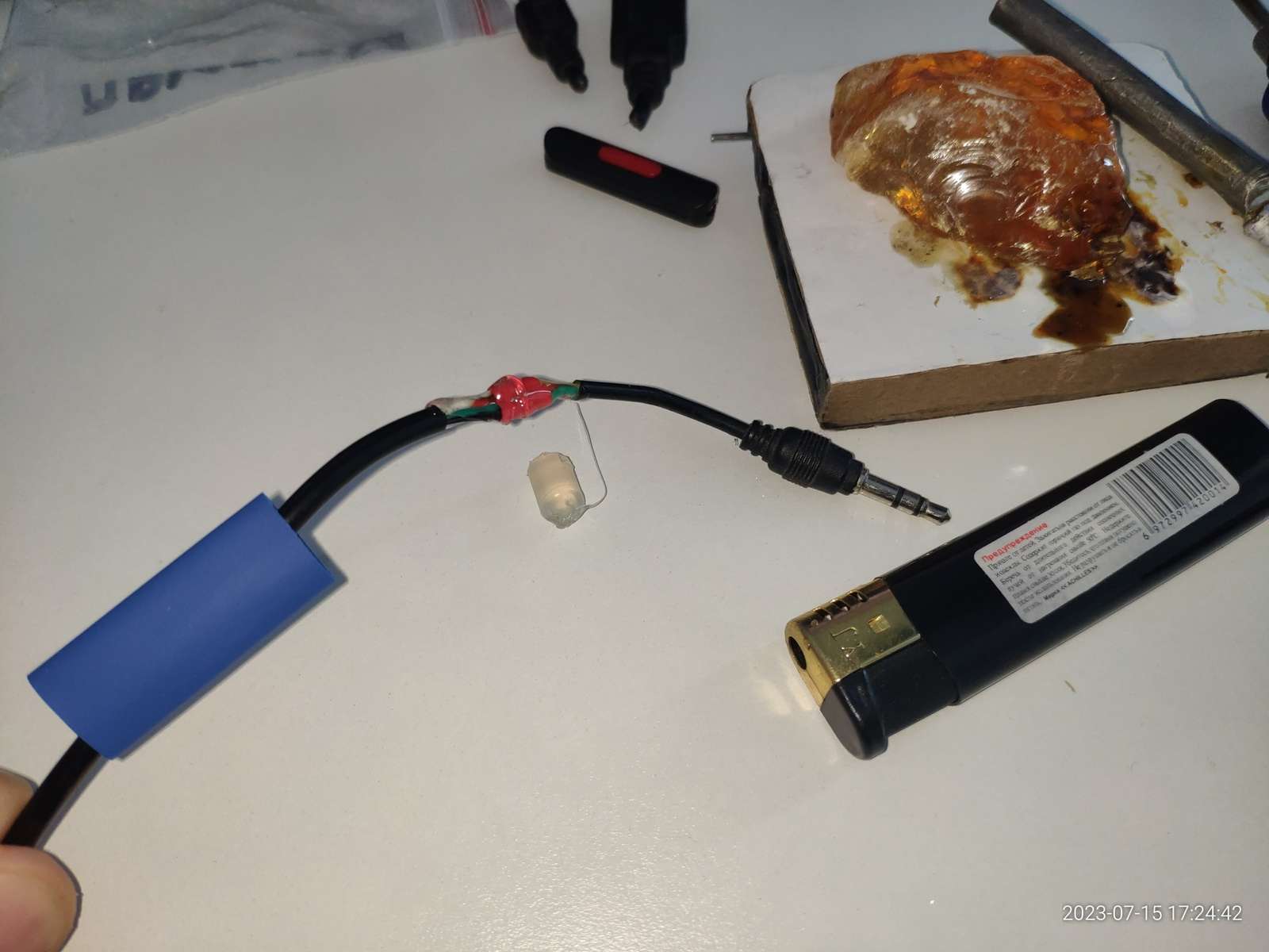 Ещё мне нужен 3.5 мм аудио штекер, у меня как раз есть поврежденный шнурок с двумя штекерами, сразу же спаиваю отрезки воедино, и похоже у меня закончился термо клей, нужно будет прикупить потом: